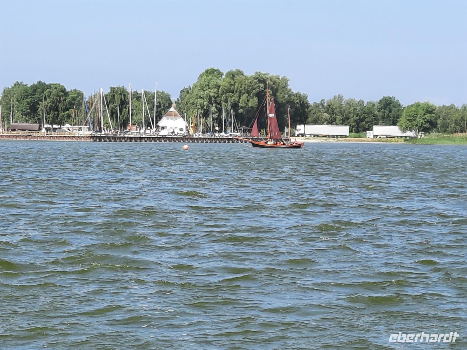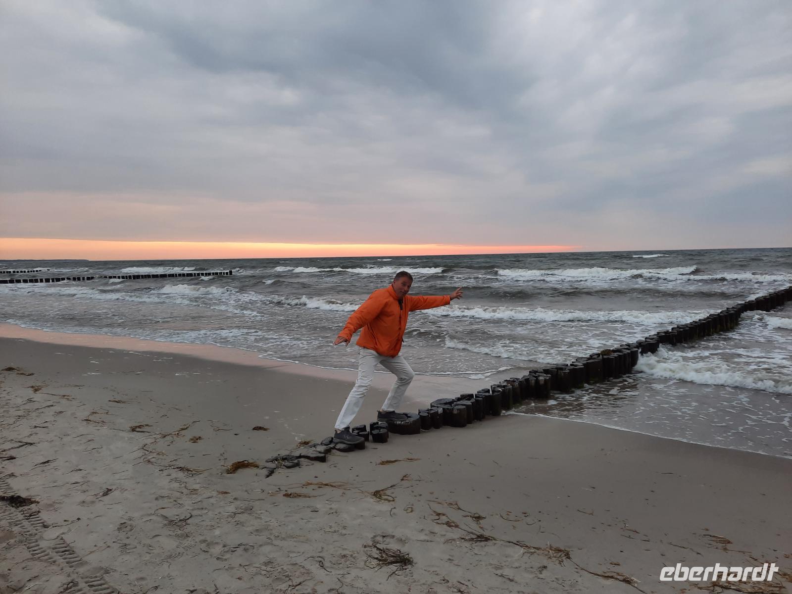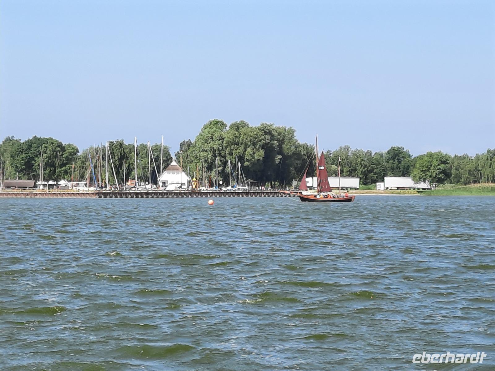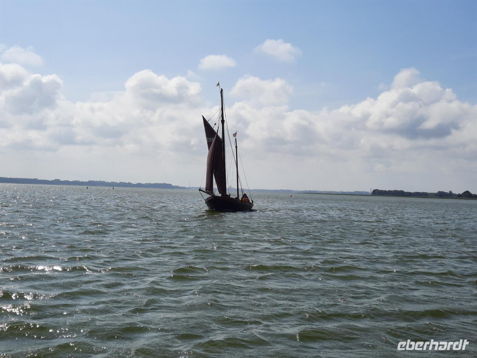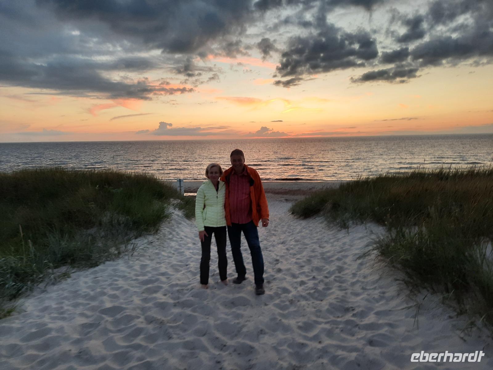 Heute war es nun soweit, denn unsere Zeesbootfahrt konnte stattfinden. Mit unserem Bus erreichten wir nach nur wenigen Fahrminuten den direkt am Saaler Bodden gelegenen Hafen von Dierhagen-Dorf, wo zwei traditionelle Zeesboote mitsamt Kapitänen auf uns warteten. Einigen war etwas mulmig zumute, denn der Wind wehte ziemlich kräftig... Man erklärte uns dann später, dass es auf dem Bodden unmöglich sei, seekrank zu werden und dies nur auf hoher See passieren könnte. Also waren wir beruhigt und konnten diese Segelbootsfahrt in vollen Zügen genießen. Mit Zeesbooten wurden immerhin noch bis in die 1970er Jahre hinein auf den Vorpommerschen Boddengewässern gefischt und das Schlepp- bzw. Treibnetz, die sog. "Zeese", gab dem Boot seinen Namen. Wir ließen uns treiben und schipperten ca. 90 Minuten im Bodden umher. Ein wirklicher Höhepunkt der Reise und auch die Sonne zeigte sich heute wieder ab und an in ihrer vollen Pracht. Nach diesem tollen Erlebnis hatten wir zudem die Möglichkeit zum Besuch des kleinen Dierhäger Hafenmarktes, wo man sämtliche regionale Spezialitäten angeboten bekommt. Anschließend fuhren wir voller Vorfreude auf unsere letzte Wanderung in das nur wenige Kilometer entfernte Wieck a. Darß. Der Ortsname leitet sich übrigens von einem niederdeutschen Wort für Bucht ab und bezieht sich auf die Lage in einer Bucht. Wir starteten unsere heutige Wanderung am Parkplatz Darßer Arche, einem informativen Ausstellungsgebäude über die Entstehung der Landschaft des Nationalparks Vorpommersche Boddenlandschaft. Von hier aus wanderten wir entlang des Boddens nach Born. Dort kamen wir unter anderem auch am Forst- und Jagdmuseum vorbei, welches dem ehemaligen Förster Ferdinand von Raesfeld gewidmet ist, der sich um die Aufforstung des Darßwaldes verdient gemacht hatte. Zudem sahen wir hier eine große Anzahl wunderschöner traditioneller Darß-Häuser mit den typischen, meist bunt bemalten Darßer Haustüren. Sie erinnern an die goldenen Jahre der Segelschifffahrt Mitte des 19. Jahrhunderts und manche Motive nehmen daher auch direkten Bezug auf die Seefahrt. Ganz typisch ist die Mischung sehr alter (oft auch heidnischer) volkstümlicher Motive mit klassizistischen Elementen. Fast alle alten Türen zeigen außerdem Symbole zum Schutz des Hauses vor ungünstigen Einflüssen, wie zum Beispiel Blitzschlag, Feuer oder Zauberei. Neben Tulpensträußen und Blüten sind auch Sonnenmotive sehr beliebt. Einmal als Zeichen für Licht, Leben und Wärme, aber früher wohl auch aufgrund der Rolle beim Navigieren der Schiffe. Mittlerweile war die Mittagszeit fast vorbei und so legten wir kurzerhand am Hafen in Born unsere Mittagspause ein. Ein Fischbrötchen, eine Currywurst oder auch ein Eis - die Auswahl war ganz unterschiedlich! Derart gestärkt wanderten wir in den südlichen Teil des Darßer Waldes hinein. Dies war das Jagdrevier der Herrschenden und wir folgten nun dem Ibenhorster Weg. Der Name "Ibenhorst" erinnert übrigens an die Eiben, die einst im Darßer Wald standen. Heute gibt es davon nur noch wenige Exemplare. Eiben wachsen langsam, ihr festes, schön gemasertes Holz war begehrt und fand u. a. als Innenraumvertäfelung in den dänischen Schlössern Amalienborg und Rosenborg Verwendung, wo man es noch heute bewundern kann. Zu guter Letzt unternahmen wir noch einen kleinen Abstecher zum wilden Weststrand. Es sind hier wirklich nur ein paar Schritte von mitten im Wald bis an den Strand...! Am benachbarten Parkplatz "Drei Eichen" stand dann schließlich nach 14,7 Wander-Kilometern unser Buschauffeur Jörg mit dem Bus bereit und brachte uns zum Hotel zurück. Nun hatten wir noch die Gelegenheit zu einem Bad in der Ostsee, bei einer Wassertemperatur von 20 Grad durchaus zumutbar. Bereits vor dem letzten gemeinsamen Abendessen mit leckeren Spezialitäten vom Buffet trafen wir uns nochmals zu einer kleinen herzlichen Abschiedsrunde im Hotelgarten. Wie schnell doch die Tage vorüber waren... Fazit: ES WAR EINE TOLLE ZEIT!!!