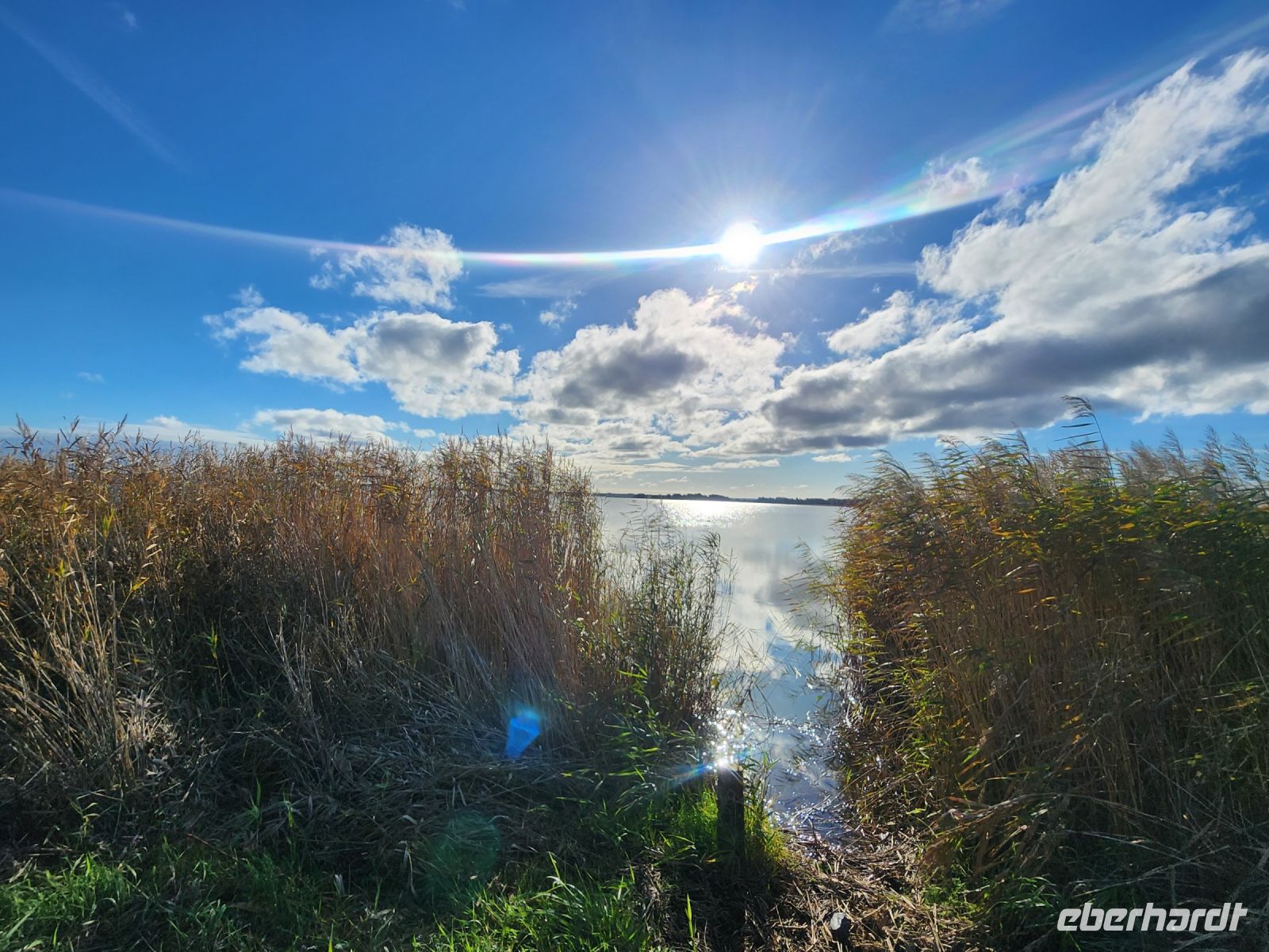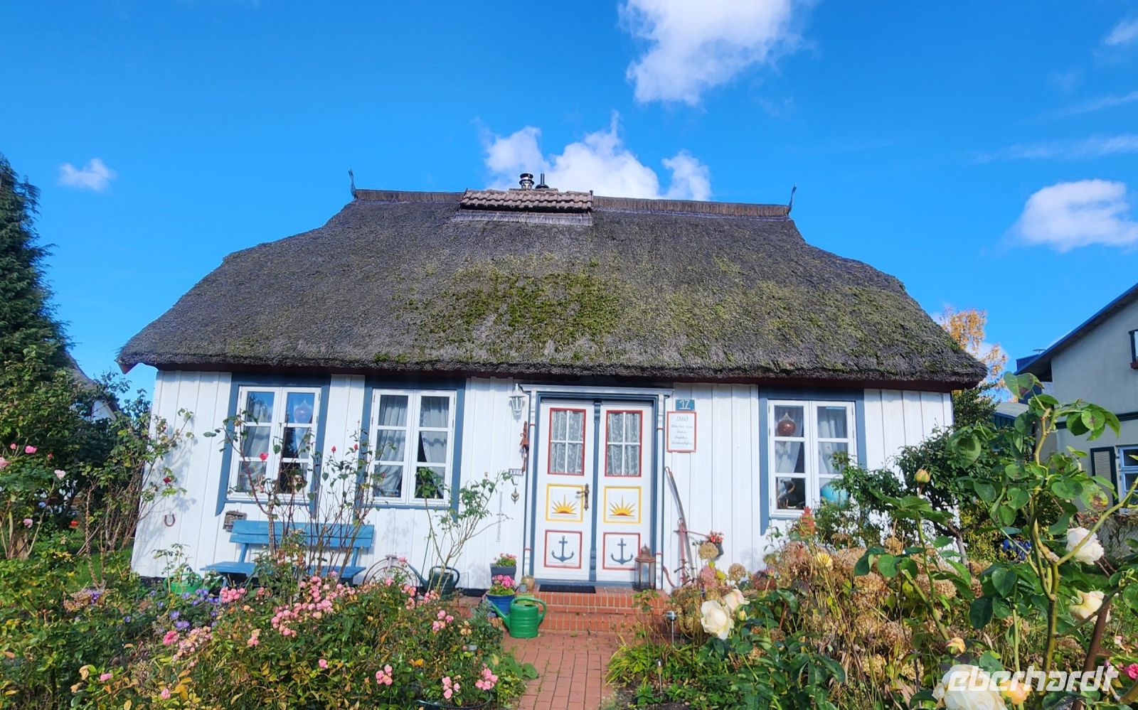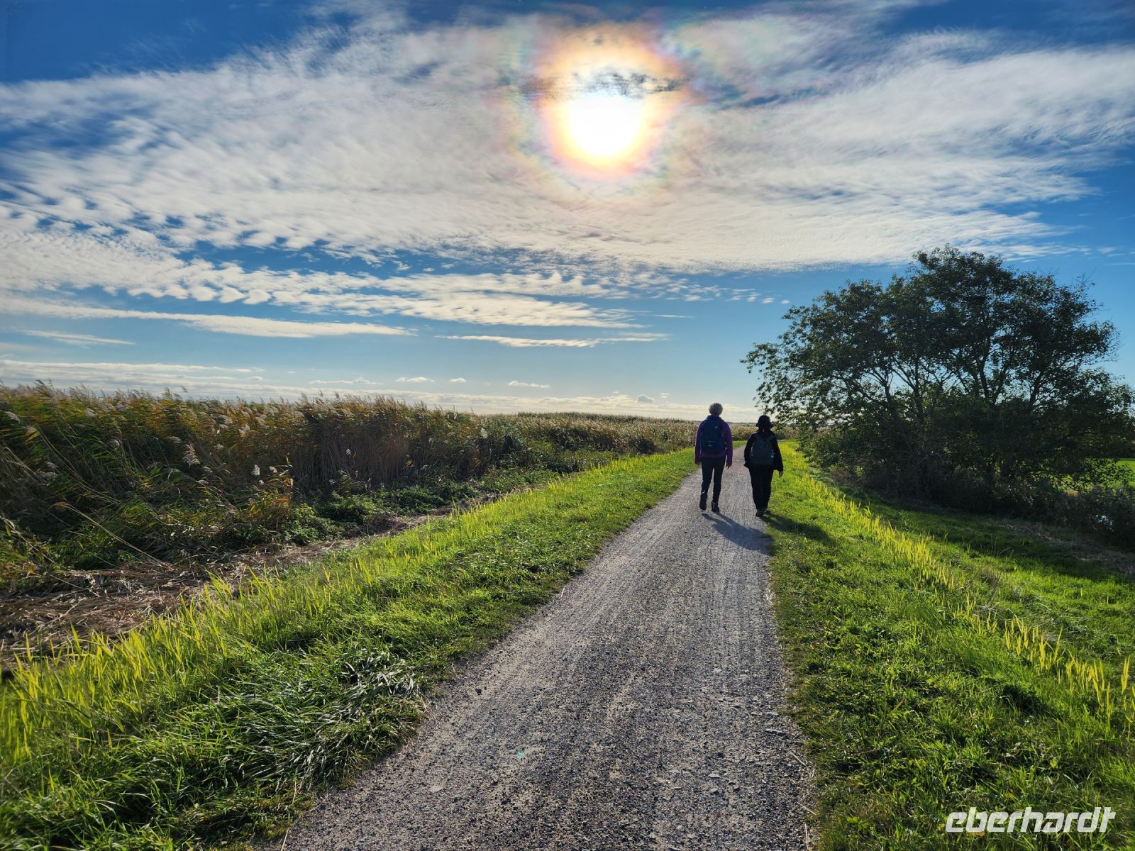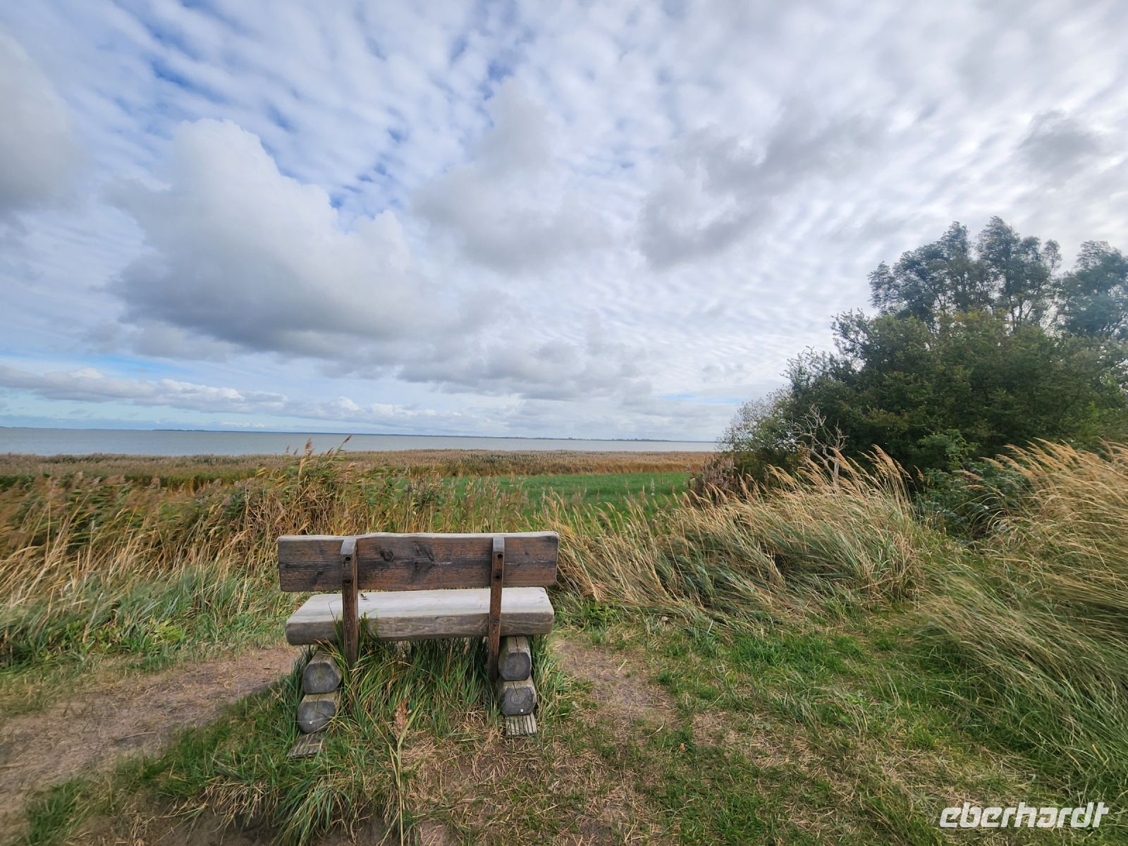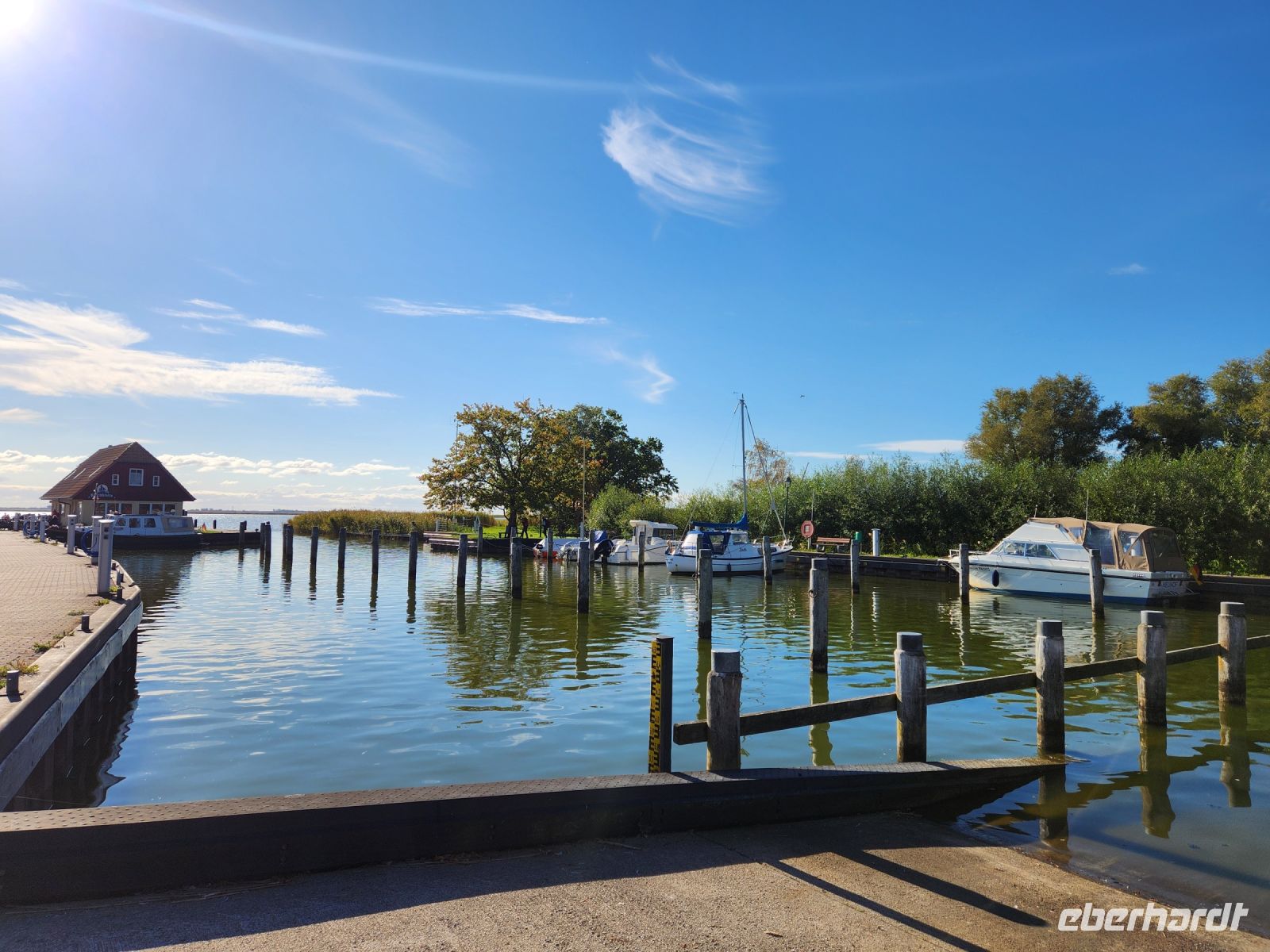Schon am Morgen begrüßt uns ein blauer Himmel, alle sind sehr gut gelaunt und freuen sich auf die zweite Wanderung. Heute bleiben wir den ganzen Tag auf der Boddenseite. Wir starten im ruhigen Wiek am Darß, nachdem wir die Ortsmitte verlassen haben, wartet nur noch idyllische Boddenlandschaft auf uns. Wir durchqueren auch ein kleines Waldstück und laufen dann lange Zeit am Schilfgürtel entlang, bis wir den Ortsrand von Born am Darß erreichen. Wir bleiben oft vor den hübschen, alten Häusern stehen, machen immer wieder Erinnerungsfotos und staunen über die hübschen Motive auf den handgeschnitzten Darßer Türen.