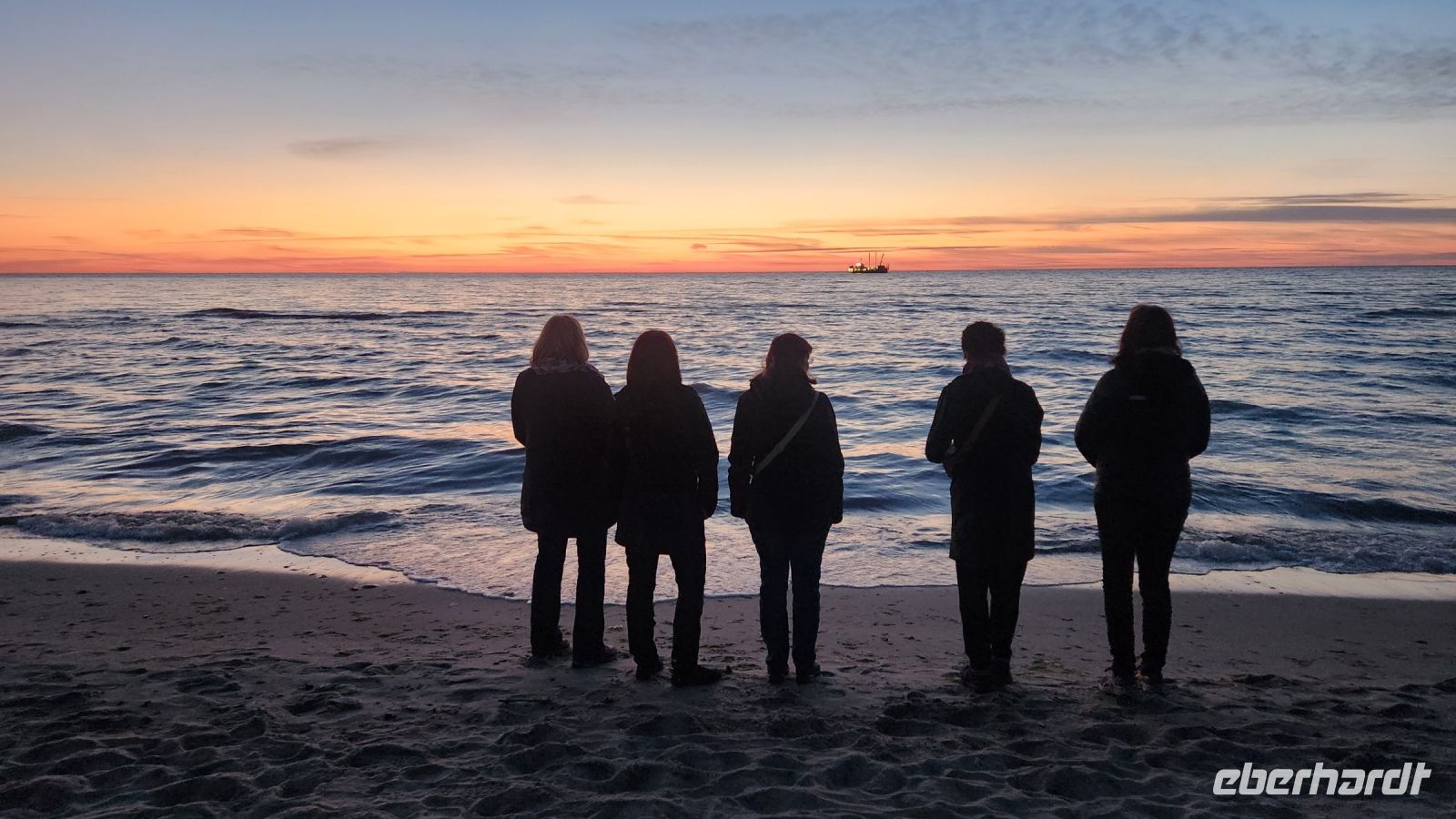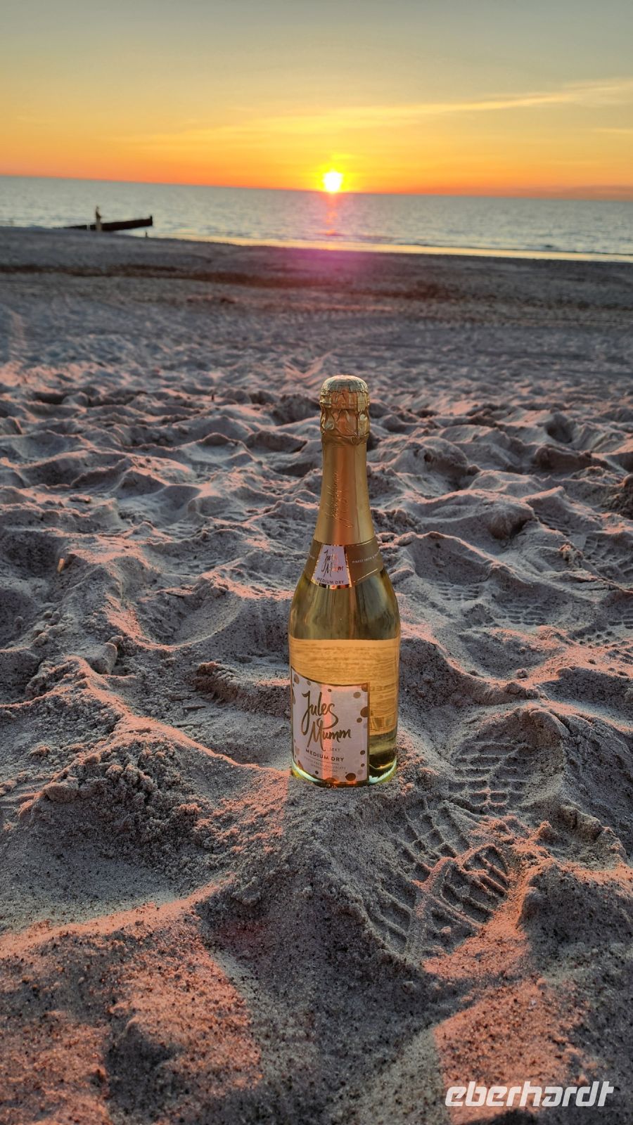 Beim Abendessen sitzen wir dann alle gemütlich zusammen und lernen uns kennen. Und da uns ein perfekter Sonnenuntergang geschenkt wird, stoßen wir alle mit Sekt direkt am Strand auf eine schöne Woche an!