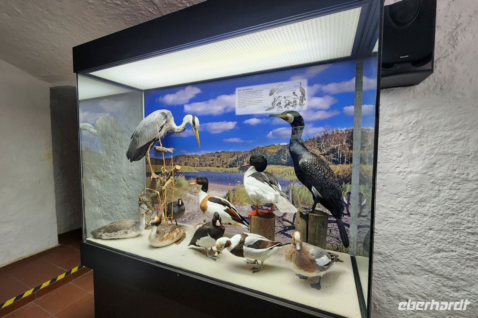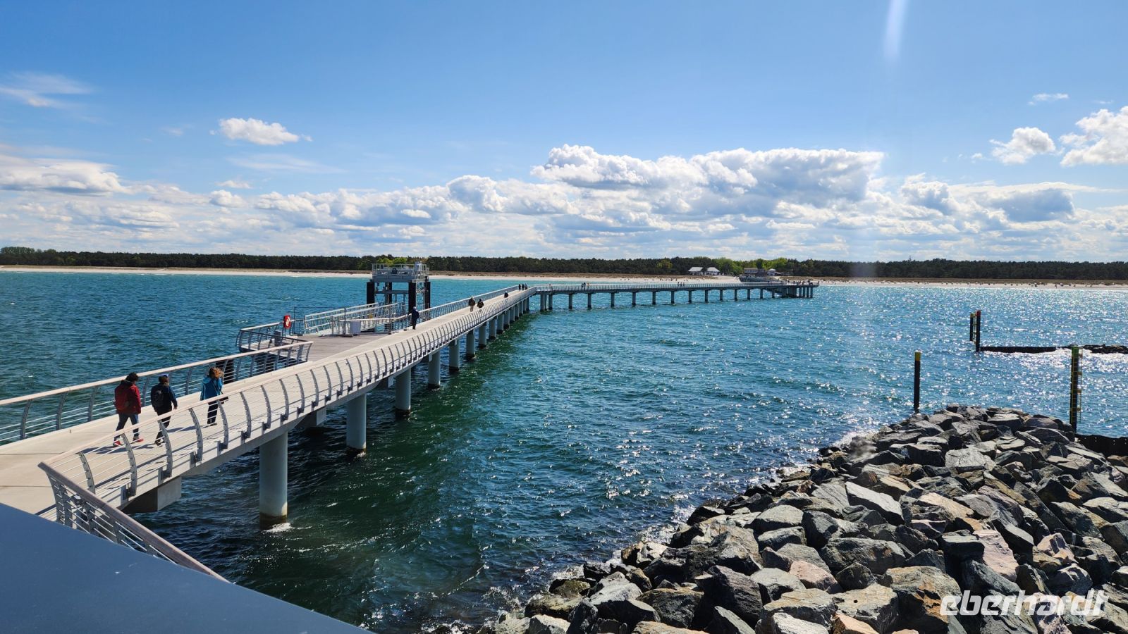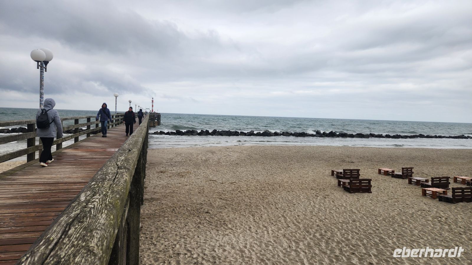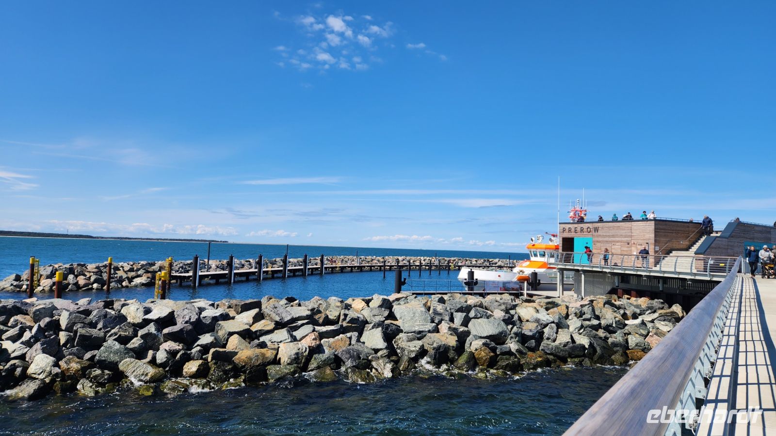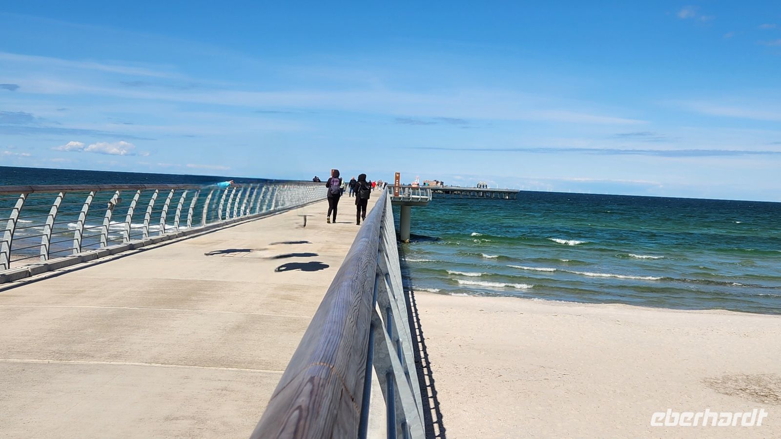 Nachdem wir uns die liebevoll gestaltete Ausstellung im Natureum angeschaut haben über Flora und Fauna dieser Region, starten wir unsere Wanderung. Zunächst laufen wir einen Bohlen-Rundweg durch die Dünen-Landschaft. Wir besteigen einen Hochstand und können einige Wasservögel mit dem Fernglas erkennen. Danach führt uns ein Waldweg bis zum Nordstrand. Herrlich, kilometerlang spazieren wir am Strand entlang, genießen die Wellen, den Sonnenschein und den weißen Sand bis wir die Seebrücke von Prerow erreichen. Sie ist erst im vorigen Jahr fertiggestellt worden. Ganze 720 m ist sie lang, am Ende ein Hafenbecken, das Platz für 50 Schiffe bietet, was für ein Bauwerk! Wir stärken uns mit Fischbrötchen oder mit einem Eisbecher und bummeln noch ein wenig durch die kleinen Geschäfte auf der Promenade, bevor wir uns wieder auf den Weg nach Dierhagen machen.