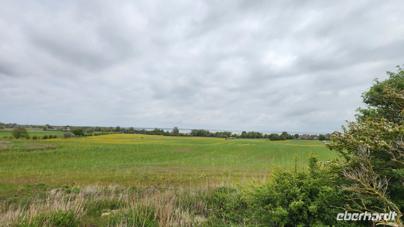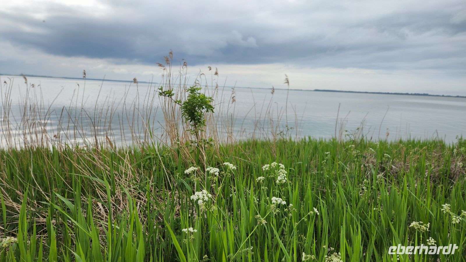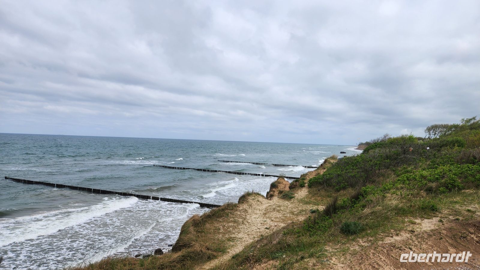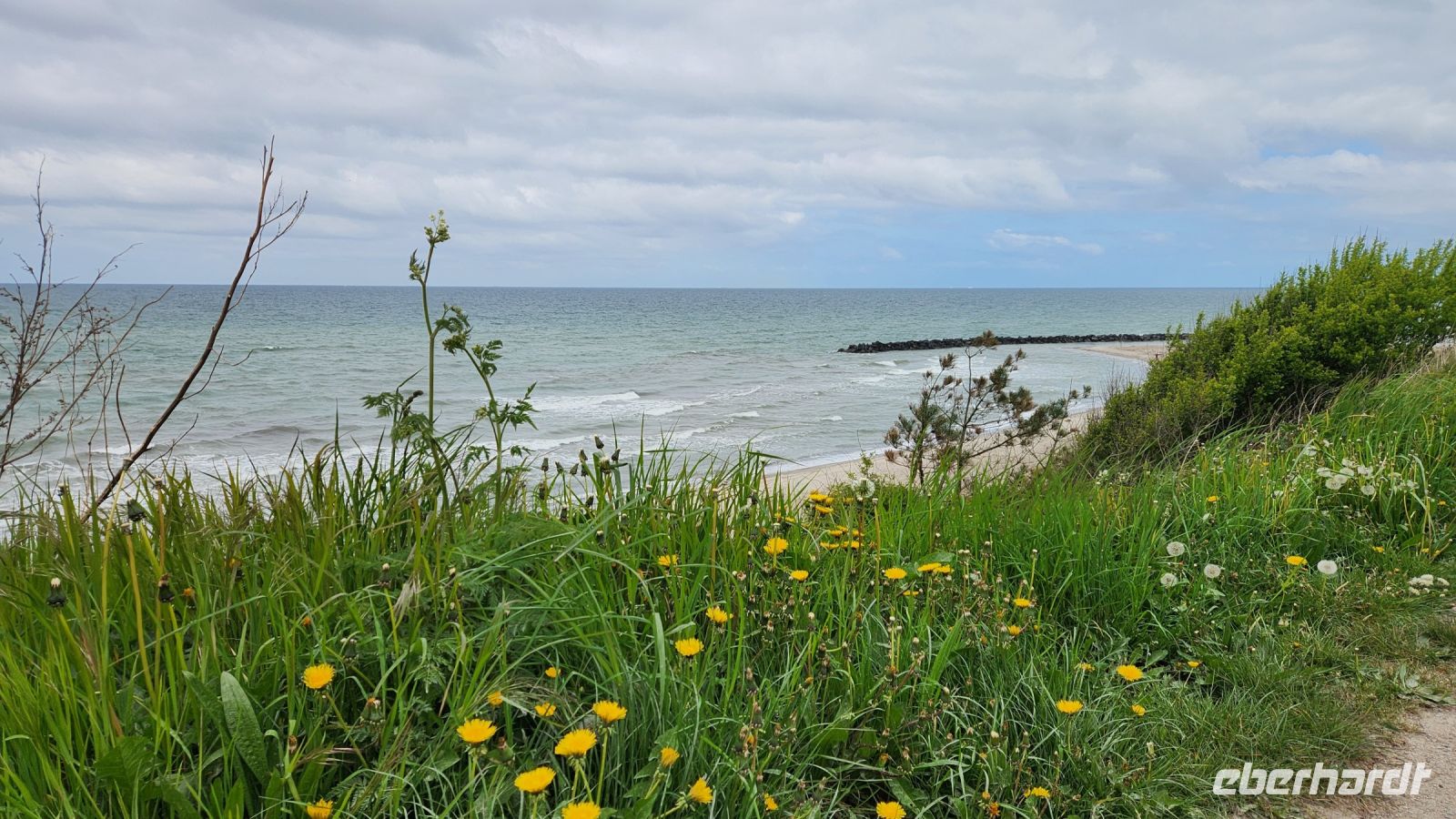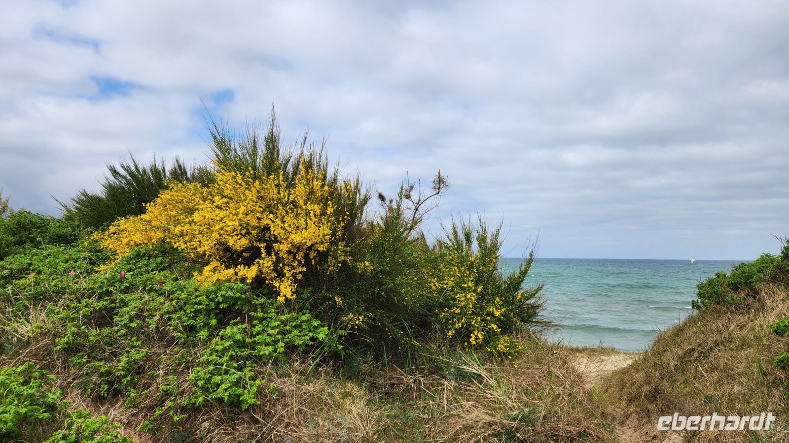 Unser erstes Ziel ist die 240 m lange Seebrücke von Wustrow. Von dort haben wir einen sehr schönen Blick auf die Wellen der Ostsee und die Steilküste, die Richtung Ahrenshoop führt. Wir wandern oben an der Steilküste entlang, der Strandbereich unten ist gesperrt, da es jederzeit möglich ist, dass Teile der Steilküste abbrechen. Wir haben immer wieder einen herrlichen Blick auf die Ostsee, laufen an blühenden Feldern vorbei und "besteigen" den 18 m hohen Bakelberg, dem höchsten Punkt auf dem Fischland - Darß.