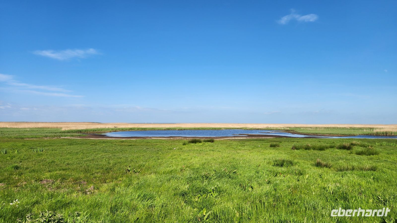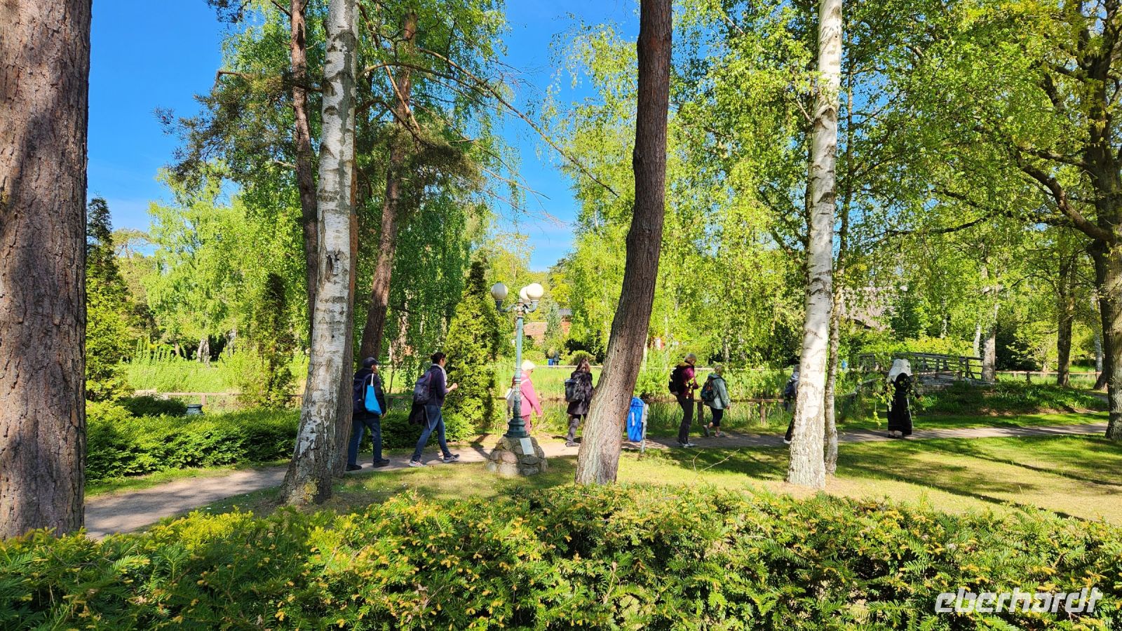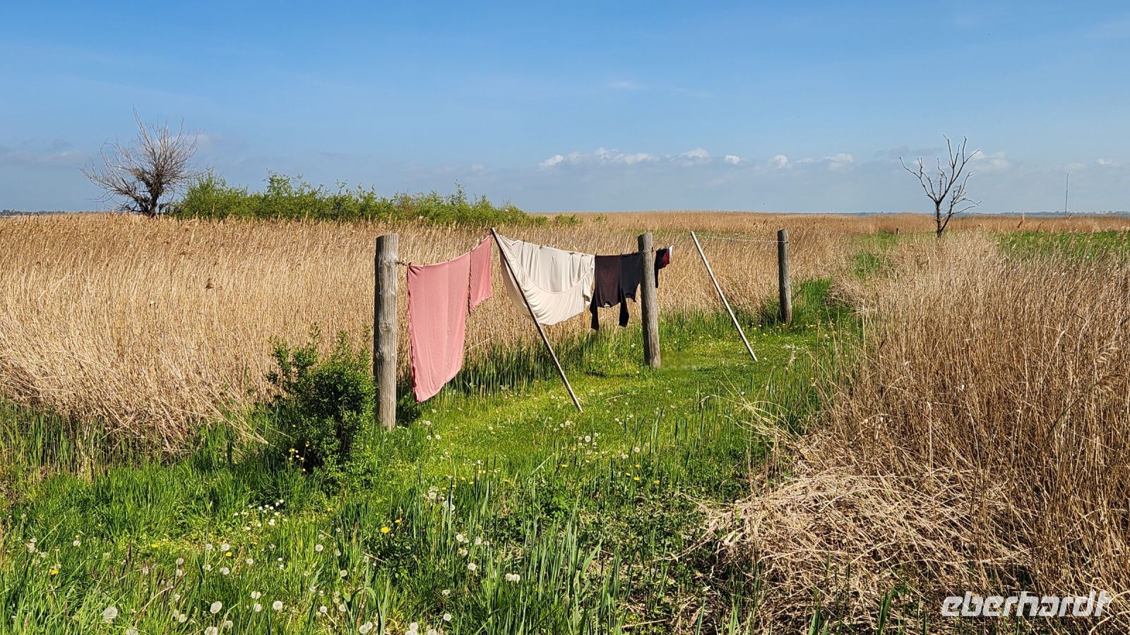 Zum Mittagessen in Ahrenshoop angekommen, gönnen wir uns ein Fischbrötchen, das muss einfach sein! Und da es in Ahrenshoop ein wundberschönes Cafe in einer Windmühle gibt, gehen wir anschließend dort auch noch hin und sitzen draußen in der Sonne bei Kaffee und Kuchen, neben uns Schafe. Danach machen wir uns auf der Boddenseite wieder auf den Rückweg nach Wustrow. Wir kommen an der unter Denkmalschutz stehenden Schifferkirche und am Hafen von Althagen vorbei. Das Schilf ist schon hoch gewachsen, das uns vom Saaler Bodden trennt. Im Wind hängt die Wäsche an der Leine, ein Bild wie aus alten Tagen. Auf den Feldern grasen Pferde und nach einem hübschen Spazierweg durch einen Wald, erreichen wir wieder Wustrow. Da so herrliches Wetter ist, besteigen noch viele von uns den Kirchturm und genießen den Rundumblick über Wustrow, man sieht die alte Seefahrtschule, die Ostsee in weiter Ferne, den Hafen von Wustrow und den Bodden.