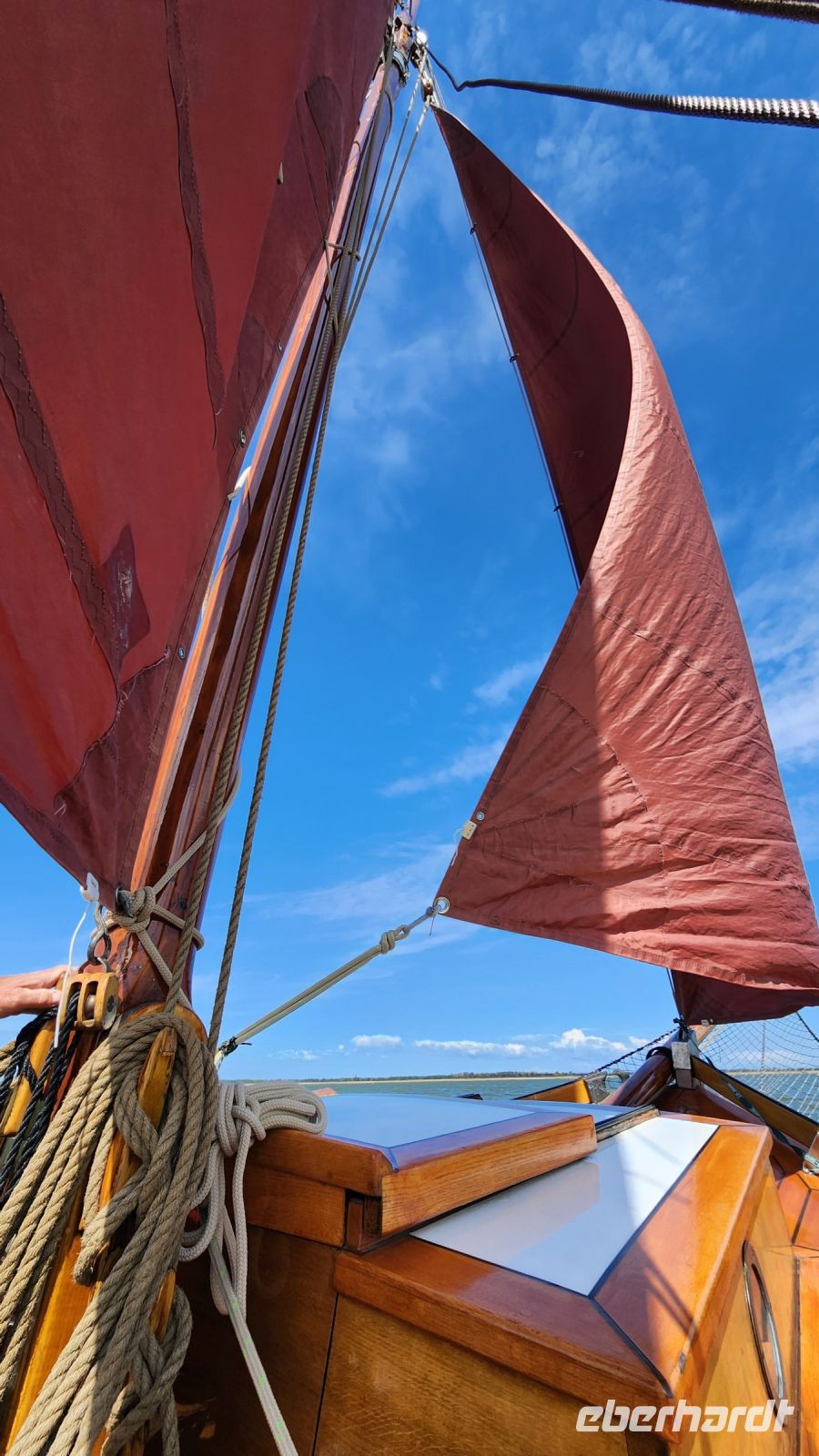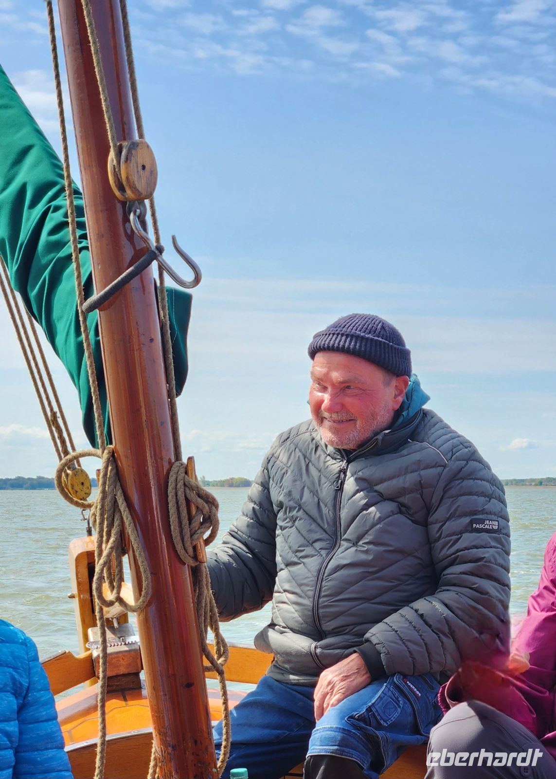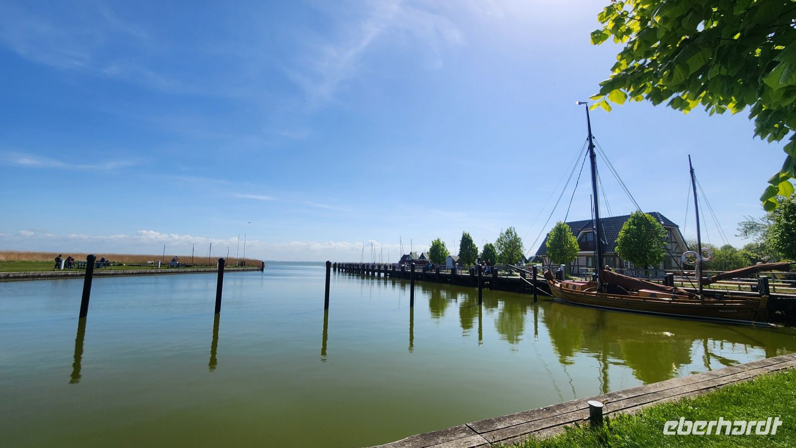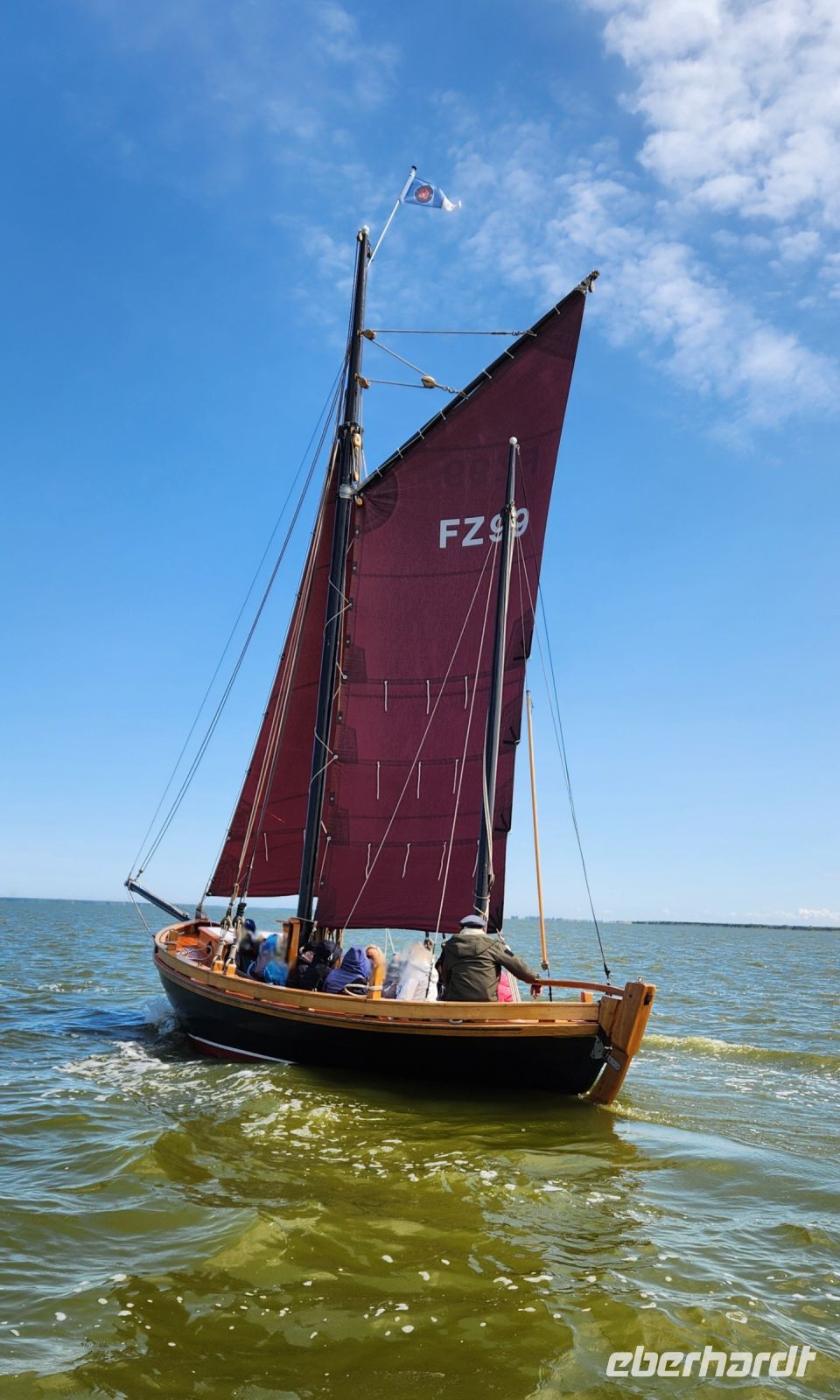 Heute unternehmen wir alle etwas gemeinsam! Wir können ausschlafen und spazieren dann gemütlich zum Hafen von Dierhagen. Die beiden hübschen Zeesenboote mit ihren tiefroten Segeln sind schon bereit, unsere Skipper Reini und Rudi begrüßen uns fröhlich ! Es wird eine herrliche Fahrt über den Saaler Bodden. Die beiden wissen uns viel zu erzählen über diese besonderen Fischerboote, über das Fischen bei Wind und Wetter, über den Bodden und auch einige Geschichten aus alten Zeiten. Eine Dame aus unserer Gruppe überrrascht uns mit Seemannsliedern auf ihrer Mundharmonika. Rudi laufen sogar ein paar Tränen.