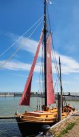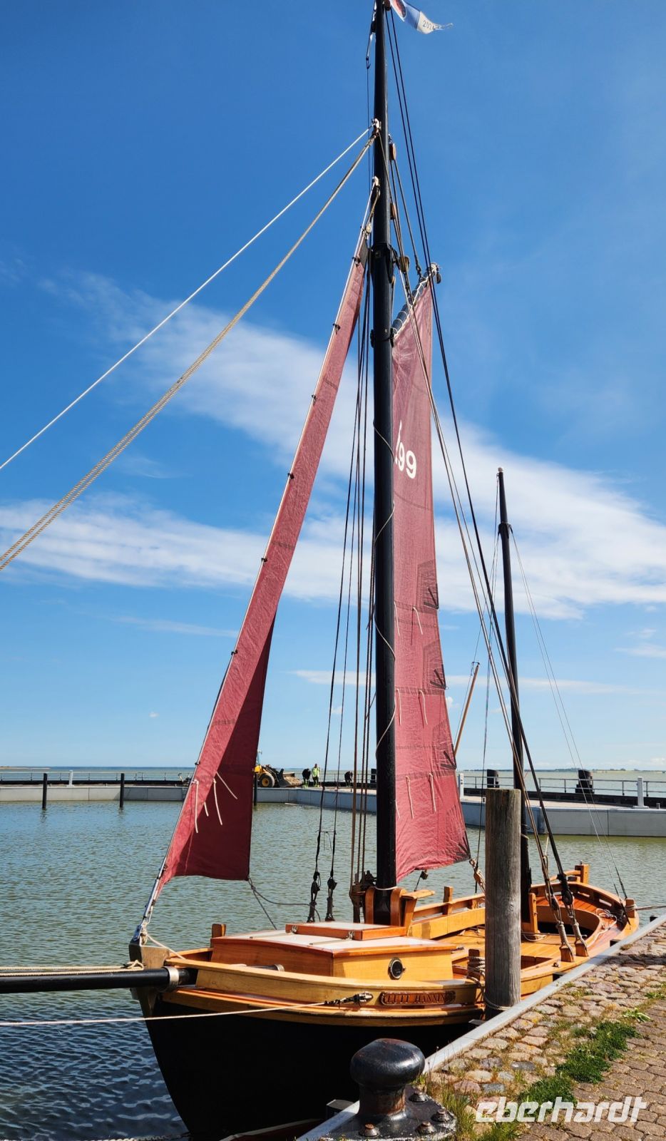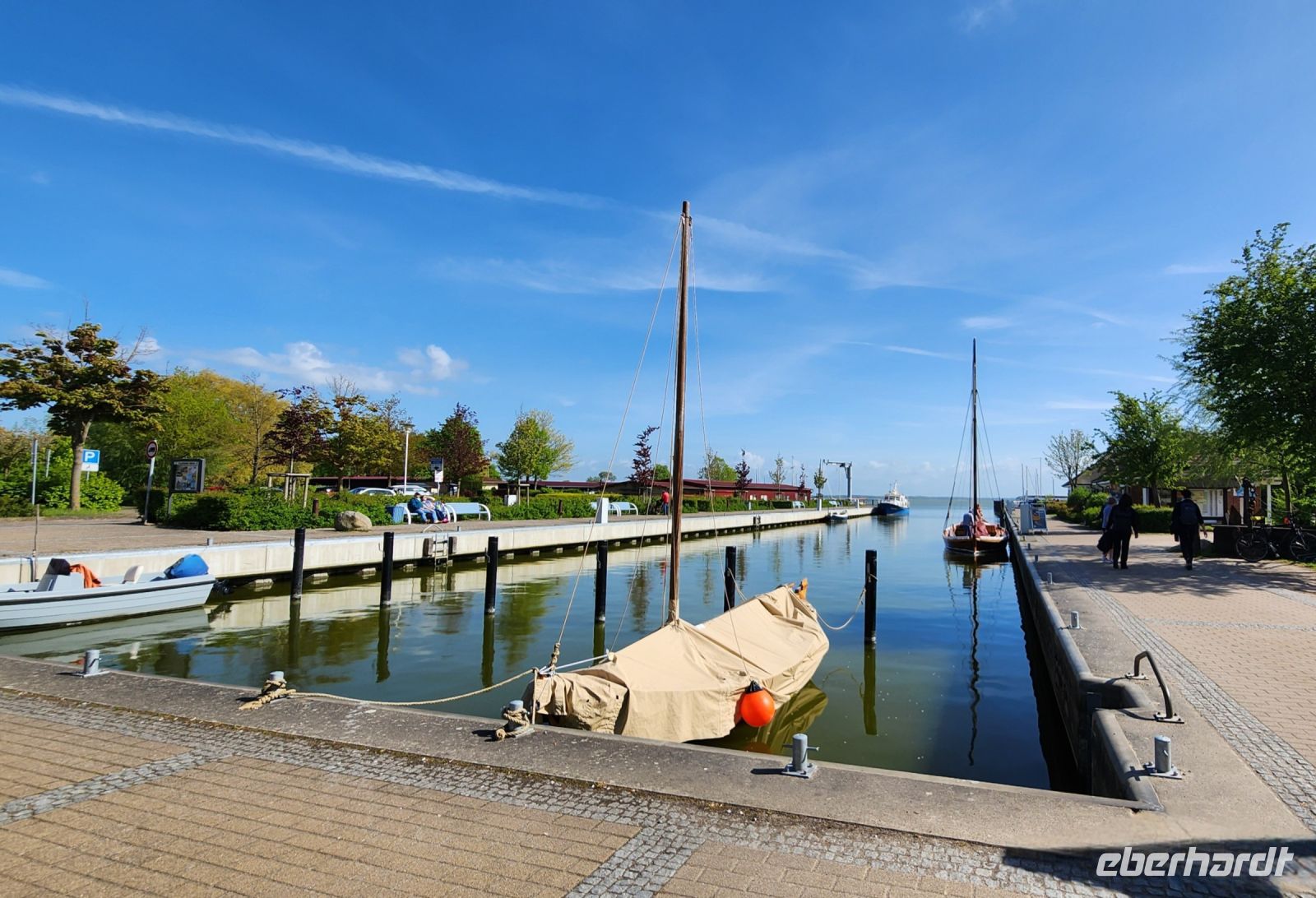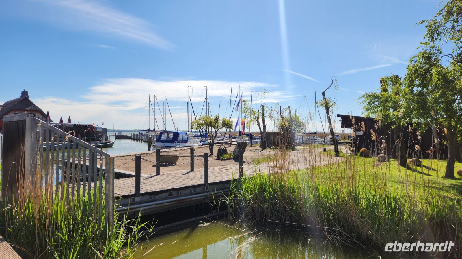 Heute unternehmen wir alle etwas gemeinsam! Wir können ausschlafen und spazieren dann gemütlich zum Hafen von Dierhagen. Die beiden hübschen Zeesenboote mit ihren tiefroten Segeln sind schon bereit, unsere Skipper Reini und Rudi begrüßen uns fröhlich ! Es wird eine herrliche Fahrt über den Saaler Bodden. Die beiden wissen uns viel zu erzählen über diese besonderen Fischerboote, über das Fischen bei Wind und Wetter, über den Bodden und auch einige Geschichten aus alten Zeiten. Eine Dame aus unserer Gruppe überrrascht uns mit Seemannsliedern auf ihrer Mundharmonika. Rudi laufen sogar ein paar Tränen.