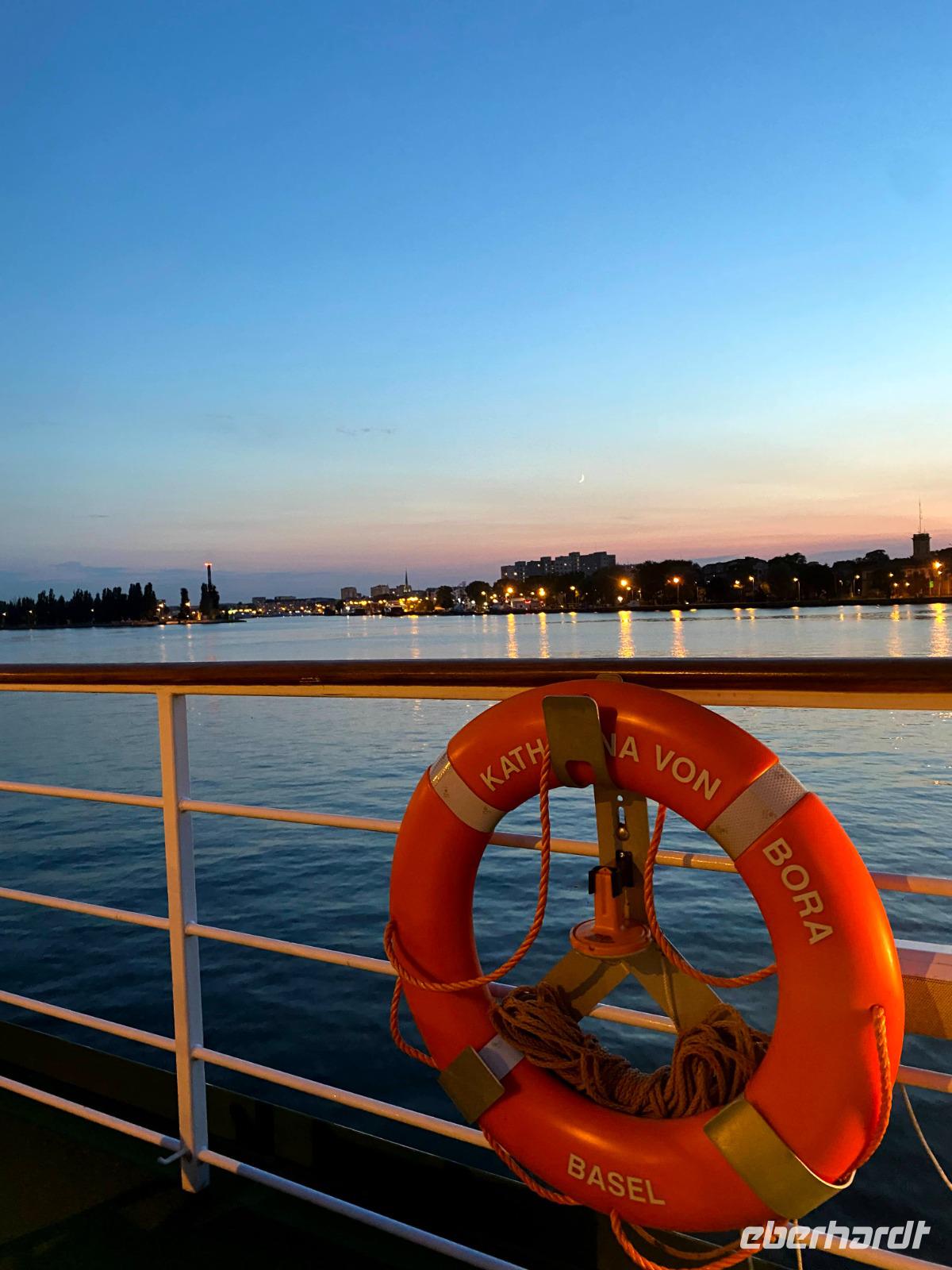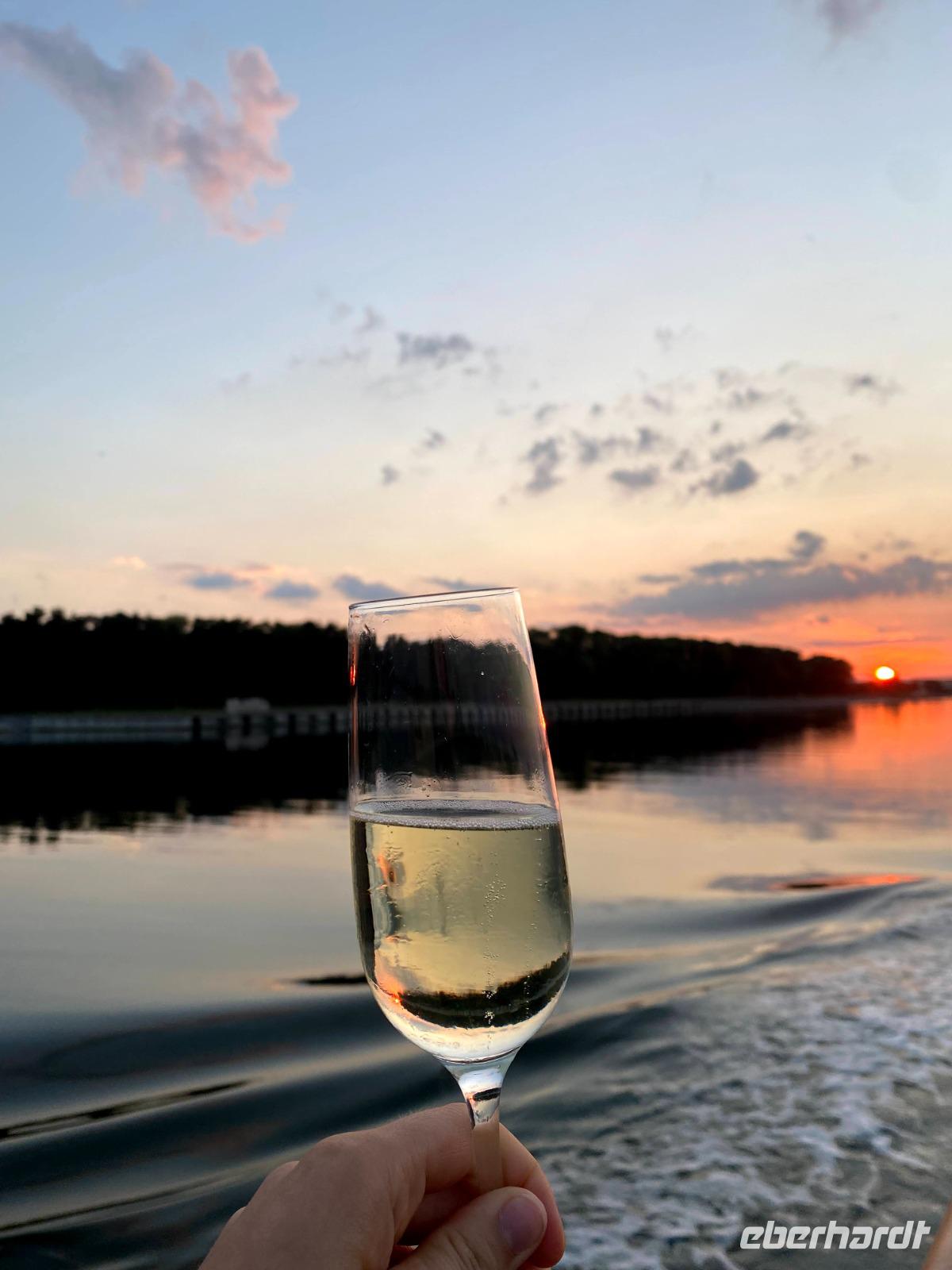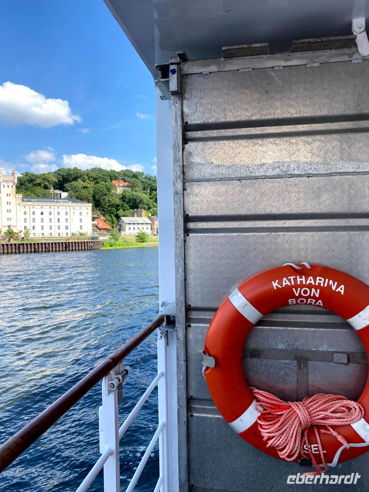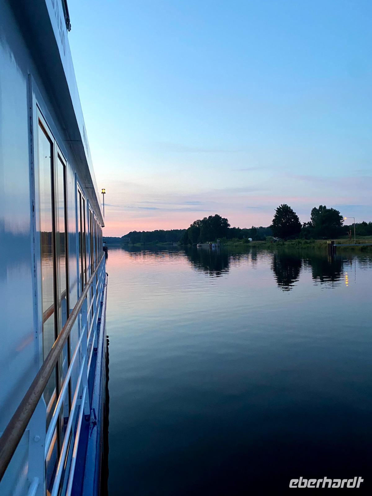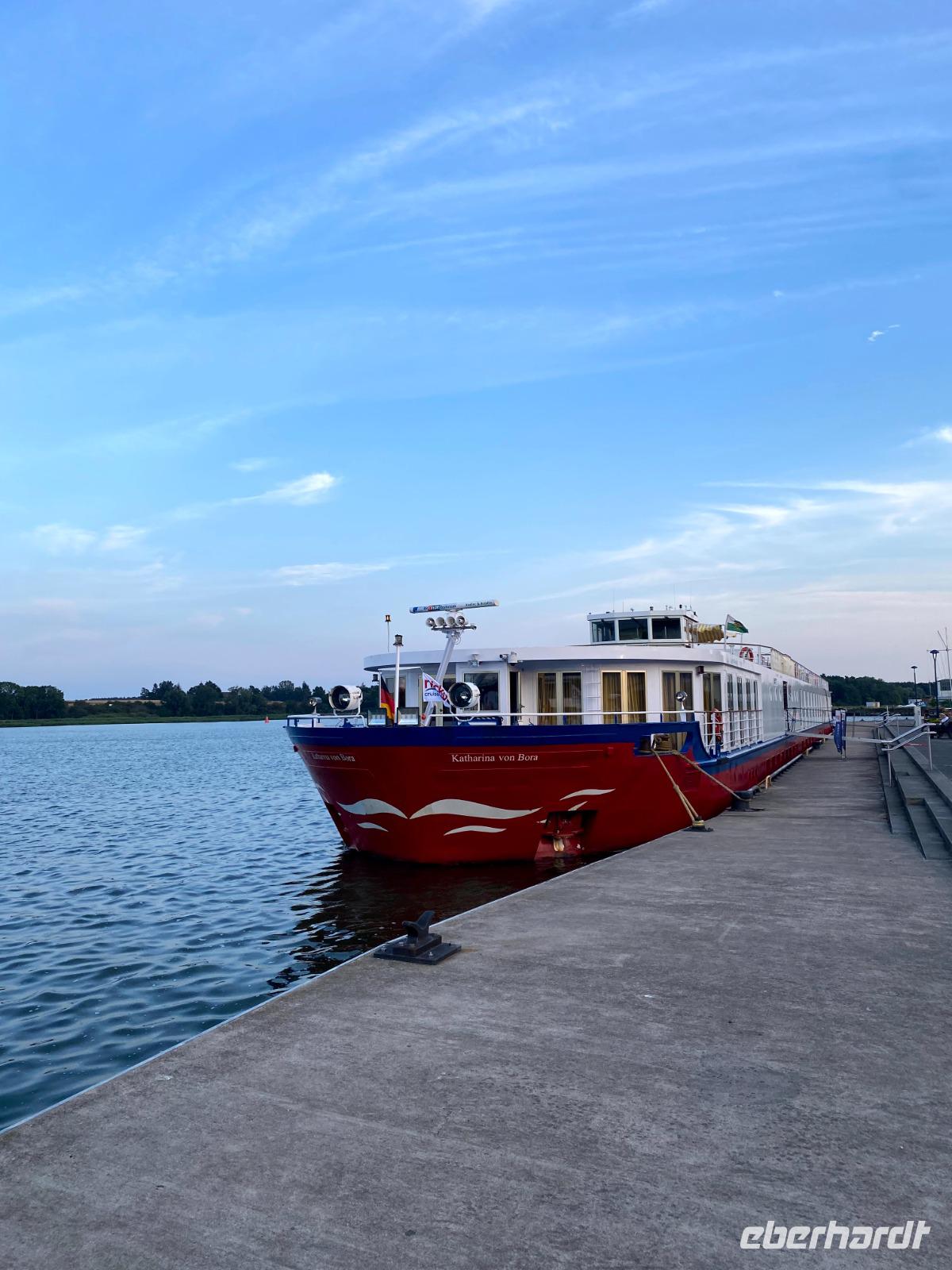 Zurück an unserem Anfangspunkt am Basinplatz legten wir noch eine kurze Pause ein, in welcher wir uns mit Eis oder einem kühlen Getränk im Schatten stärken konnten. Und dann endlich war es soweit. Wir machten uns auf den Weg zu unserem schwimmenden Hotel, der MS Katharina von Bora. Im Hafen von Potsdam wurden wir bereits vom freundlichen Bordpersonal empfangen und erledigten alle Formalitäten des Check-in. Anschließend bezogen wir unsere Kabinen. Bei einem Stück Kuchen sahen wir uns alle im Salon wieder und konnten nun fast sagen „Wir sind angekommen". Am Abend warteten noch viele Informationen auf uns: wir lauschten aufmerksam der Sicherheitseinweisung des Kapitäns, lernten wichtige Mitglieder der Crew kennen und erfuhren etwas über den ein oder anderen Ausflug, der noch vor uns lag. Nach einem Gläschen Sekt mit unserem Kapitän konnten wir unser erstes gemeinsames Abendessen genießen. Der Hunger war groß und so freuten wir uns auf ein ausgiebiges Abendmahl. Gemütlich ließen wir den Abend bei Livemusik oder an der frischen Luft auf dem Sonnendeck ausklingen und freuten uns auf eine wundervolle Reise.