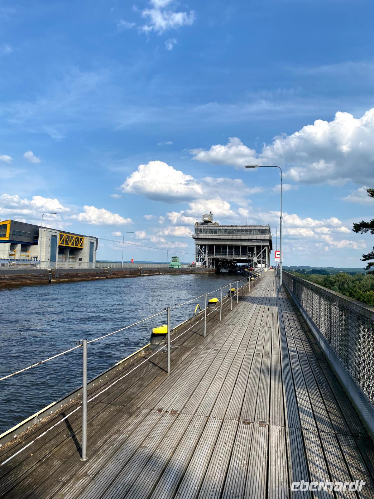 Die Frühaufsteher trafen sich schon am Morgen auf dem Sonnendeck und genossen die Stille und das langsam an uns vorbeifließende Wasser des Oder-Havel-Kanals. Während eines ausgiebigen Frühstücks genossen wir die Landschaft, die an den Fenstern an uns vorbeizog. Heute wartete noch ein erlebnisreicher Tag auf uns. Wir durften das atemberaubende Kloster Chorin sowie das Schiffshebewerk in Niederfinow besuchen. Doch bevor wir mittags das Schiff verlassen sollten, erfuhren wir noch viel Wissenswertes über die Ausflüge, die uns auf unserer Strecke erwarten sollten. Unsere liebe Kreuzfahrtleiterin Maggy zeigte uns ganz ausführlich, was wir wo erleben können und schürte unsere Reiselust mit schönen Bildern. Bis zum Mittagessen genossen wir das herrliche Wetter mit viel Sonnenschein auf dem Sonnendeck. Für den Großteil unserer Gruppe ging es nach dem Mittagessen zum wunderschönen Kloster Chorin. Schon an den Eingangstoren wurden wir von herrlichen Klängen eines Orchesters begrüßt, welches hier heute beim „Musiksommer" Gäste verzaubern sollte. Unser örtlicher Guide konnte die alten Gemäuer mit so vielen Bildern und Geschichten füllen, wir konnten wunderbar die Geschichten und Erlebnisse der ehemaligen Zisterziensermönche vor unseren Augen sehen. Wir lauschten noch einmal dem Orchester, bevor wir uns langsam auf den letzten Teil unserer Führung durch das Kloster machten. Bevor unsere Busfahrt weiter zum nächsten Highlight, dem Schiffshebewerk Niederfinow, gehen sollte, hatten wir noch ein wenig Freizeit im Klostershop oder für ein erfrischendes Eis. Durch Eberswalde und die Landschaft des Barmin fuhren wir nun zu einem beeindruckenden Bauwerk aus 14.000 Tonnen Stahl.