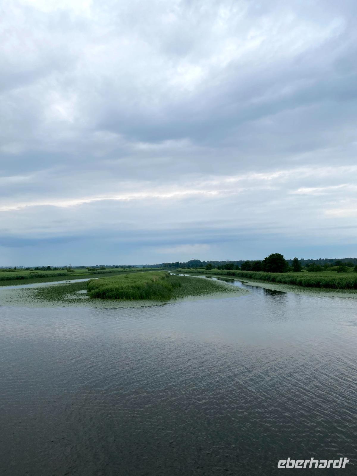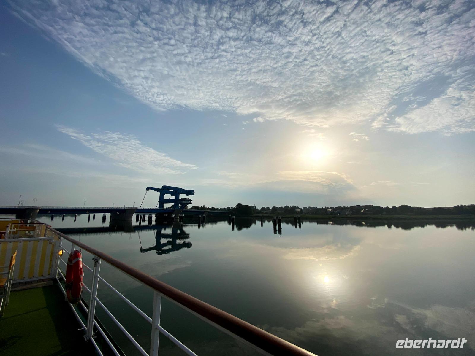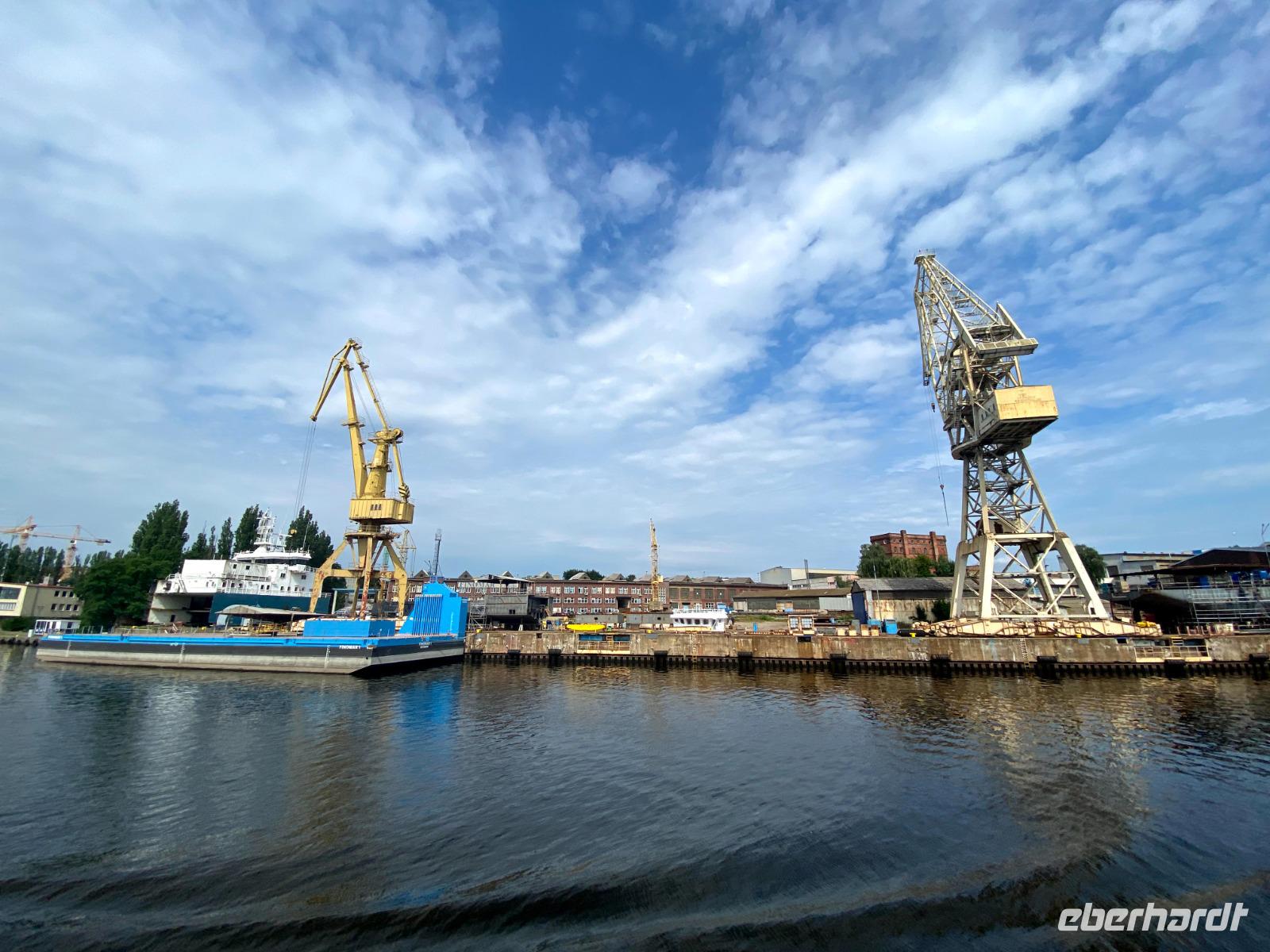 Am frühen Morgen verließ die Katharina von Bora den Hafen von Schwedt. Ziel sollte die polnische Hafenstadt Stettin sein. Einige Wolken säumten den Himmel und wir konnten unsere Nasen in eine frische Brise halten, bevor es zum gemeinsamen Frühstück ging. Kraniche, Wildenten und unberührte Natur zogen an uns vorbei und die Ruhe, die diese Landschaft ausstrahlte, legte sich auch auf uns nieder. Entschleunigend zog der Fluss an uns vorbei, während wir auf dem Sonnendeck saßen und gespannt die Landschaft beobachten. Zwei Fischadler begleiteten unsere Blicke und stellten ein Highlight unserer Reise nach Stettin dar. Die ein oder andere Brücke wurde passiert, bevor wir am Mittag Stettin erreichten. Direkt an den Hakenterrassen legte unser Kreuzfahrtschiff an und ermöglichte uns somit einen optimalen Startpunkt für individuelle Erkundungen der Stadt. Bevor für einige Gäste ein Ausflug durch die vielseitige Stadt beginnen sollte, stärkten wir uns bei einem Mittagessen.