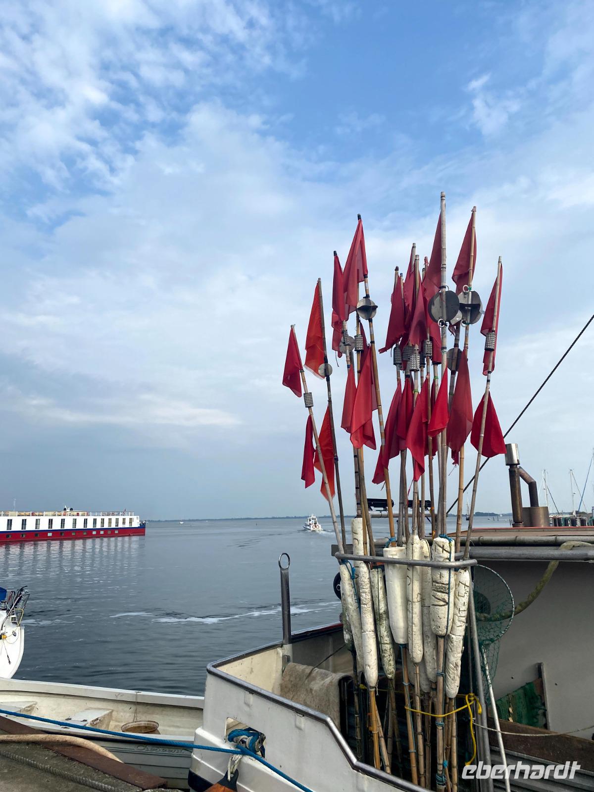 Der kleine Fischerort Wiek bot uns einen Liegeplatz und so hatten wir die Möglichkeit, an einem Ausflug durch die Stadt teilzunehmen oder individuell Greifswald zu entdecken. Mit dem Stadtbus war nach 15 Minuten die Innenstadt erreicht und wir bewunderten das ochsenblutfarbende Rathaus auf dem Marktplatz. Von hier aus konnten die kleinen Gassen, der Dom oder die Marienkirche und die Fußgängerzone, bis zum Hafen erkundet werden. Typisch für Greifswald probierten einige Gäste auch den „Pflaumenaugust" ein Fischbrötchen mit Apfel und Pflaumenmus. Die kleine Hansestadt zog uns in Ihren Bann und versüßte uns mit ihrem Flair den Nachmittag. Glücklich und zufireden trafen sich alle Gäste an Bord unseres Flusskreuzfahrtschiffes wieder und wir legten schon wieder ab, den Hafen von Stralsund immer vor Augen. Ein weiterer Höhepunkt kündigte sich am Abend an Bord an. Unser Kapitän bedankte und verabschiedete sich am vorletzen Abend bei einem gemeinsamen Empfang von uns und wir durften noch einmal das ein oder andere kulinarische Highlight während des Gala-Abendessens genießen. Die anschließende Tombola, die von unserer Kreuzfahrtleitung und dem Hotelmanager veranstaltet wurde, brachte für viele von uns die ein oder andere Überraschung und ein kleines Mitbringsel für zu Hause.