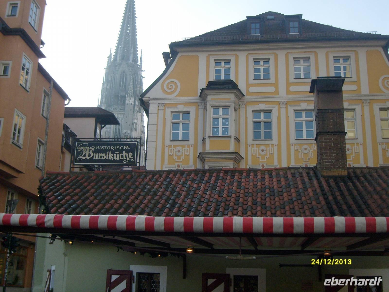 Gleich daneben das historische Wurstkuchl an den Donaupromenaden. Es ist belegt, dass bereits während des Baus der Steinernen Brücke und des Doms im 12. Jahrhundert die Arbeiter und Steinmetze hier verköstigt wurden.