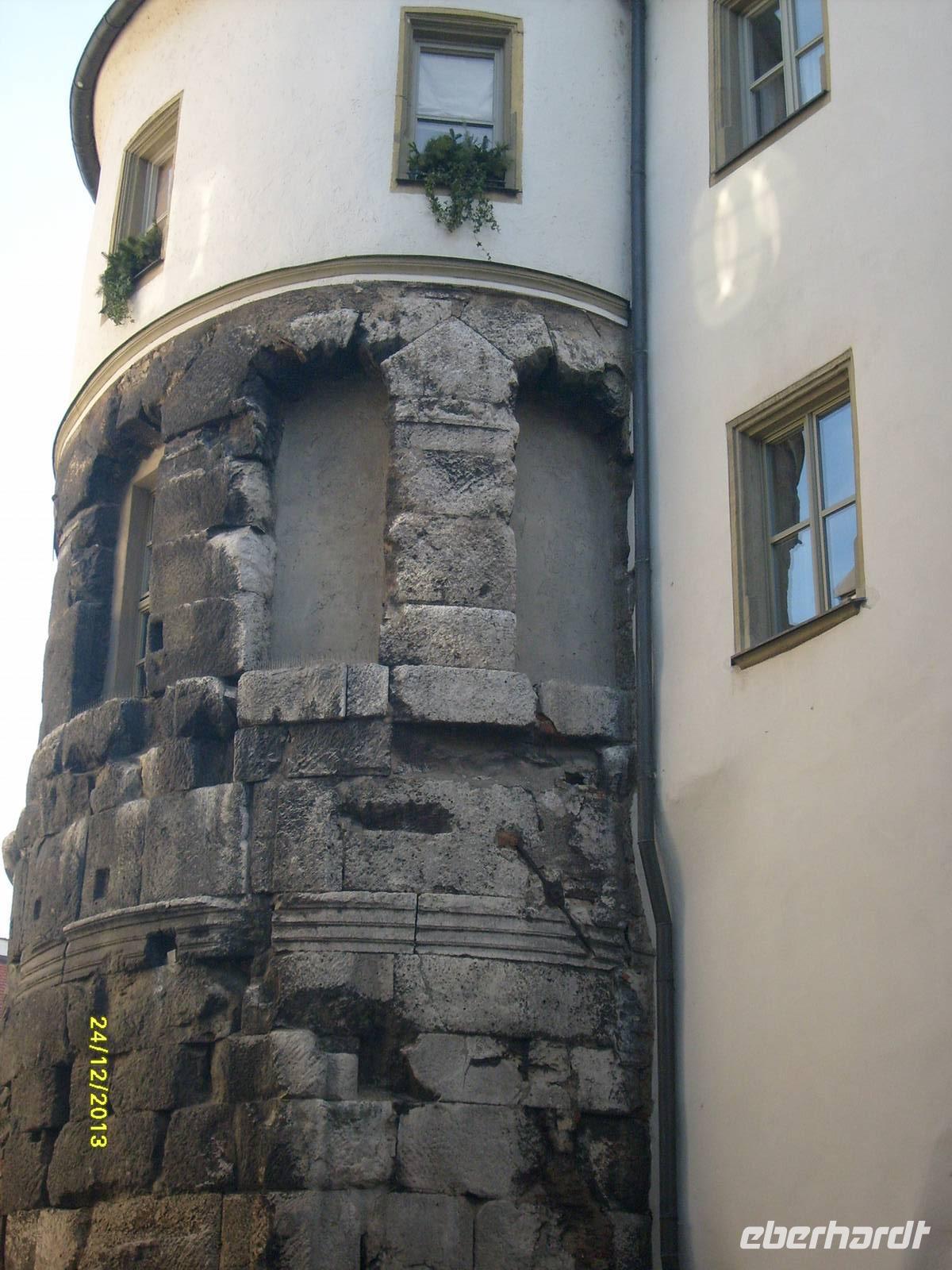 Unser Rundgang führt weiter zur Porta Praetoria. Sie gilt als eines der ältesten erhaltenen römischen Bauwerke Deutschlands. Das Tor ist ein Rest des ehemaligen römischen Legionärslagers "Castra Regina" und läßt sich daher auf ein Alter von 2.000 Jahren schätzen.