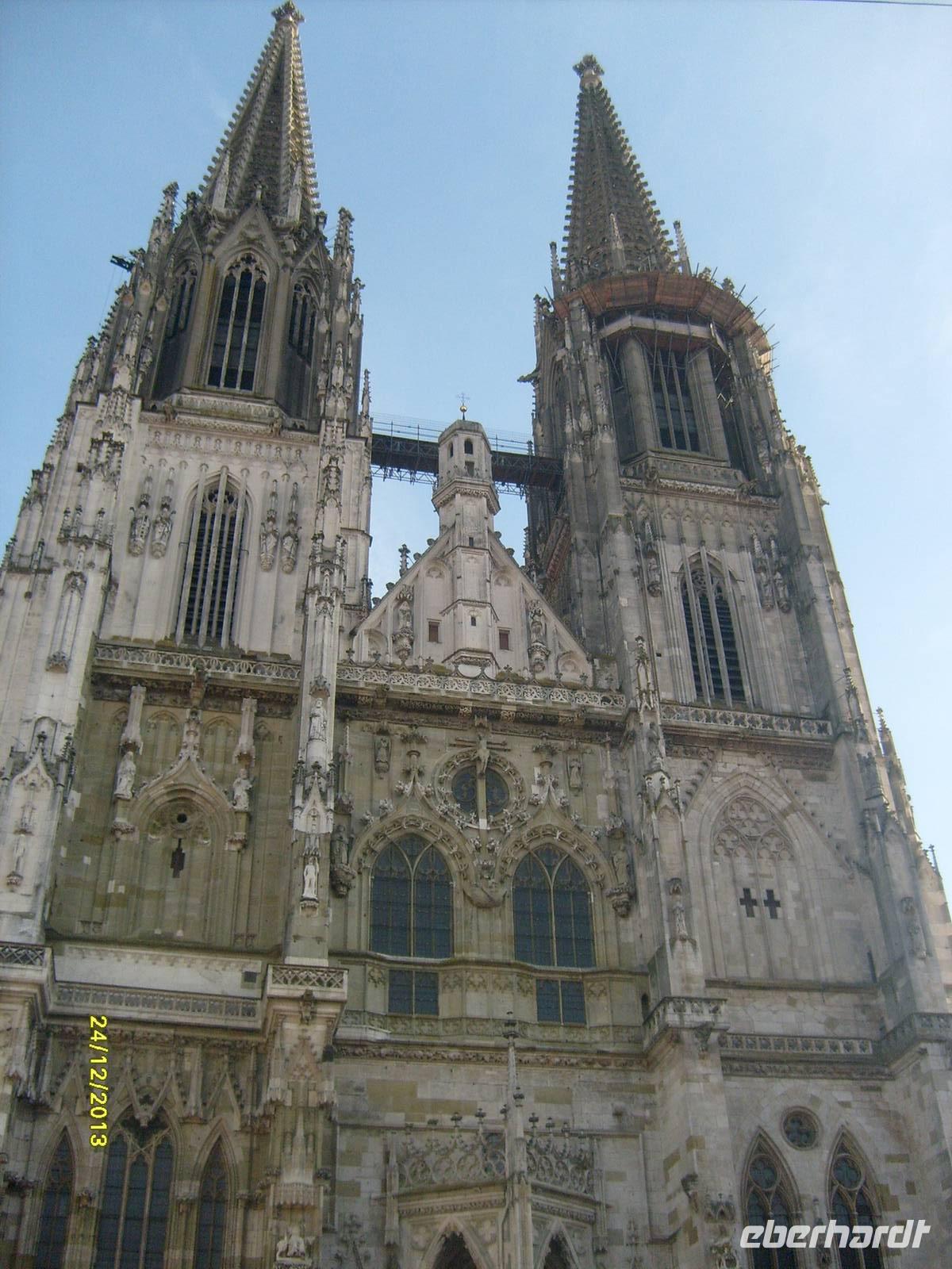 Nur ein kleines Stück laufen wir, dann stehen wir vor dem Regensburger Dom. Er zählt zu den bedeutendsten Leistungen der Gotik in Bayern. Mit seinen weit sichtbaren Türmen ist der Dom St. Peter Mittelpunkt der Stadt Regensburg. Begonnen wurde mit dem Bau 1270, die Bauzeit zog sich über Jahrhunderte hinweg. Prunkvoll präsentiert sich das Hauptportal.