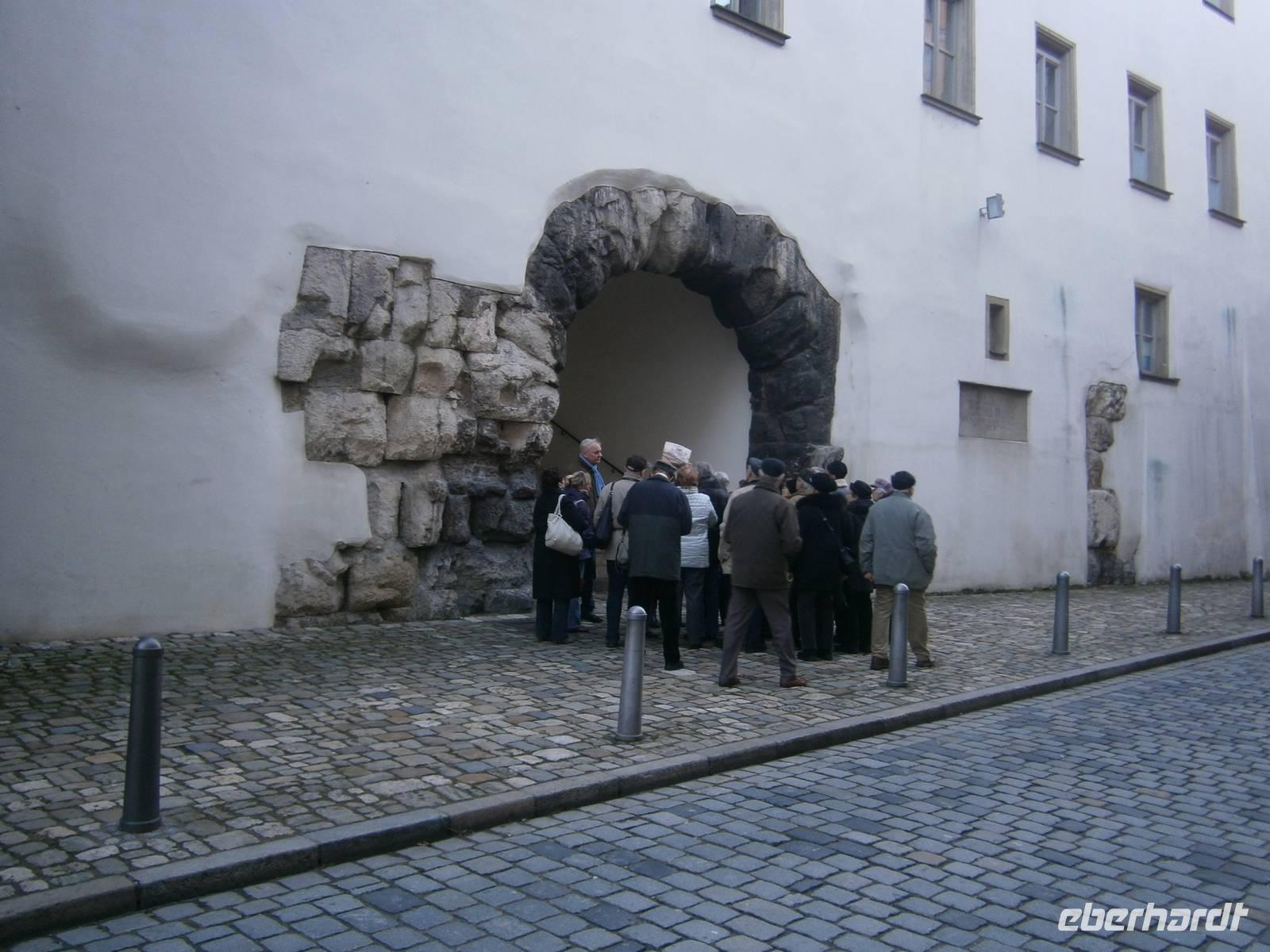 Unsere beiden Gästeführerinnen, Frau Kuschel und Frau Möllmann, holen uns, nach der Mittagspause direkt am Restaurant ab. Von hier beginnen wir den Stadtrundgang durch die historische Altstadt. Regensburg, zählt zu den ältesten Städten. Der Stadtkern verfügt über 1500 denkmalgeschützte Gebäude, davon bilden allein über 900 Gebäude den historischen Kern als Ensemble „Altstadt mit Stadtamthof". Vom Dom aus führen viele kleine Straßen und Gassen durch die Altstadt, die sich noch festlich geschmückt präsentiert und ihr ein ganz besonderes Flair verleiht. Der Stadtrundgang führt uns unter anderem zur „Alten Kapelle" - mit der Innenausstattung im Rokoko aus dem 18. Jahrhundert und der „Papst Benedikt Orgel" - die von ihm im Jahr 2006 geweiht wurde. An der Goliathstraße, mit ihren staatlichen Patrizierhäusern befindet sich die Porta Praetorius. Das Tor ist ein Rest des ehemaligen römischen Legionslagers Castra Reginal aus dem 2. Jahrhundert. Am Rathausplatz erleben wir dann noch eine historische Hochzeitsgesellschaft und spazieren weiter zum Dom. Mit dem Bau des Regensburger Doms St. Peter wurde Mitte des 13. Jahrhunderts begonnen., wo bei die beiden Türme erst unter der Herrschaft von König Ludwig I. von Bayern angefügt wurden. Heute zählt der Dom zu den Hauptwerken gotischer Baukunst in Bayern. Eines der bedeutendsten Wahrzeichen der Stadt ist die Steinerne Brücke. Sie gilt als ein Meisterwerk der mittelalterlichen Baukunst und diente als Vorbild für andere große Steinbrücken, beispielsweise in Dresden über die Elbe und in London über die Themse. Von der Brücke aus, sie ist etwa 300 m lang, hat man den schönsten Blick auf die Altstadtsilhouette. Unmittelbar neben der Brückenauffahrt der Salzstadel. Der Bau des Stadels geht zurück in die Zeit des 17. Jahrhunderts. Die Stadt brauchte Speicherkapazitäten. So gelangte unter anderem das in der Saline Reichenhall gewonnene Salz über Passau nach Regensburg. Wie der Name bereits vermuten lässt, diente das stattliche Gebäude mit seinem hohen Satteldach aufgrund seiner Lage an einer der wichtigsten Schifffahrtsrouten Süddeutschlands lange Zeit als Handelskontor für den internationalen Salzhandel. Nach umfangreichen Sanierungsmaßnahmen erstrahlt der Salzstadel seit 1990 wieder in neuem alten Glanz und ist jetzt Besucherzentrum für das „Welterbe Regensburg." Gleich daneben die „Historische Wurstküche", die in der ersten Hälfte des 17. Jahrhunderts an einem Stadtmauerrest angebaut wurde. Belegt ist, dass bereits während des Baus der Steinernen Brücke und des Doms im 12. Jahrhundert die Arbeiter und Steinmetze in der Wurstkuchl ihren Hunger mit schmackhaftem Garfleisch stillen konnten.