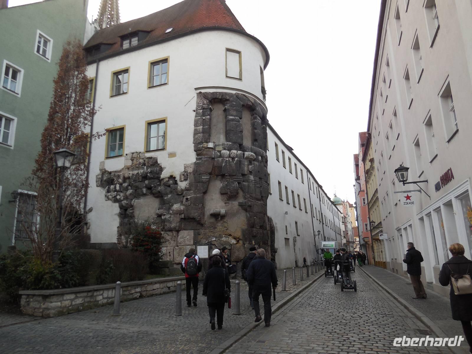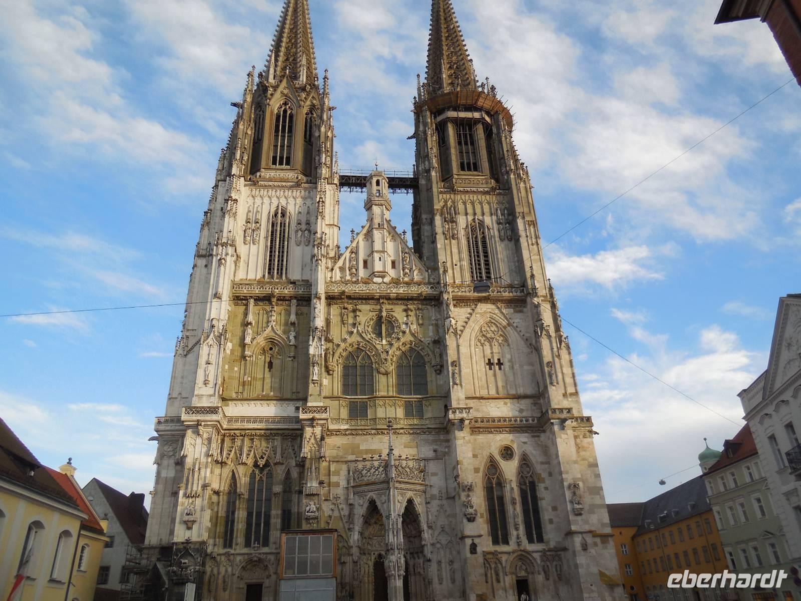 Nach der Mittagspause holen uns zwei Gästeführer am Restaurant ab und führen uns durch die historische Altstadt von Regensburg, die zu den ältesten Städten zählt. Die Geschichte von Regensburg lässt sich zurück verfolgen bis in die Steinzeit. Seither ist das Gebiet an der Mündung von Naab und Regen in das Donauknie besiedelt. Der römische Kaiser Vespasian ließ hier ein Kastell errichten und Kaiser Marc Aurel verlegte und erweiterte dieses, so dass das Legionslager mit dem Namen Castra Regina in die Geschichte einging. Überreste davon finden sich auch heute noch in Regensburg. Von der Porta Praetoria sind der Flankenturm und der Torbogen noch erhalten. Dank ihrer günstigen Lage wurde die Stadt zu einem wichtigen Umschlagplatz des europäischen Handels. Den größten baulichen Aufschwung erlebte Regensburg im 12. und 13. Jahrhundert. Viele der noch heute vorhanden Bauwerke zeigen den damaligen Reichtum der Stadt. Der heutige Stadtkern verfügt über 1500 denkmalgeschützte Gebäude, davon bilden allein über 900 Gebäude den historischen Kern als Ensemble „Altstadt mit Stadtamthof". Vom Dom aus führen viele kleine Straßen und Gassen durch die Altstadt, die sich festlich geschmückt präsentiert. Einen kurzen Blick werfen wir in die Alte Kapelle und spazieren weiter durch die Altstadt. Vom Haus Heuport aus haben wir einen imposanten Blick auf den Dom St. Peter. Er ist das Zentrum der sogenannten Domstadt. Begonnen wurde mit dem Bau im Jahr 1270 und die Bauzeit zog sich über Jahrhunderte hinweg. Prunkvoll gestaltet mit figürlichem und ornamentalem Schmuck präsentiert sich das Hauptportal. Weiter geht es in Richtung Rathausplatz und dem Kohlenmarkt. Hier steht das Alte Rathaus, das in mehreren Bauphasen entstand. An der Ecke des Treppenaufganges sind noch die Maße von Elle, Klafter und Schuch im Mauerwerk verewigt. Das bedeutendste Wahrzeichen der Stadt ist die Steinerne Brücke. Sie gilt als ein Meisterwerk der mittelalterlichen Baukunst und diente als Vorbild für andere große Steinbrücken. Uns präsentiert sich die Brücke in diesen Tagen eingerüstet. In den nächsten zwei Jahren sollen erhaltende Baumaßnahmen durch geführt werden. Ursprünglich war die Brücke mit drei Türmen gesichert, erhalten geblieben davon ist der Brückturm. Gleich daneben der Salzstadel, in dem früher das Salz gelagert wurde. Heute befindet sich im Innern des Salzstadels eine Ausstellung über die Stadt Regensburg als UNESCO Weltkulturerbe. Die Steinerne Brücke ist auch für unsere Reisegruppe am späten Nachmittag der Treffpunkt, von wo aus wir gemeinsam zum Busterminal spazieren und hinüber fahren zu unserem Hotel Haslbach.