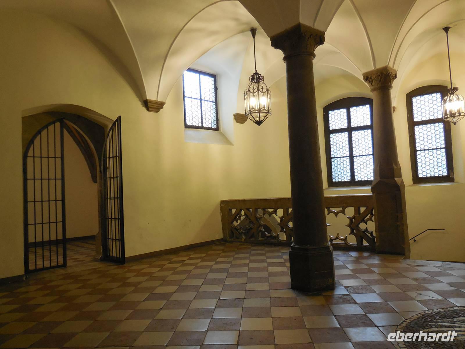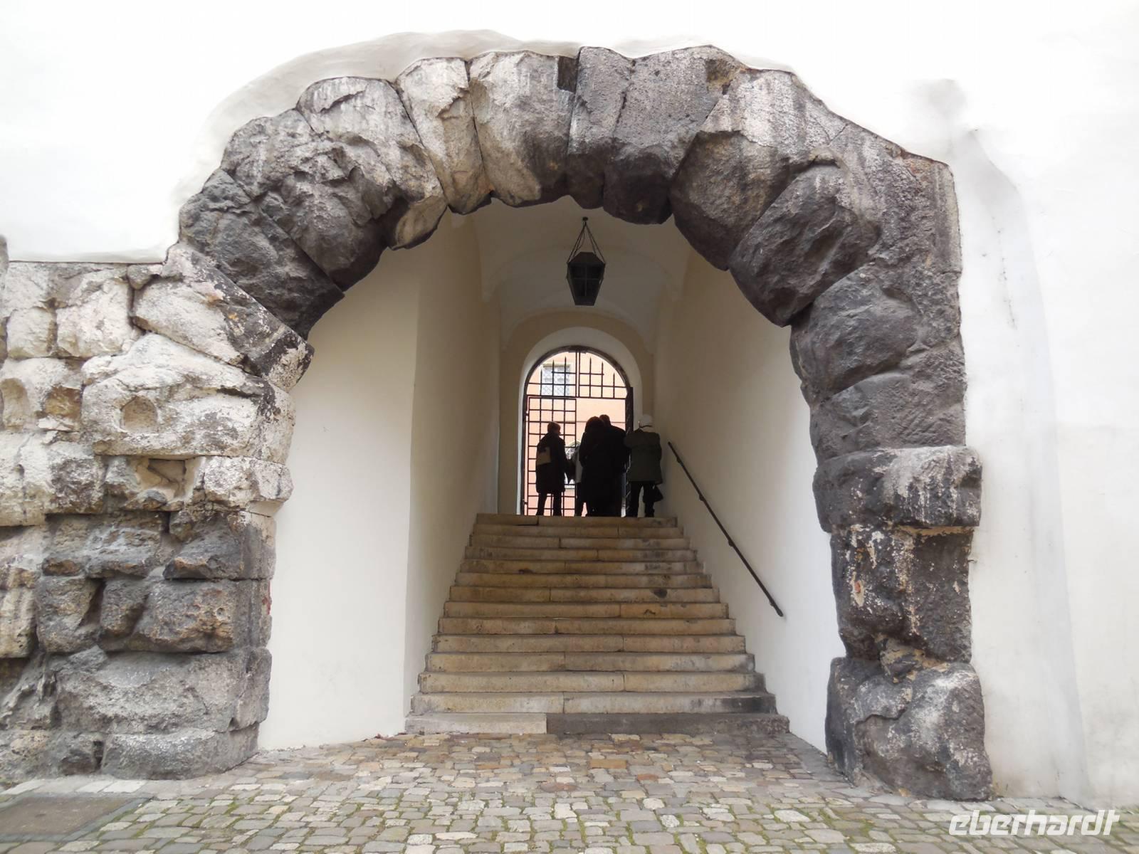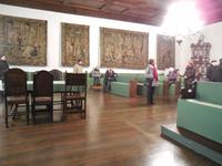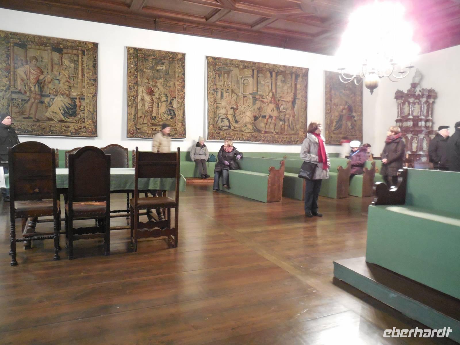 Nach einem reichhaltigen Frühstück bringt uns unser Buschauffeur an diesem nebligen Morgen wieder in die Stadt. An einem zentralen Punkt steigen wir aus unserem Bus und spazieren gemeinsam zum Eingang des Reichstagsmuseum. Da wir eine große Reisegruppe sind - teilen wir uns in zwei Gruppen. Nacheinander besichtigen wir, mit einem Gästeführer, das Museum. Das Reichstagsmuseum, ein Ort mit großer Geschichte. Im Alten Rathaus schlug über Jahrhunderte das Herz der Freien Reichsstadt Regensburg. Hier arbeiteten der Stadtrat und die Verwaltung; hier war - mit Gefängnis und Fragstatt im Untergeschoss - das Gerichtswesen ansässig. Von 1663 bis 1806 tagte am Ort zudem der Immerwährende Reichstag. Er brachte damals die große deutsche und europäische Politik und ihre Vertreter nach Regensburg. Die Atmosphäre des Reichstags ist im Reichssaal und den Beratungszimmern noch gut zu spüren Im Reichssaal, einem gotischen Festsaal, wurden Jahrhunderte lang wegweisende Entscheidungen gefällt. Beeindruckend ist die „Balkendecke", die Bemalung der Wände und die Stufen die den Saal umlaufen lassen noch heute die einstige Sitzordnung des Reichstages zu erkennen. An oberster Stelle (unter einem Baldachin) saß der Kaiser - darunter folgten die Kurfürsten, Fürsten und dann die Vertreter der Reichsstätte. Besondere Orte, während der Besichtigung, sind die Fragstadt (wo die Gefangenen verhört worden), das Lochgefängnis und das Armesünderstübchen.
