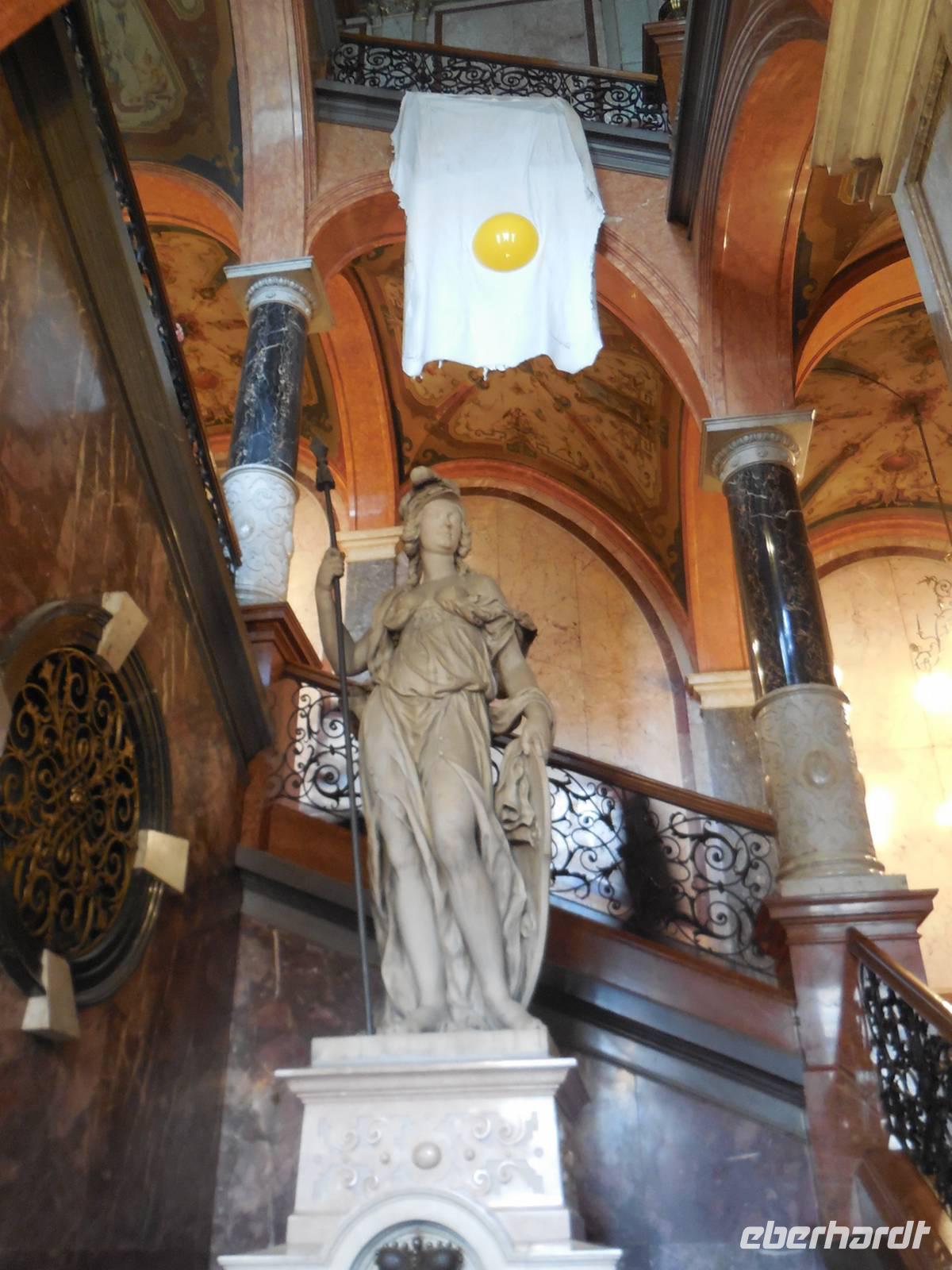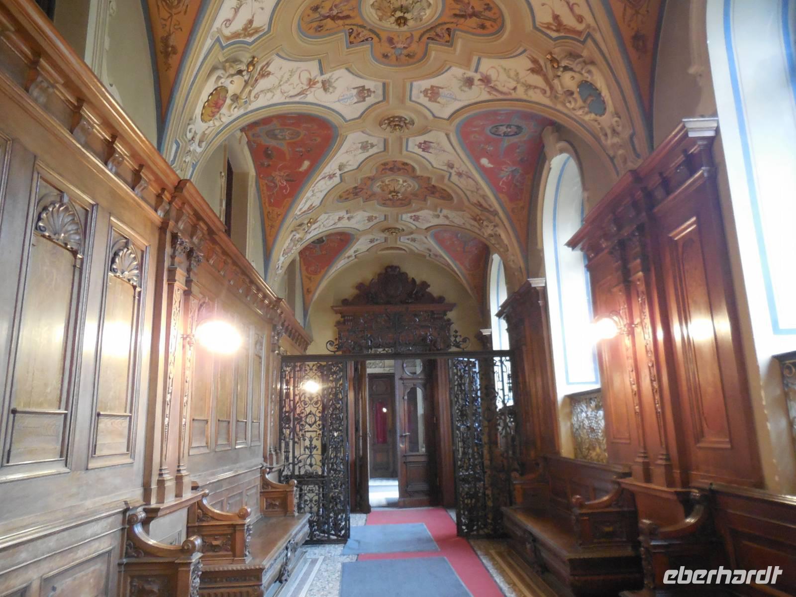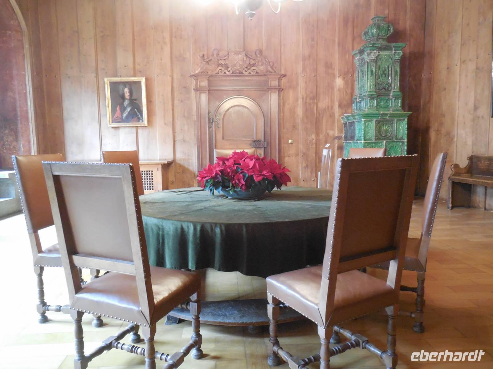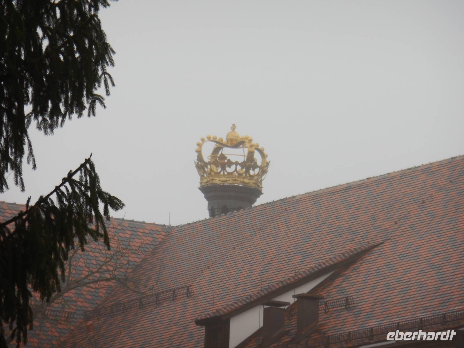 Am letzten Tag des Jahres 2013 steht für unsere Reisegruppe der Besuch des Schlosses Thurn und Taxis auf dem Programm. Seit dem frühen 19. Jahrhundert befindet sich das ehemalige Reichsstift und Benediktinerkloster St. Emmeram im Besitz des fürstlichen Hauses Thurn und Taxis. Heute zählt das „Fürstliche Schloss St. Emmeram" in Regensburg zu den größten und schönsten europäischen Schlössern in Privatbesitz und beherbergt neben dem Wohnsitz der fürstlichen Familie sowie der fürstlichen Verwaltung noch insgesamt drei Museen. Pünktlich sind wir zur angemeldeten Zeit am Schlossbereich. Auch hier teilen wir uns wieder in zwei Gruppen und gemeinsam mit zwei Gästeführern beginnen wir den Rundgang durch das Schloss. Im Innenhof sieht man noch deutlich die Reste des „Weihnachtsmarktes", der ja alljährlich hier statt findet. Mit einem Blick zurück auf die Fürstenkrone von Thurn und Taxis - betreten wir den Eingangsbereich des Schlosses. Über eine große Marmortreppe erreichen wir, die für die Öffentlichkeit zugänglichen Schauräume. Der Rundgang führt die Besucher unter anderem in den Wintergarten, er stellt die Verbindung zwischen dem Ost- und Südflügel dar. In die Zeit der großen Feste im Fürstenhaus fühlt man sich zurück versetzt wenn man den großen Ballsaal betritt und im Silbersalon spürt man einen Hauch von Erbprinzessin Helene, der Schwester von Kaiserin Elisabeth von Österreich, die diesen Raum, nach dem Vorbild des „Blauen Kabinetts" in der Amalienburg des Schlosses Nymphenburg für sich einrichten ließ.