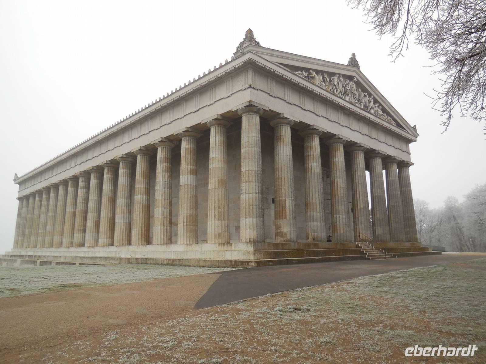 Den ersten Tag des neuen Jahres beginnen wir mit einem ausgiebigen Frühstück. Dann heißt es Koffer laden, denn es geht schon wieder auf Heimreise. Doch bevor wir so richtig durch starten führt uns unsere Fahrt hinüber zur Ruhmeshalle der „Teutschen". Die Walhalla hoch über dem Donautal gelegen hat man in den vergangenen Jahren einer „Schönheitskur" unterzogen. Von der großen Freitreppe aus hat man einen schönen Blick hinunter ins Donautal und bei klarer Sicht bis hinüber nach Regensburg. Kronprinz Ludwig von Bayern fasste den Plan, die „rühmlich ausgezeichneten Teutschen" in einem Ehrentempel zu vereinen. Für den Bau hatte er das griechische Tempelschema vorgeschrieben. Leo von Klenze, der Architekt, gestaltete die Außenarchitektur der Walhalla nach dem Vorbild des Parthenon auf der Akropolis in Athen. Im Inneren der Ruhmeshalle stehen Marmorbüsten und an den Wänden sind Marmortafeln angebracht. Es ist eine „Versammlung" von Persönlichkeiten die von deutscher und europäischer Geschichte zeugen.