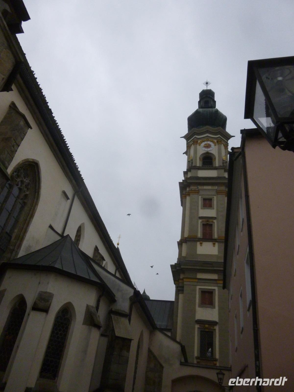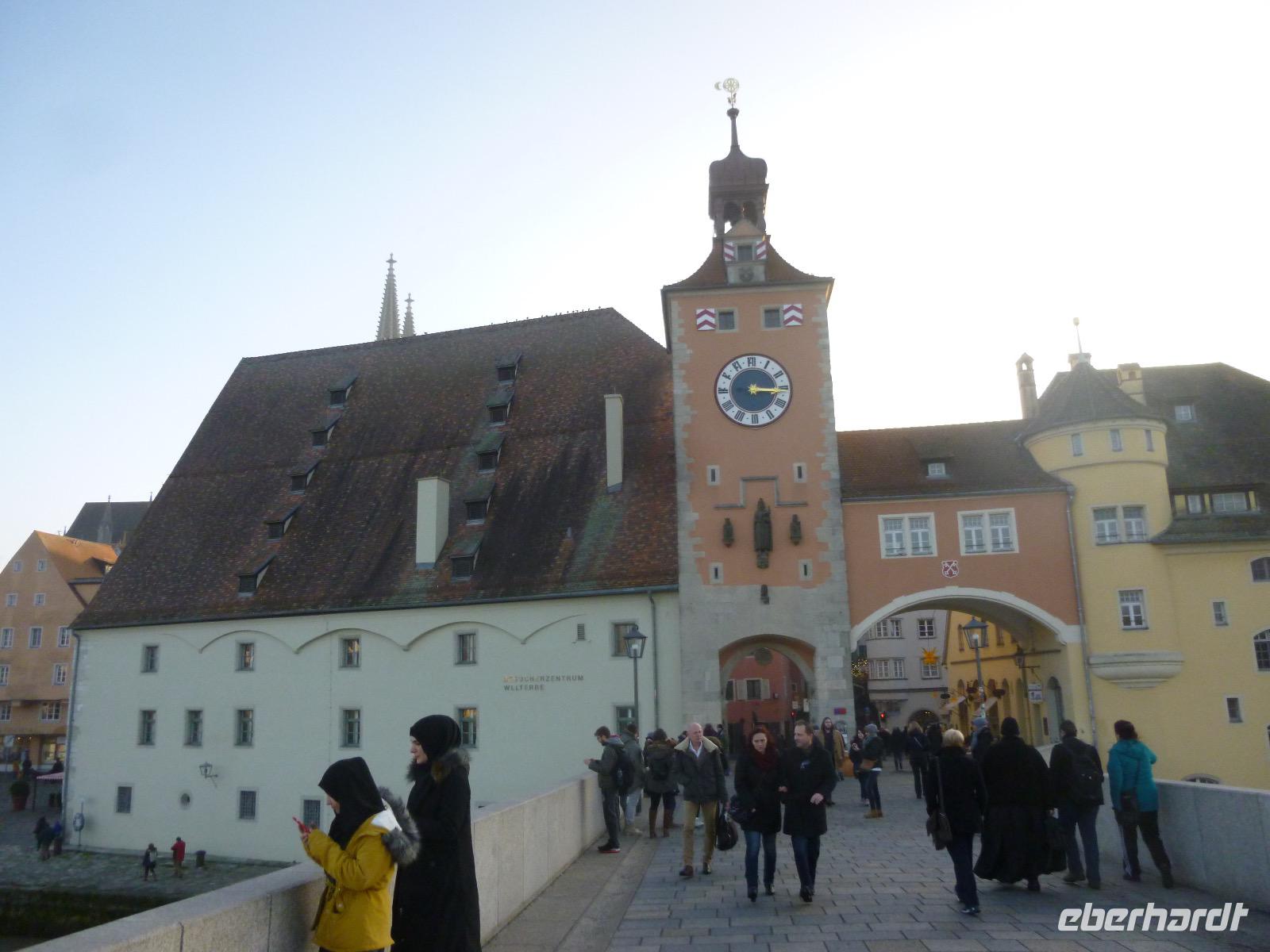 Nach der Anreise aus Dresden startet unsere Stadtrundfahrt mit CITY TOUR eine knappe Stunde durch die Altstadt von Regensburg: die historische Altstadt reicht vom Südufer der Donau, der Regenmündung gegenüber, bis nach Süden. Diese günstige Lage an den Mündungen von Regen und Naab in die Donau machte die Stadt frühzeitig zum Handels- und Verkehrsknotenpunkt. Die Altstadt blieb bis heute im Kern so kompakt und mit kurzen Wegen, da bis zum 19. Jahrhundert die Mauern des römischen Castrum die Umrisse und Größe der Stadt vorgaben. Wir erreichten über das am Nordufer gelegene Stadtamhof mit dem „Walhallabockerl" und dem Katharinenstift die fertig restaurierte berühmte steinerne Brücke. An ihrem Fuße befindet sich im ehemaligen Salzstadl die Touristeninfo und daneben die Wurstkuchl, von da aus waren es vorbei am römischen Prätoriertor und am Kräuterermarkt mit Bischofssitz nur wenige Minuten bis zum Domplatz, wo nach einer kurzen Dombesichtigung unsere CITY TOUR Rundfahrt im warmen Zug begann.