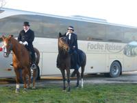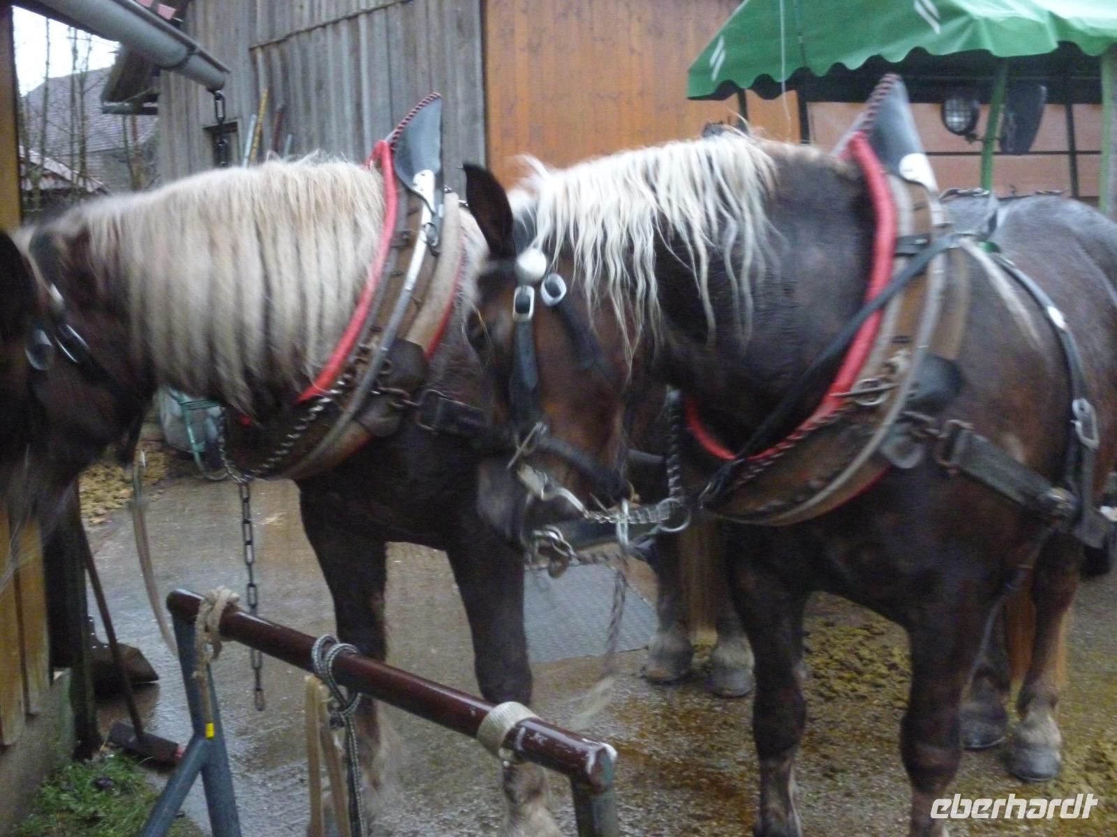 Auf das Angenehmste gesättigt fuhren wir etwa eineinhalbe Stunde weiter zum Michlbauern nach Röhrnbach nahe der böhmischen Grenze. Dort erwartete uns bei nasskaltem Wetter ein Ausflug mit den Kaltblütern, die kräftig die beiden Wagen über die Hügel zogen. Dann kehrten wir auf dem Hof ein zu Musik vom Wirt, wärmenden Getränken und kräftiger Brotzeit und erlebten einen humorvollen Abend mit so manchem Gaudi vom Michlbauern.
