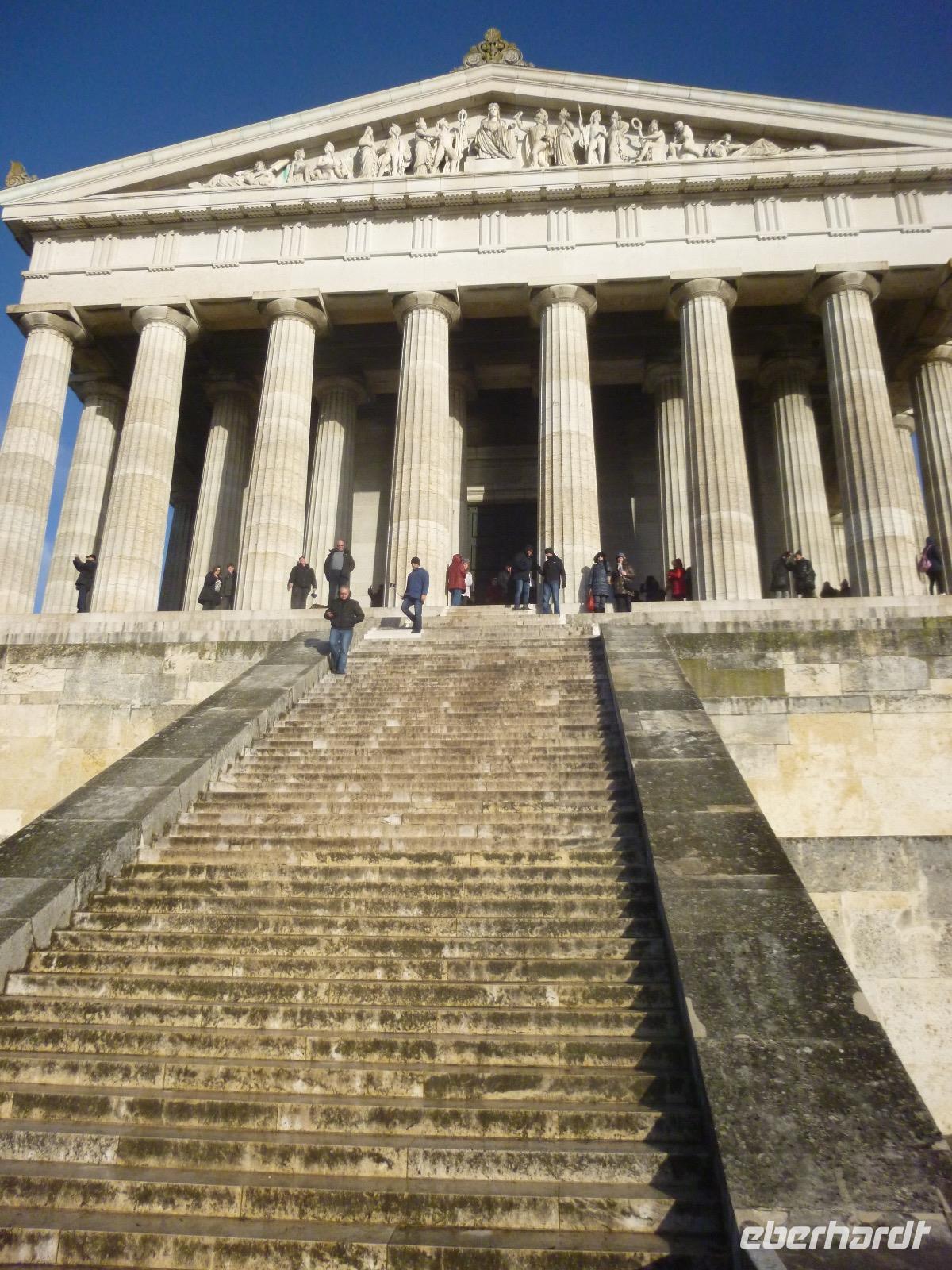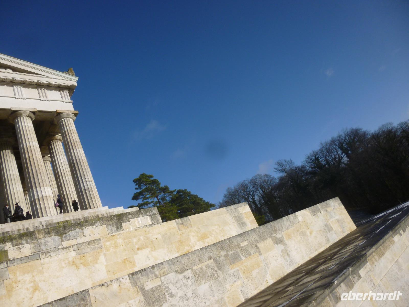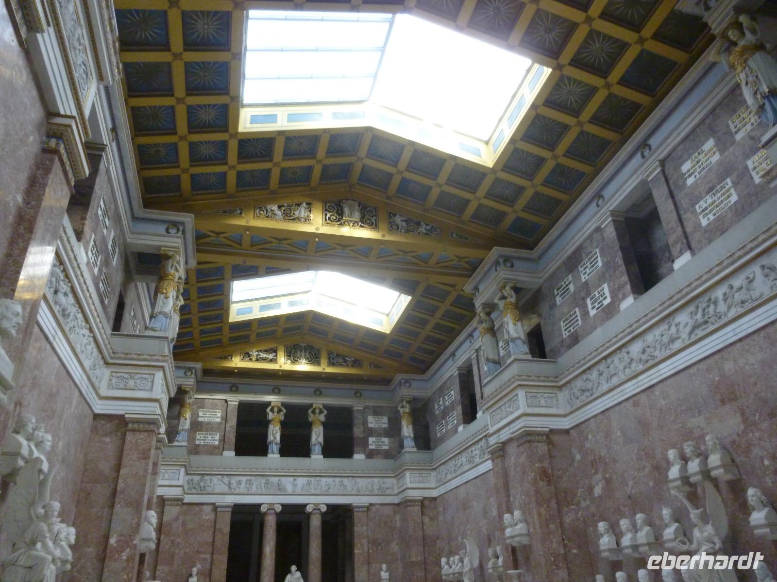 Oben auf dem 405 Meter hohen Bräuberg liegt malerisch die Walhalla, eine Nachbildung des Athener Parthenon in Kehlheimer Marmor. Unsere Gästeführererin erzählte Geschichten über deren Entstehung sowie Ludwig den I. und zeigte uns alle rund 130 Büsten und 64 Gedenk-Tafeln, prunkvoll in Marmor gearbeitet. Weitere Vorschläge sind der Akademie der Wissenschaften in München willkommen, doch müssen 20 Jahre nach dem Tod des Künstlers oder Wissenschaftlers deutscher Zunge vergangen sein und zahlen muss auch der Vorschlagende. Also gut überlegen!