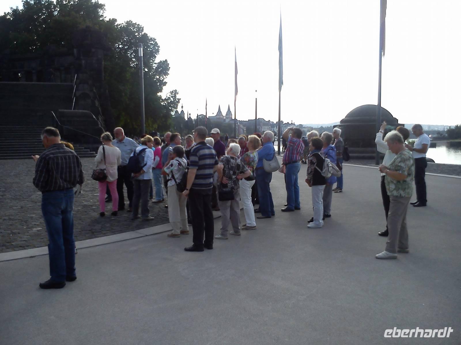 Voller Erwartungen startete am zeitigen Vormittag unser Bus in Dresden Richtung Winterburg. In Hainichen, Chemnitz, Meerane, Gera, an der Raststätte Teufelstal und in Eisenach stiegen noch Gäste zu. Dann war unsere Gruppe vollständig und das Abenteuer „Rhein in Flammen" konnte beginnen. Zusammen mit unserer Reiseleiterin Christina Günther und unserem Buschauffeur Frank Lieberwirth vom Unternehmen Bustouristik Schreiter fuhren wir vorbei an der Skyline von Frankfurt am Main erstmal zum Niederwalddenkmal mit der Germania, welches hoch über den Städten Rüdesheim und Bingen thront. Von dort hatten wir auch einen herrlichen Blick auf das Rheintal mit der Mündung der Nahe in den Rhein. Wir fuhren dann runter in die Stadt Rüdesheim und konnten diese mit ihrer bekannten Drosselgasse erkunden. Nur leider war uns Petrus nicht mehr gut gesonnen und schickte während des Aufenthalts Regen. Aber davon ließen wir uns die Laune nicht vermiesen. Mit der Autofähre setzten wir über den Rhein von Rüdesheim nach Bingen und erreichten am Abend unser zu Hause für die nächsten Tage, das Hotel Beck in Winterburg. Dort wurden wir von der Familie Beck sehr freundlich empfangen und ein leckeres Abendessen wartete auch schon auf uns.
