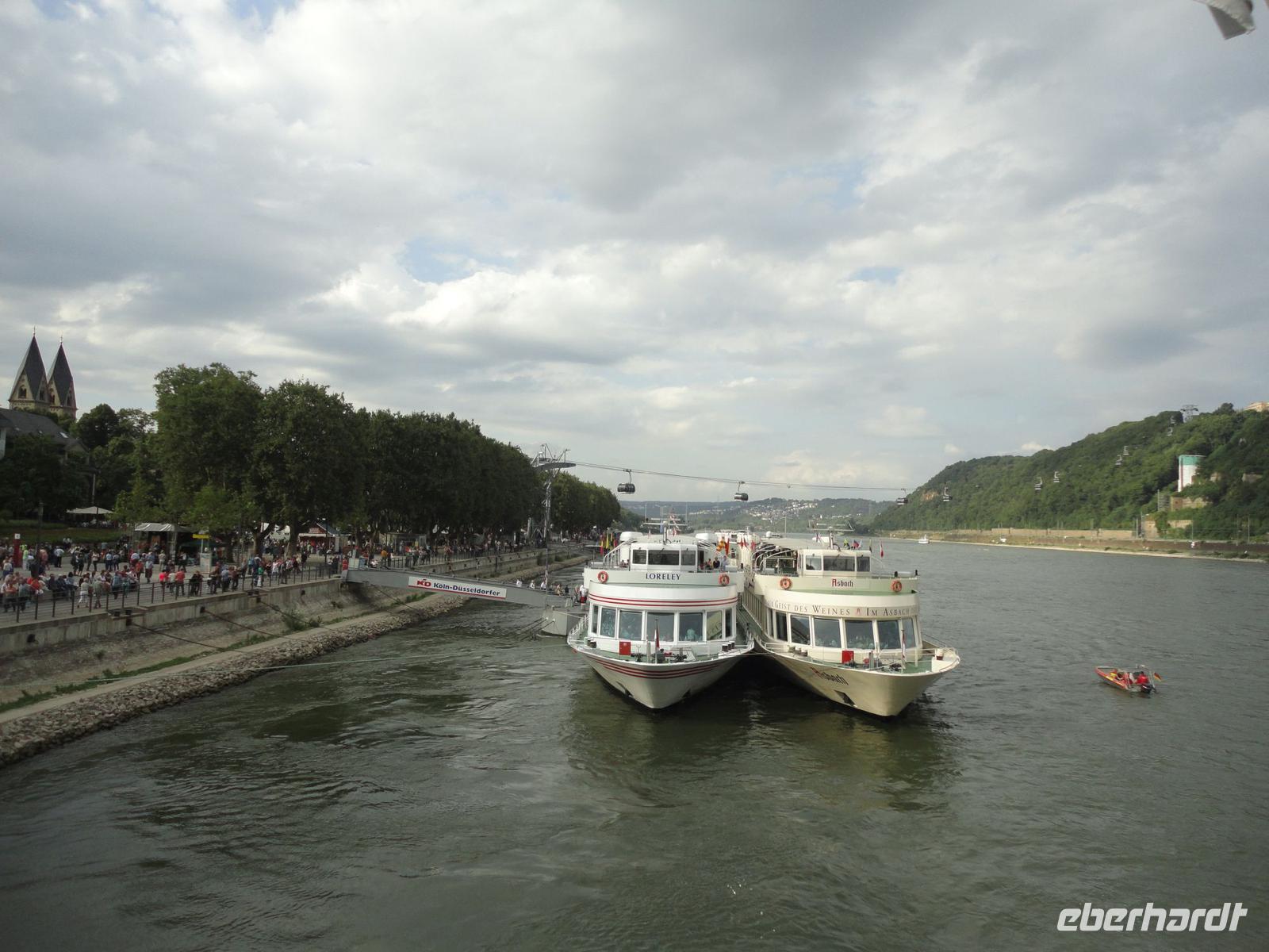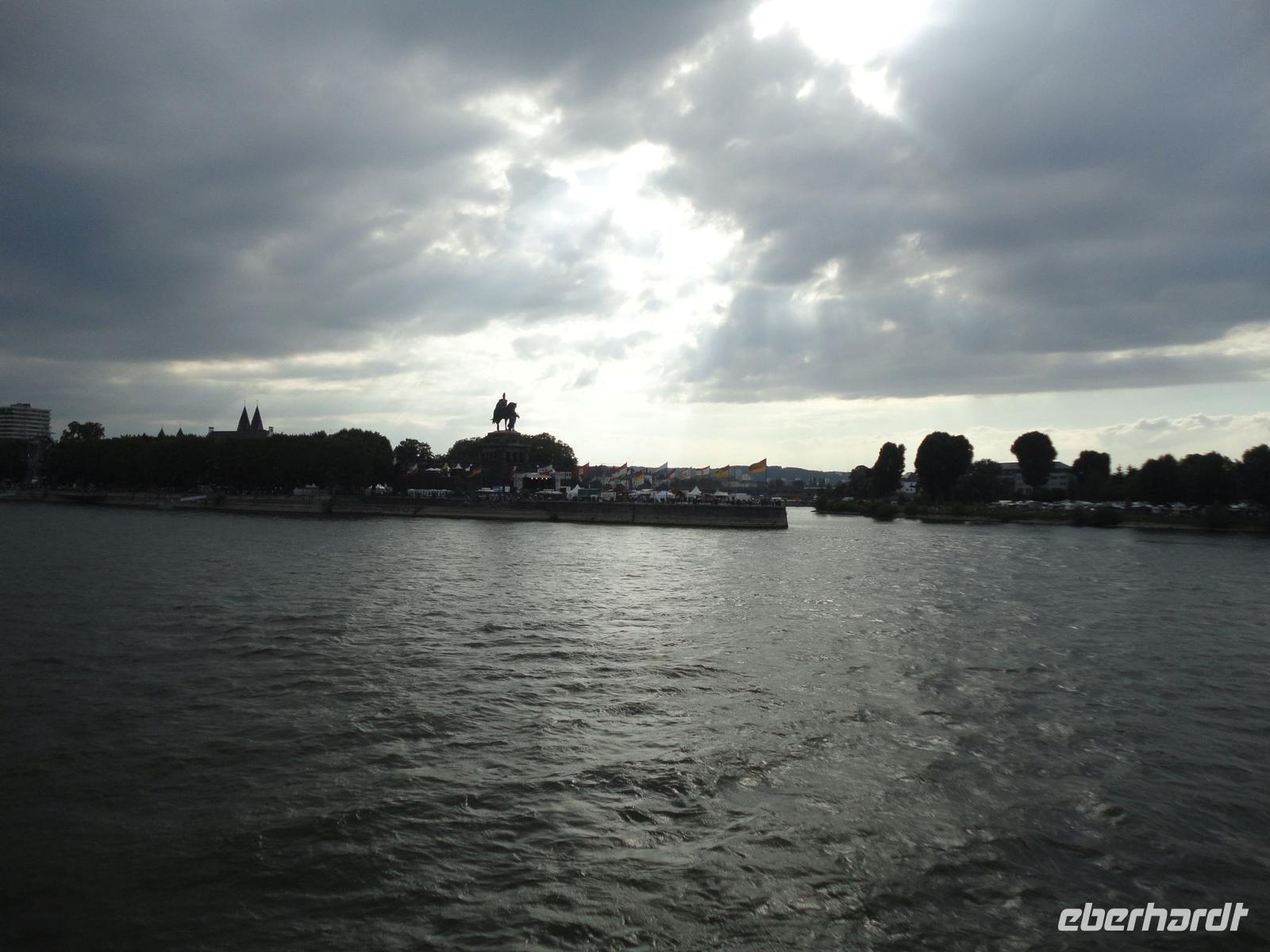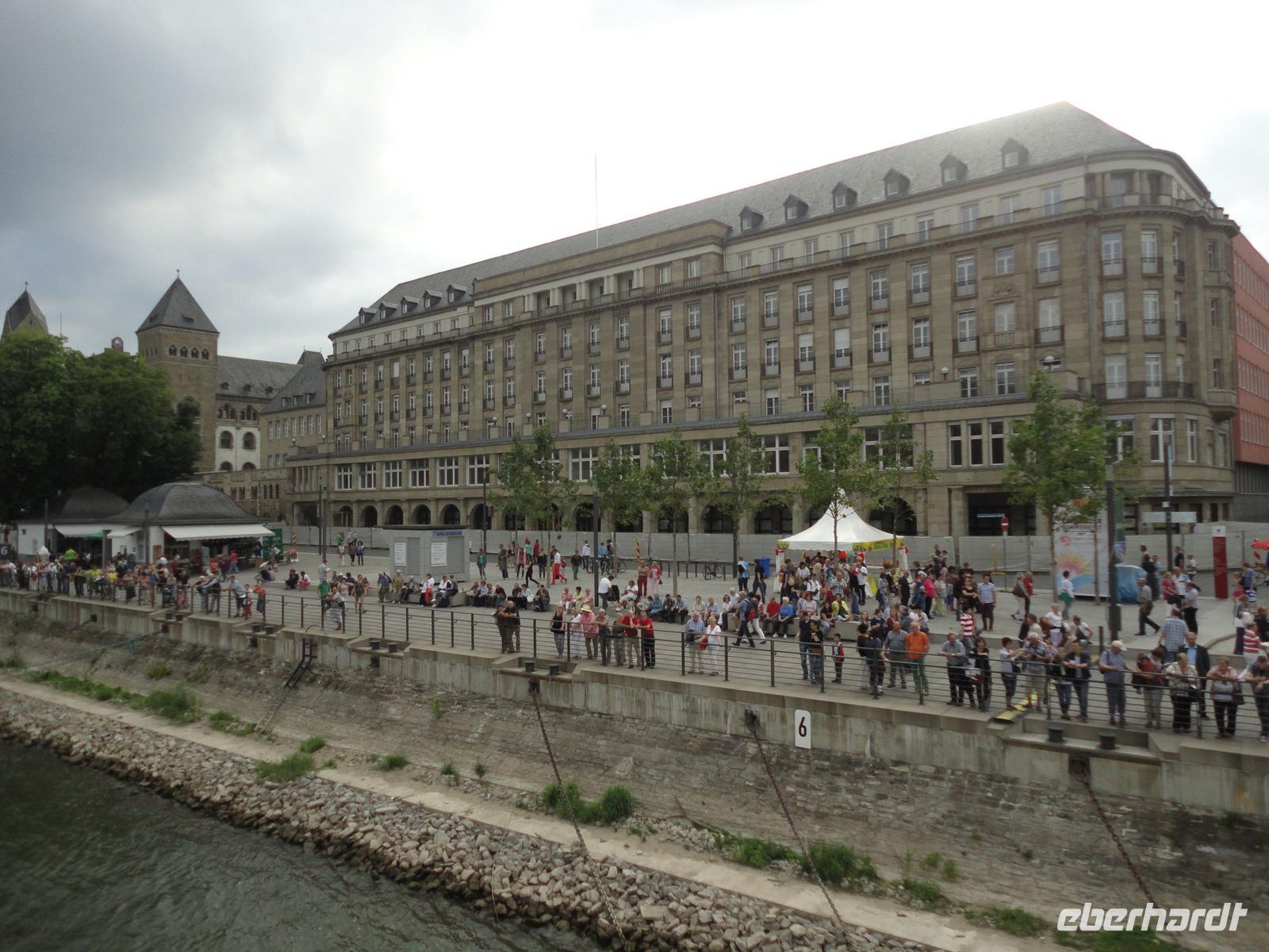 Nach dem leckeren Süppchen, welches wir zum Mittag im Hotel einnahmen, machten wir uns 14:00 Uhr auf den Weg nach Neuwied, da hier unsere "Rheinenergie" an- und ablegen und uns den Rhein in Flammen darbieten sollte. Da ziemlich viele Autos und Busse unterwegs zu diesem Spektakel waren, dauerte es eine kurze Weile, bis wir einen geeigneten Parkplatz in der Nähe des Anlegestelle finden konnten. Doch zum Glück hatten wir unseren Max dabei, der sich bestens auskannte. Volker rangierte in engsten Gassen und setzte uns sicher und höchst beeindruckend am Parkplatz ab. Nun hatten wir noch eine gute halbe Stunde Zeit, am Pier entlang zu spazieren, Käffchen zu trinken oder einfach die Zeit mit Warten zu überbrücken.