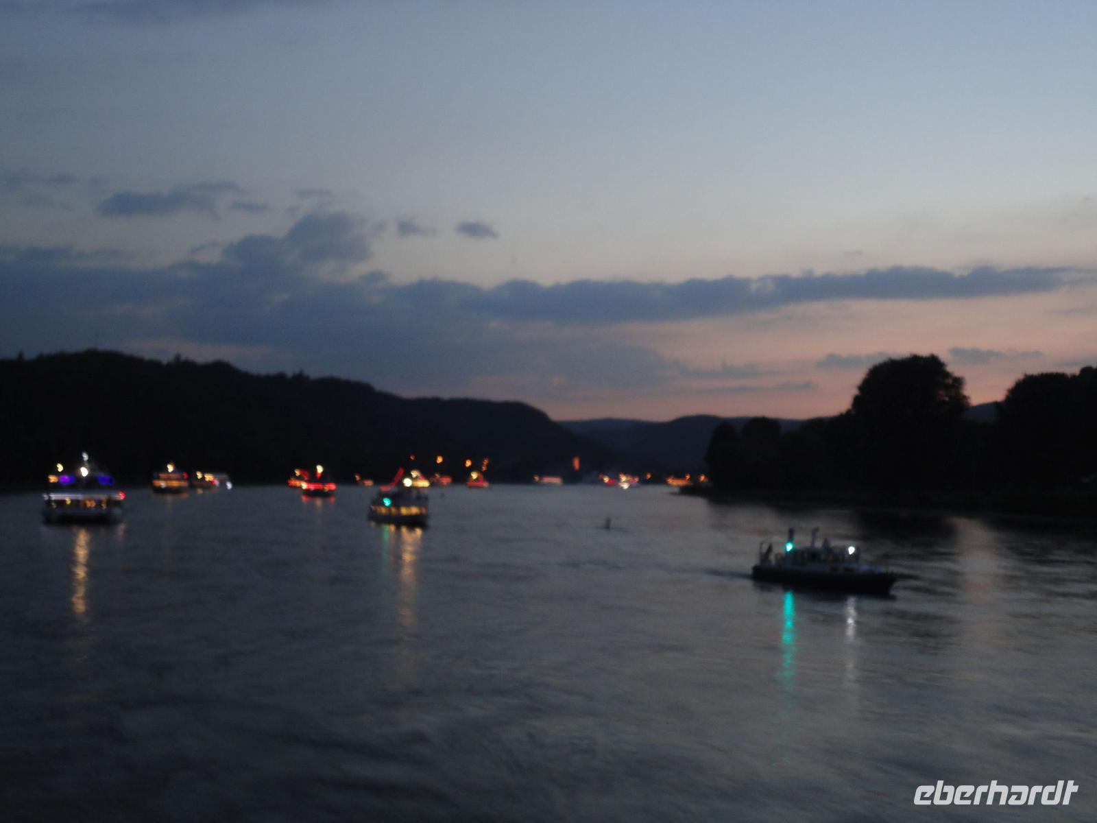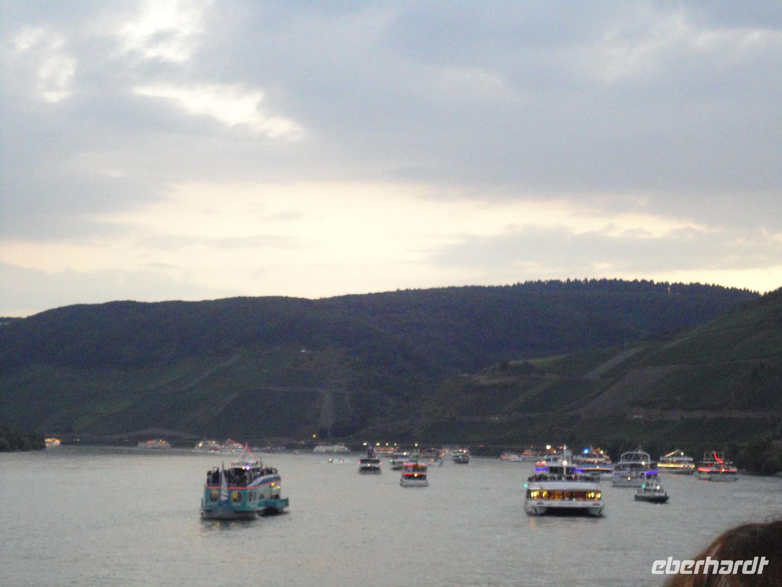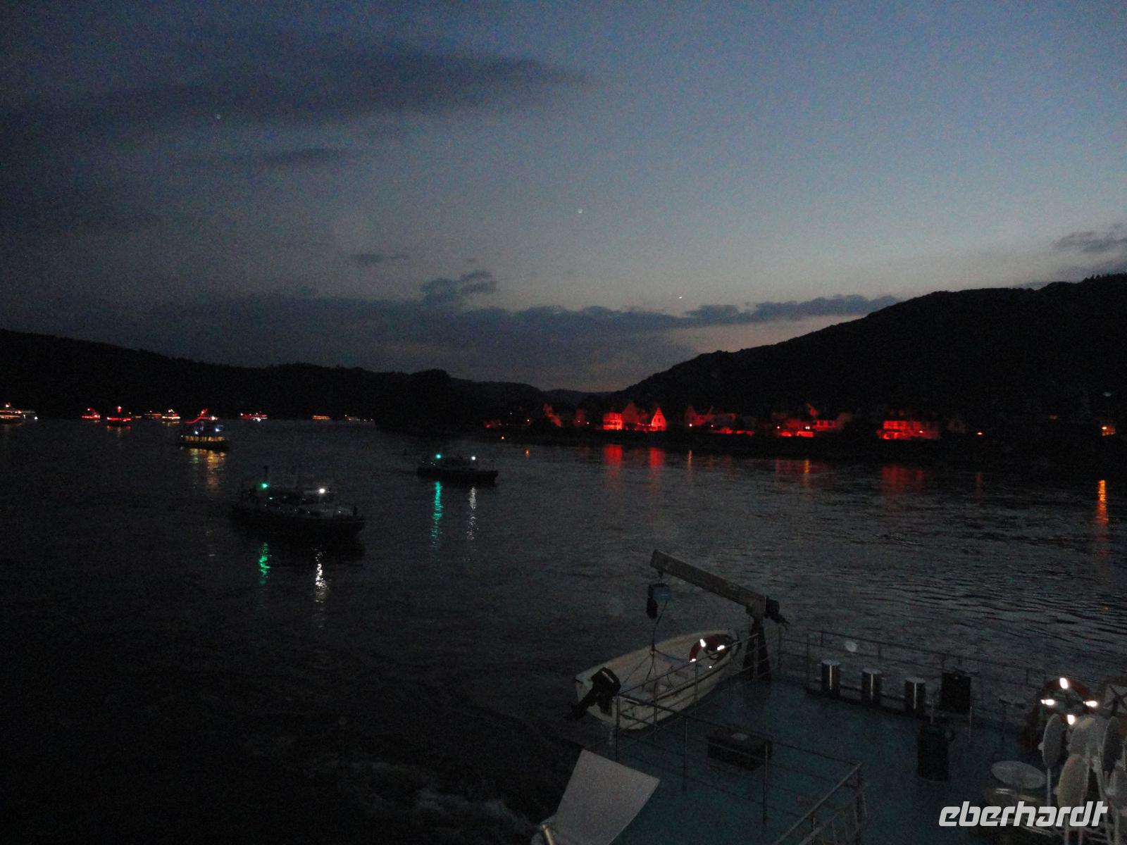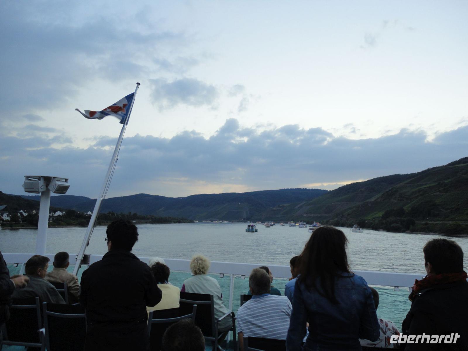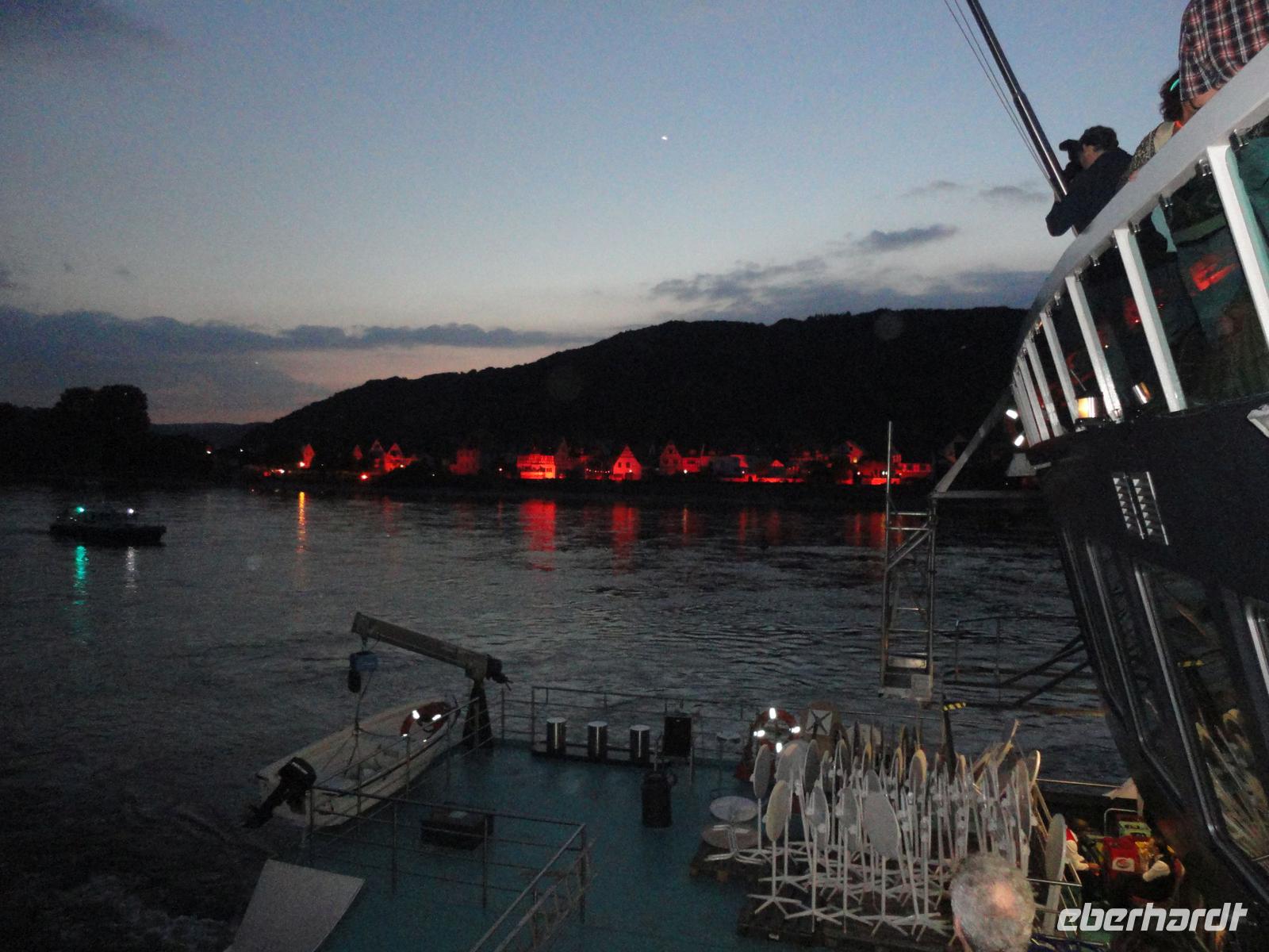 Da wir die Ehre hatten, mit dem größten der Schiffe, welche den Rhein in Flammen erleben sollten, zu fahren, waren wir auch den ganzen Abend über an der Spitze aller Schiffe. Hierdurch hatten wir die beste Sicht auf das abendliche Feuerwerk. An Bord erfreuten wir uns über unsere Spitzenplätze direkt an den Fenstern im ersten Deck. Wir hatten wirklich die beste Aussicht! Natürlich gab es noch das Oberdeck, aber dies würden wir erst später besuchen, nachdem wir uns ausgeruht und ausgiebig gestärkt haben. So verbrachten wir die ersten eins zwei Stündchen bei Kaffee und Kuchen oder anderen Köstlichkeiten und genossen einfach den Ausblick von unseren Plätzen aus. Manche von uns gingen aber auch schon nach oben und suchten in Gedanken bereits einen guten Platz, um das Feuerwerk am Abend bestens ansehen zu können. Nachdem wir nun das Schiff inspiziert hatten, freuten wir uns über das leckere Abendessen, Lende mit Gemüse und Kartoffeln im Brotteig. Langsam wurden wir aufgeregt, rückte das Spektakel doch immer näher. Viele von uns hielt es schon nicht mehr auf den warmen Plätzen, wir mussten einfach hoch aufs Oberdeck und die frische Luft und tolle Landschaft genießen.