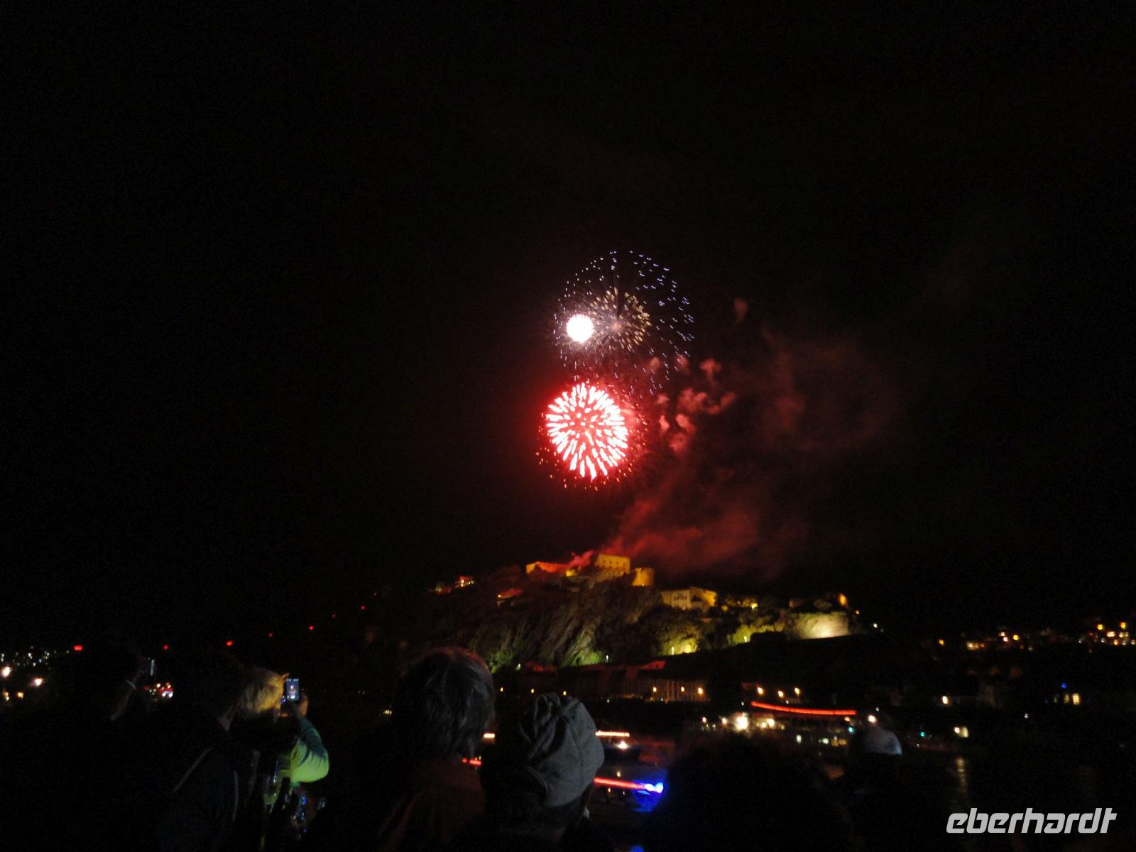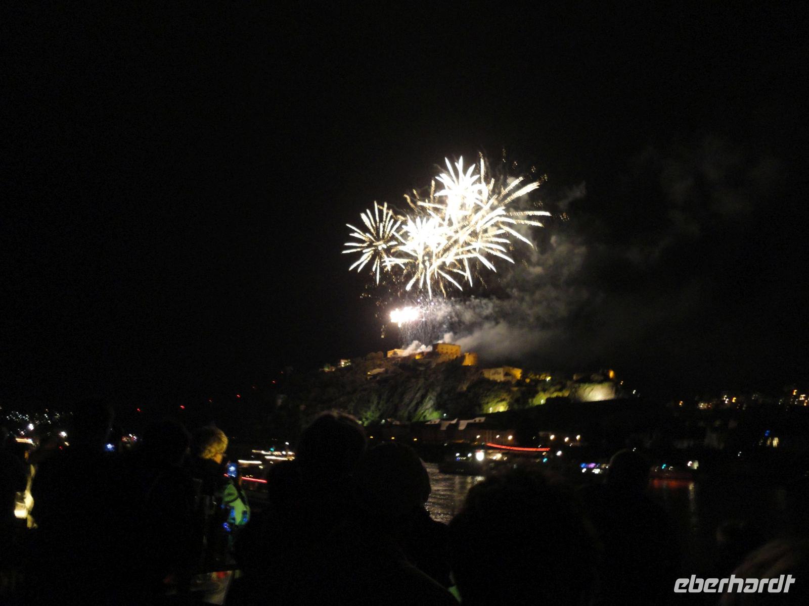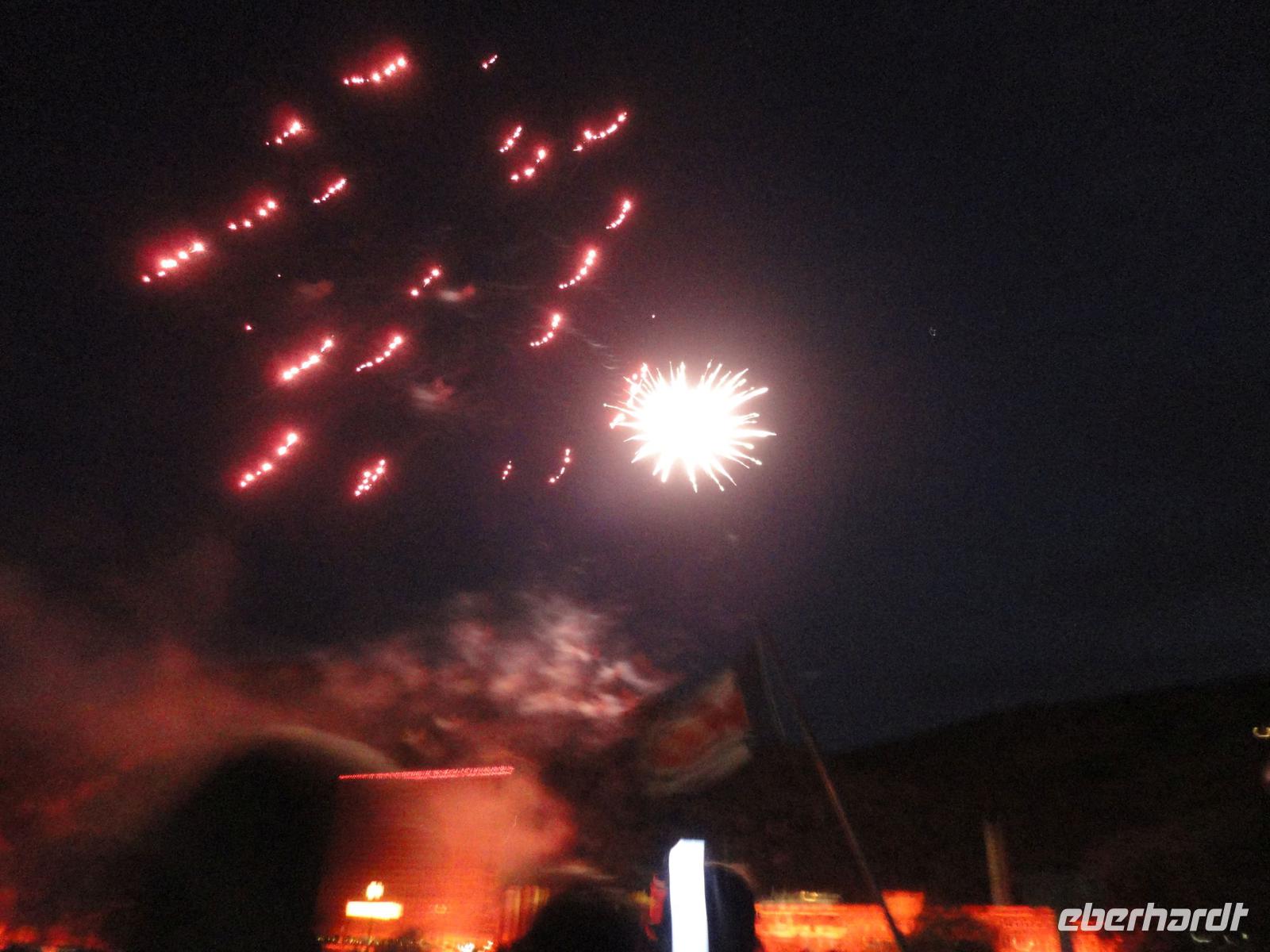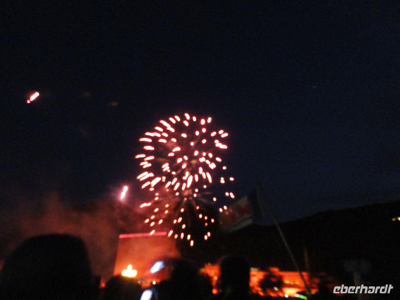 Gegen 21:30 Uhr begannen dann die ersten kleinen Feuerwerke, die bei dem noch nicht ganz dunkel gewordenen Himmel aber bereits bezaubernd wirkten. Wir konnten uns auf das kommende große Feuerwerk wirklich freuen. Pünktlich um 23:00 Uhr war es dann auch endlich so weit. Musik ging an, die Stimmung war perfekt und ein atemberaubend schönes Feuerwerk erfreute unsere Gemüter. Musik und Einsatz der Feuerwerke waren wirklich perfekt aufeinander abgestimmt. So bleibt uns nur noch zu sagen: "Freude schöner Götterfunken, Tochter aus Elysium. Wir betreten feuertrunken, himmlische dein Heiligtum. Deine Zauber finden wieder, was die Mode streng geteilt. Alle Menschen werden Brüder, wo dein sanfter Flügel weiht."