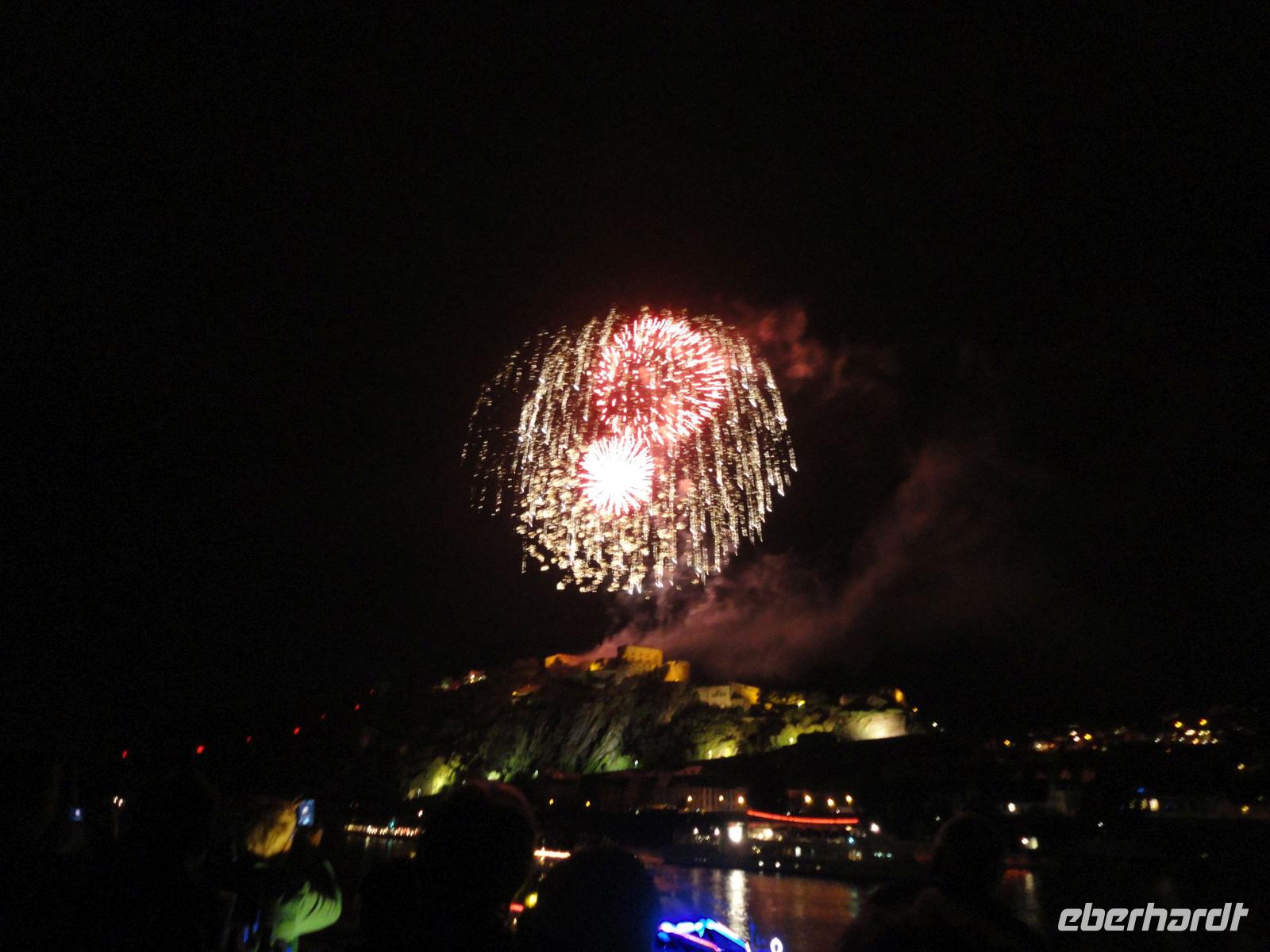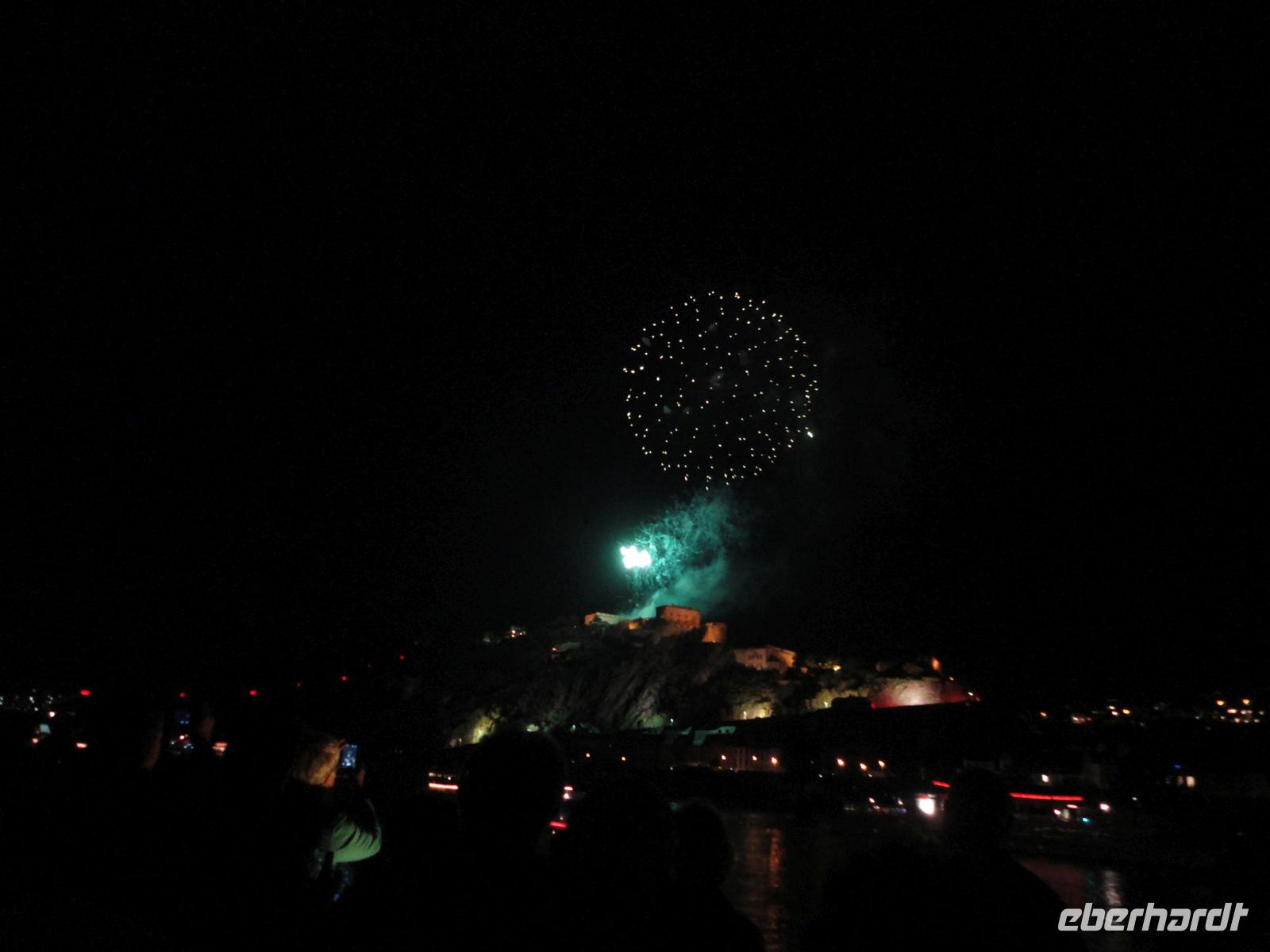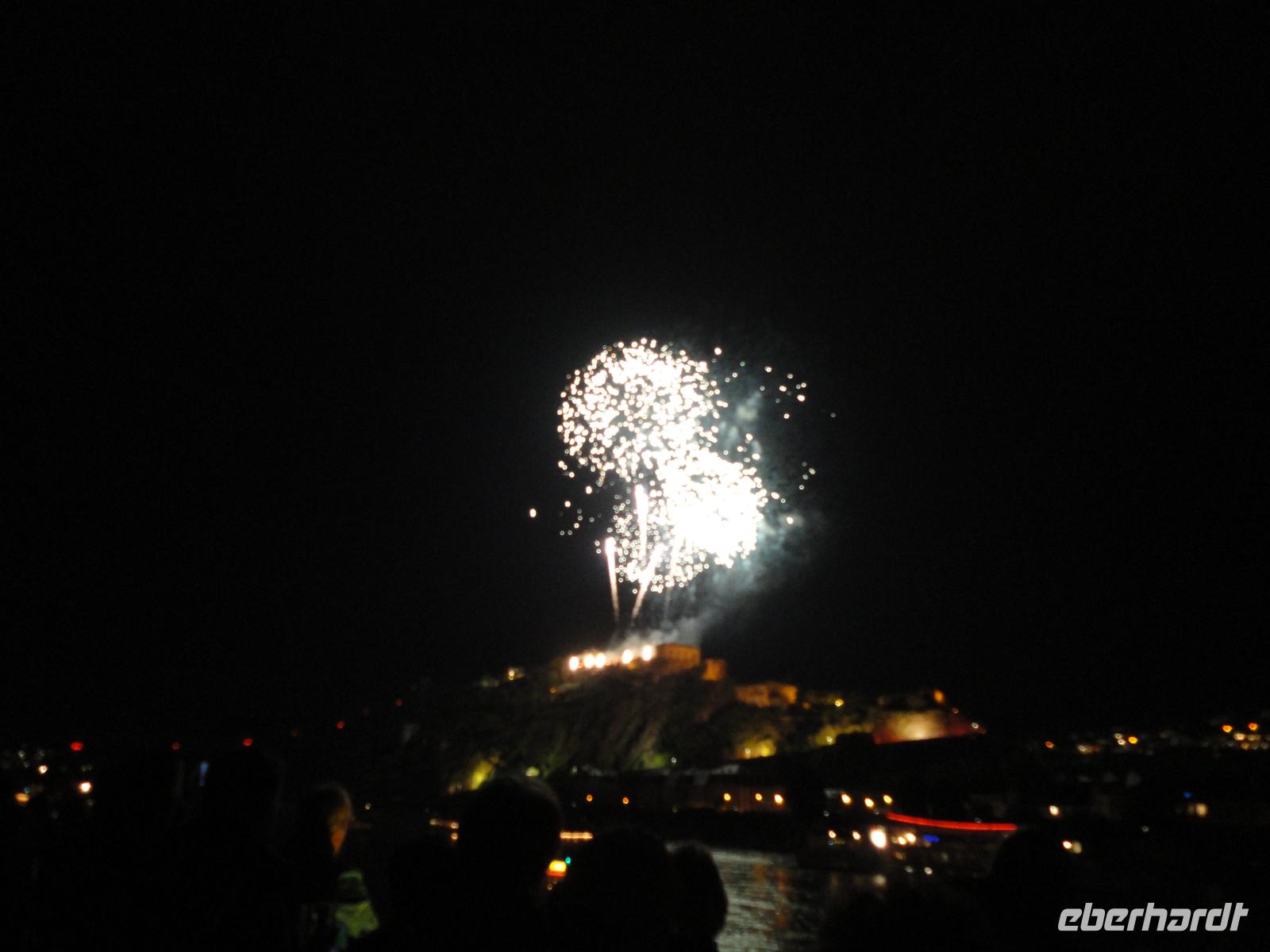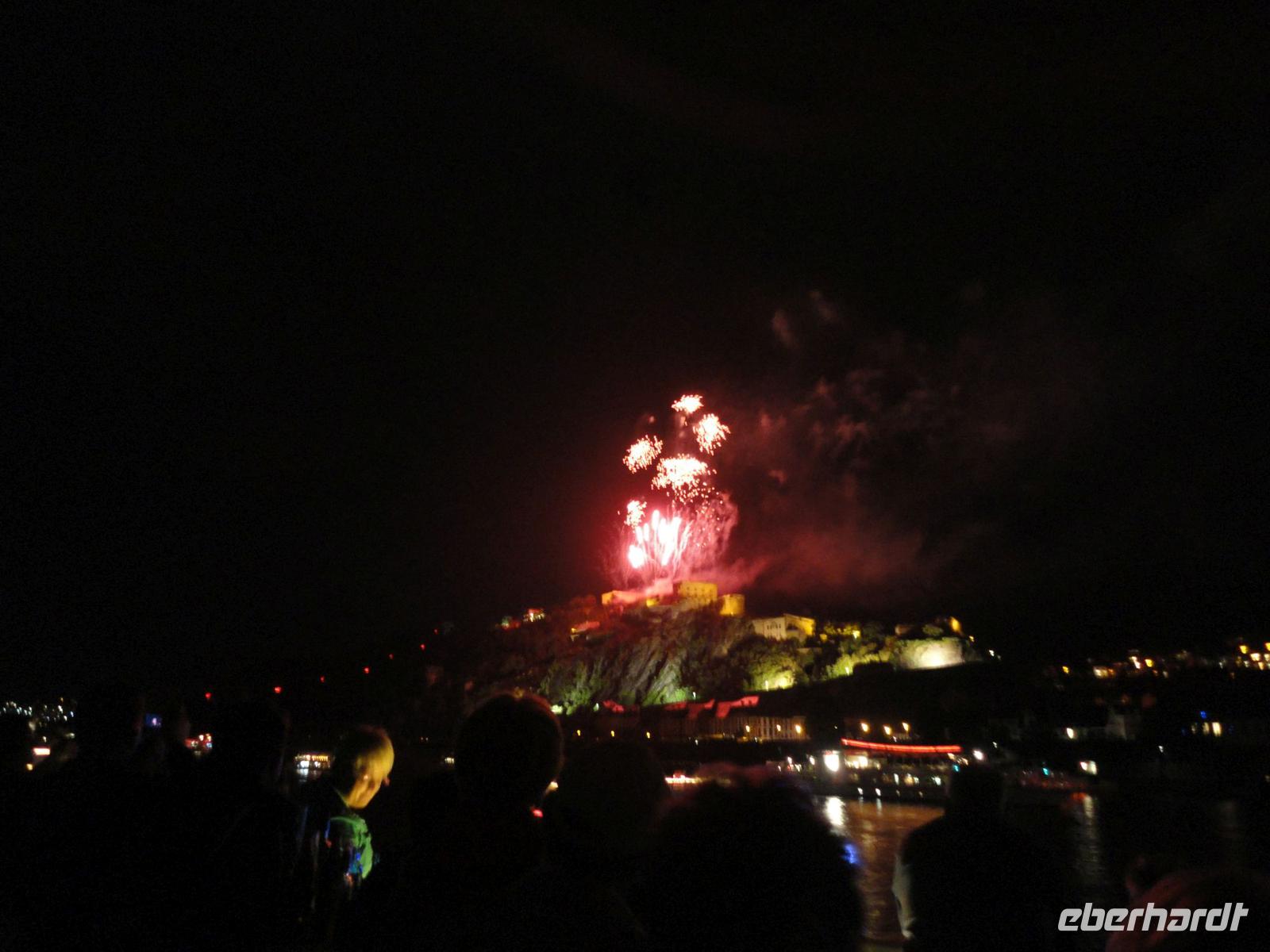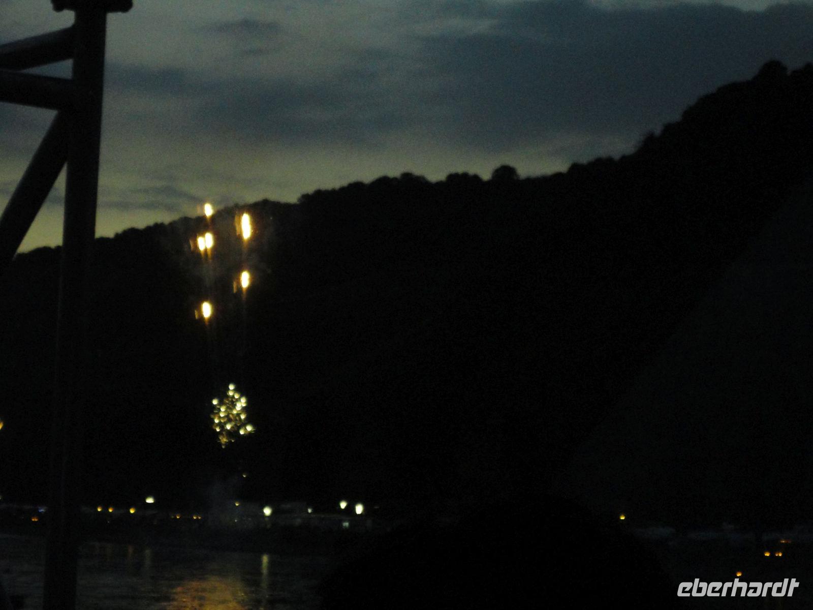Gegen 21:30 Uhr begannen dann die ersten kleinen Feuerwerke, die bei dem noch nicht ganz dunkel gewordenen Himmel aber bereits bezaubernd wirkten. Wir konnten uns auf das kommende große Feuerwerk wirklich freuen. Pünktlich um 23:00 Uhr war es dann auch endlich so weit. Musik ging an, die Stimmung war perfekt und ein atemberaubend schönes Feuerwerk erfreute unsere Gemüter. Musik und Einsatz der Feuerwerke waren wirklich perfekt aufeinander abgestimmt. So bleibt uns nur noch zu sagen: "Freude schöner Götterfunken, Tochter aus Elysium. Wir betreten feuertrunken, himmlische dein Heiligtum. Deine Zauber finden wieder, was die Mode streng geteilt. Alle Menschen werden Brüder, wo dein sanfter Flügel weiht."