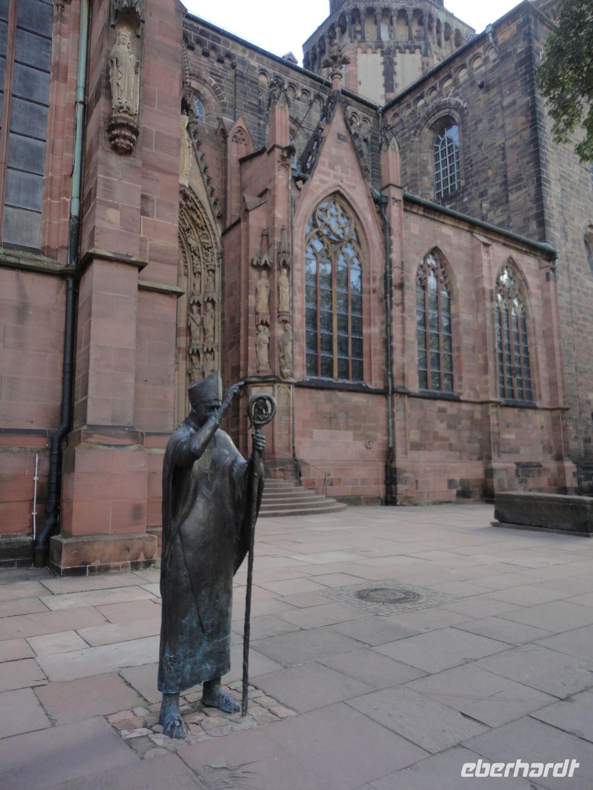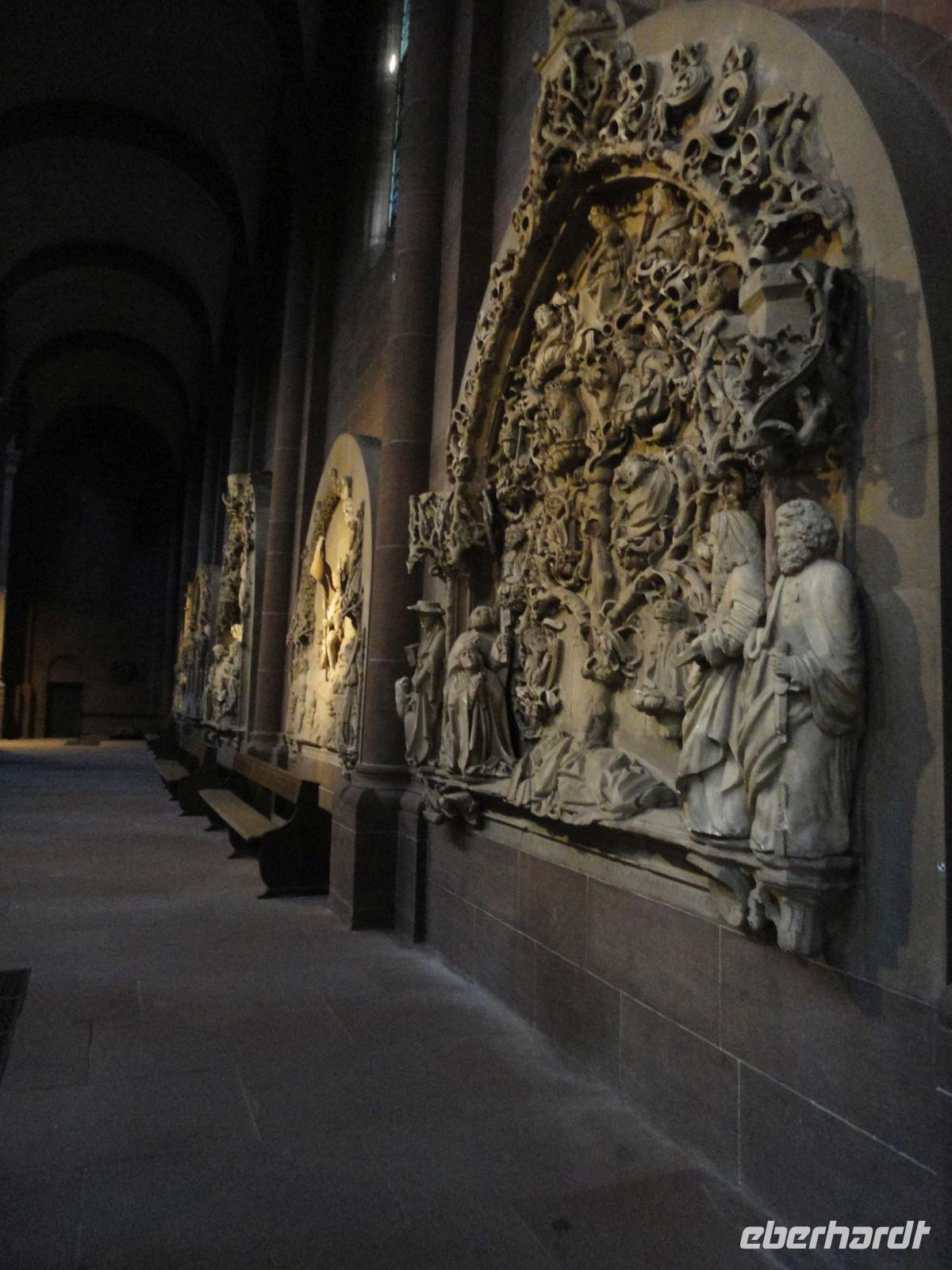 Pünktlich um halb neun fuhren wir bei eisigen 14 Grad Celsius fröstelnd nach Worms, in die Stadt der Nibelungen. Die Fahrt entlang der Mosellandschaft war erneut eine Freude für die Augen. Nach der Ankunft in Worms bei sonnigen 20 Grad Celsius, ging es direkt zur Besichtigung des Kaiserdoms St. Peter, dessen Erbauung bereits im Jahre 600 seinen Ursprung nahm. Eigentlich kann der Wormser Dom nicht mehr als Dom bezeichnet werden, da er kein offizieller Bischofssitz mehr ist. Er trägt diesen Ehrentitel aber noch aus Zeiten, als Worms noch Bischofssitz war. Gemeinsam mit den Domen in Speyer und Mainz, zählt er zu den drei Kaiserdomen, auch wenn er im Vergleich mit diesen beiden Domen der kleinste ist.