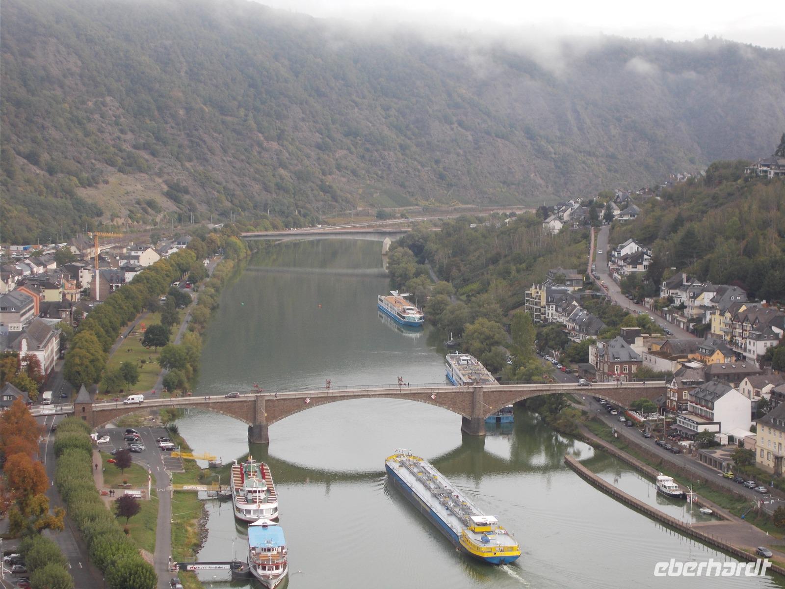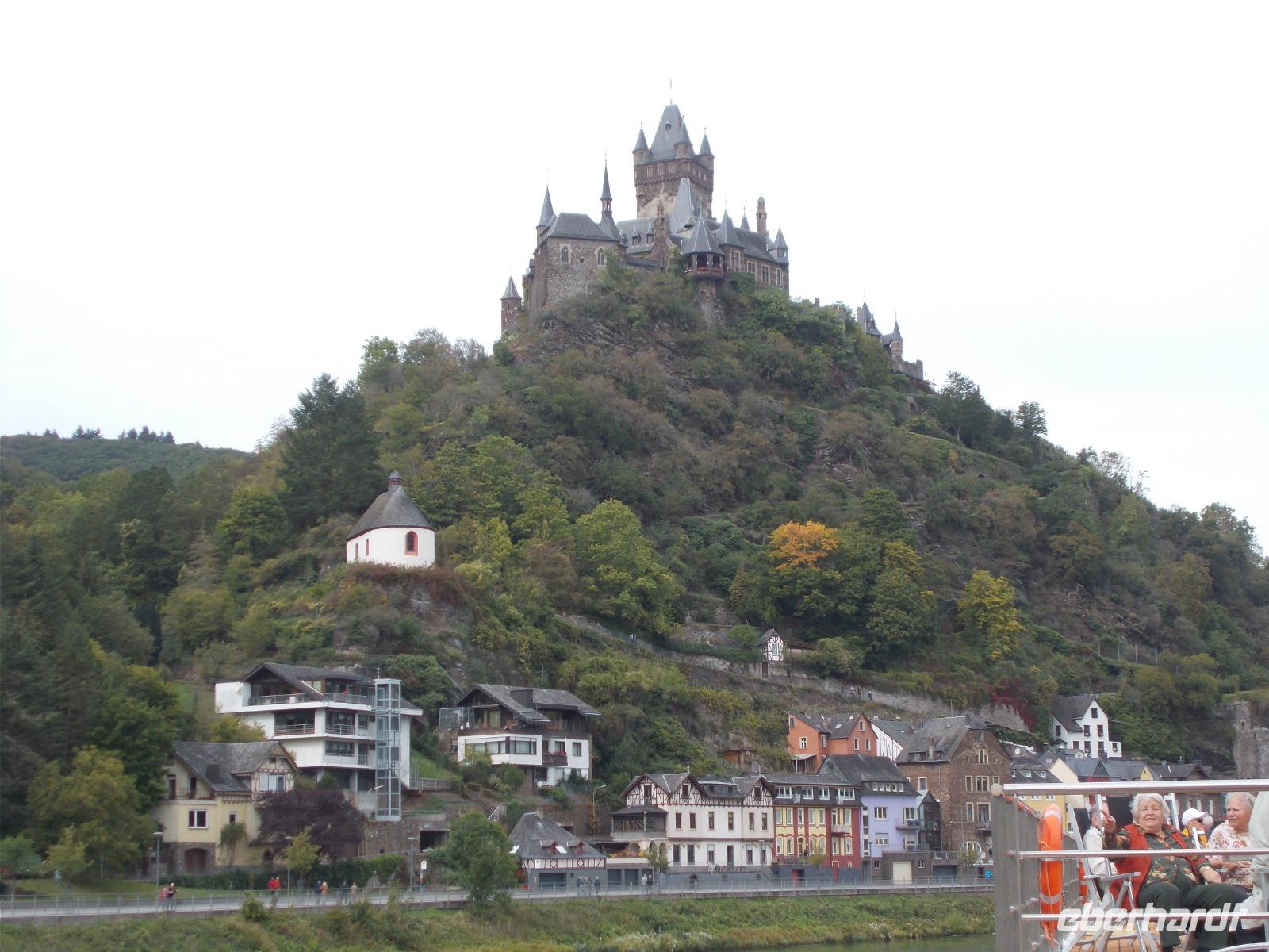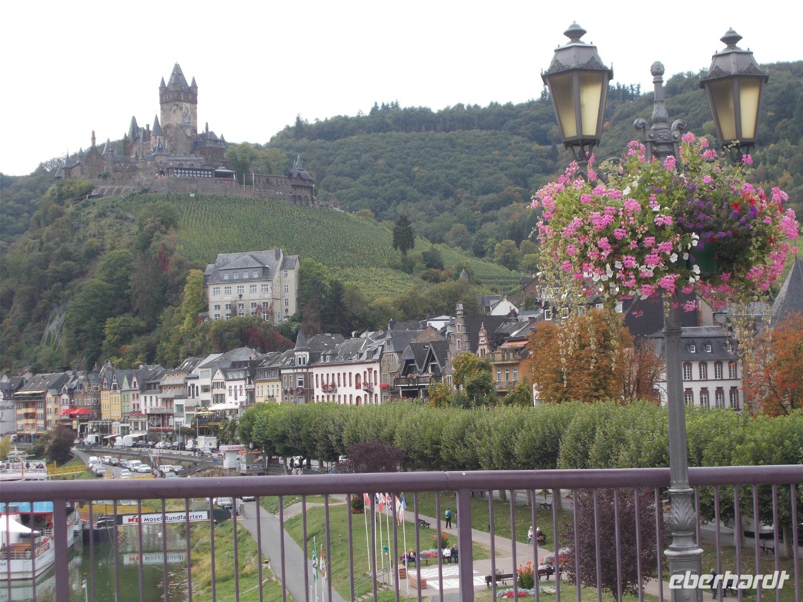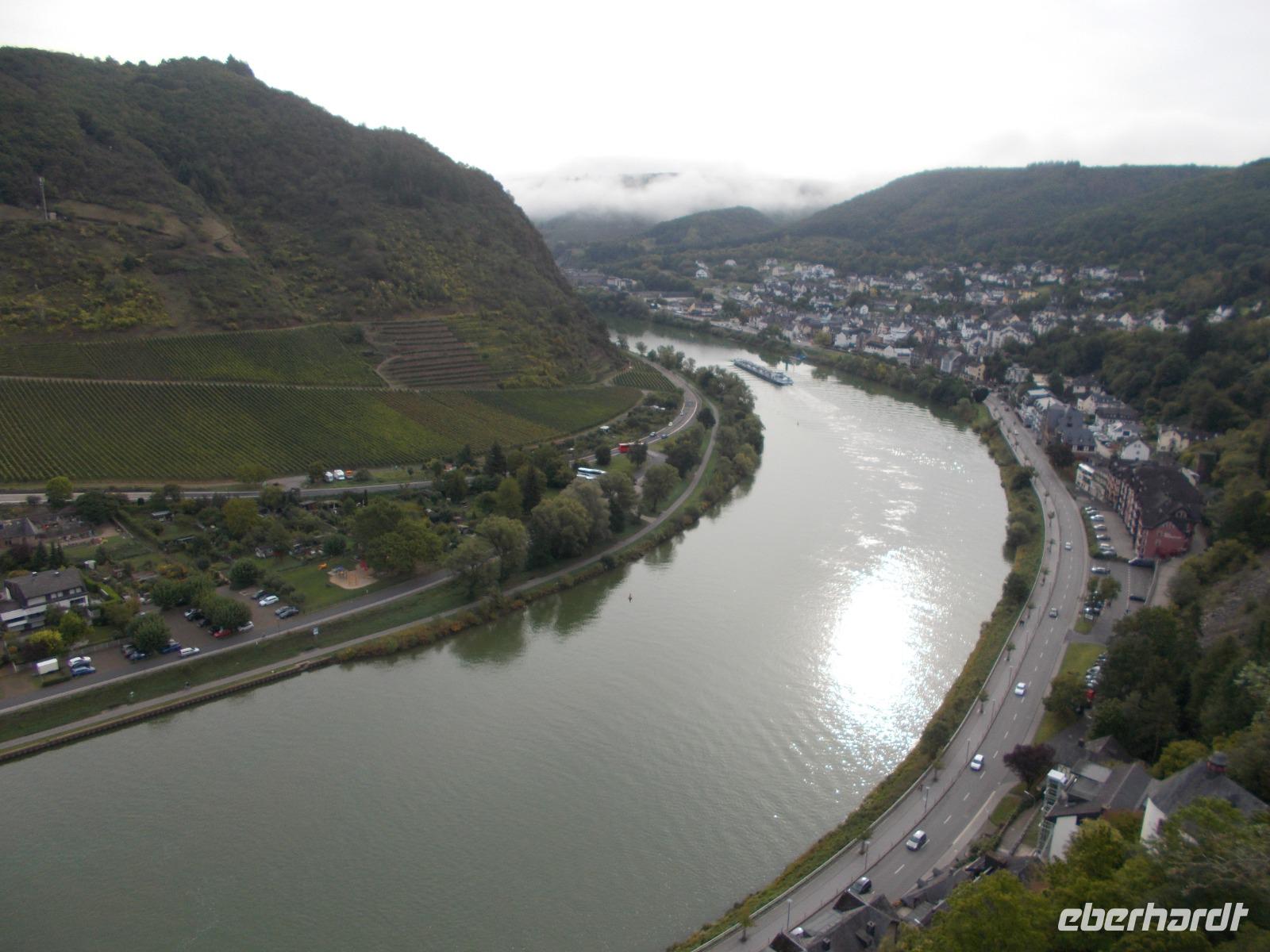 Pünktlich zum Frühstück machten wir in Cochem fest.Die rheinland-pfälzische Stadt ,an der Mosel,war im Frühnebel eingehüllt.Vom Schiff aus hatten wir schon einmal einen tollen Blick auf die Reichsburg,die von den Pfalzgrafen als Zollburg diente.Bequem wurden wir mit einem Kleinbus,vom Schiff zum Burgtor,chauffiert.Im Moseltal gab es früher viele bewohnte Burgen,die leider 1689 von französischen Truppen zerstört wurden. Glücklicherweise gefiel die Ruine dem Berliner Kaufmann, Louis Ravene'und er ließ sie 1868 wiederaufbauen.Wir schauten uns staunend in seinem Sammelsurium mit seinen vielen Geheimtüren um.Einen ganz besonderen Blick vom Balkon aus,hatten wir auf die Moselschleife bei Cochem.Es folgte eine Stadtführung durch die engen verwinkelten Gassen.In den schönen Fachwerkhäusern lockten ganz viele Cafes und Weinstuben zum Verweilen ein.Ein Bummel über die Moselbrücke führte uns zurück zum Schiff. Mit einsetzendem Regen passierten wir den steilsten Weinberg Europas ,den Bremmer Calmont und einige der 10 Schleusen auf der Mosel. Den Nachmittag verbrachten wir bei Kaffee und Kuchen in der Panorama Bar.Verkürzt wurde uns die Zeit ,durch einen sehr interessanten Vortrag, über das" Auf und Ab"auf Wasserstraßen.