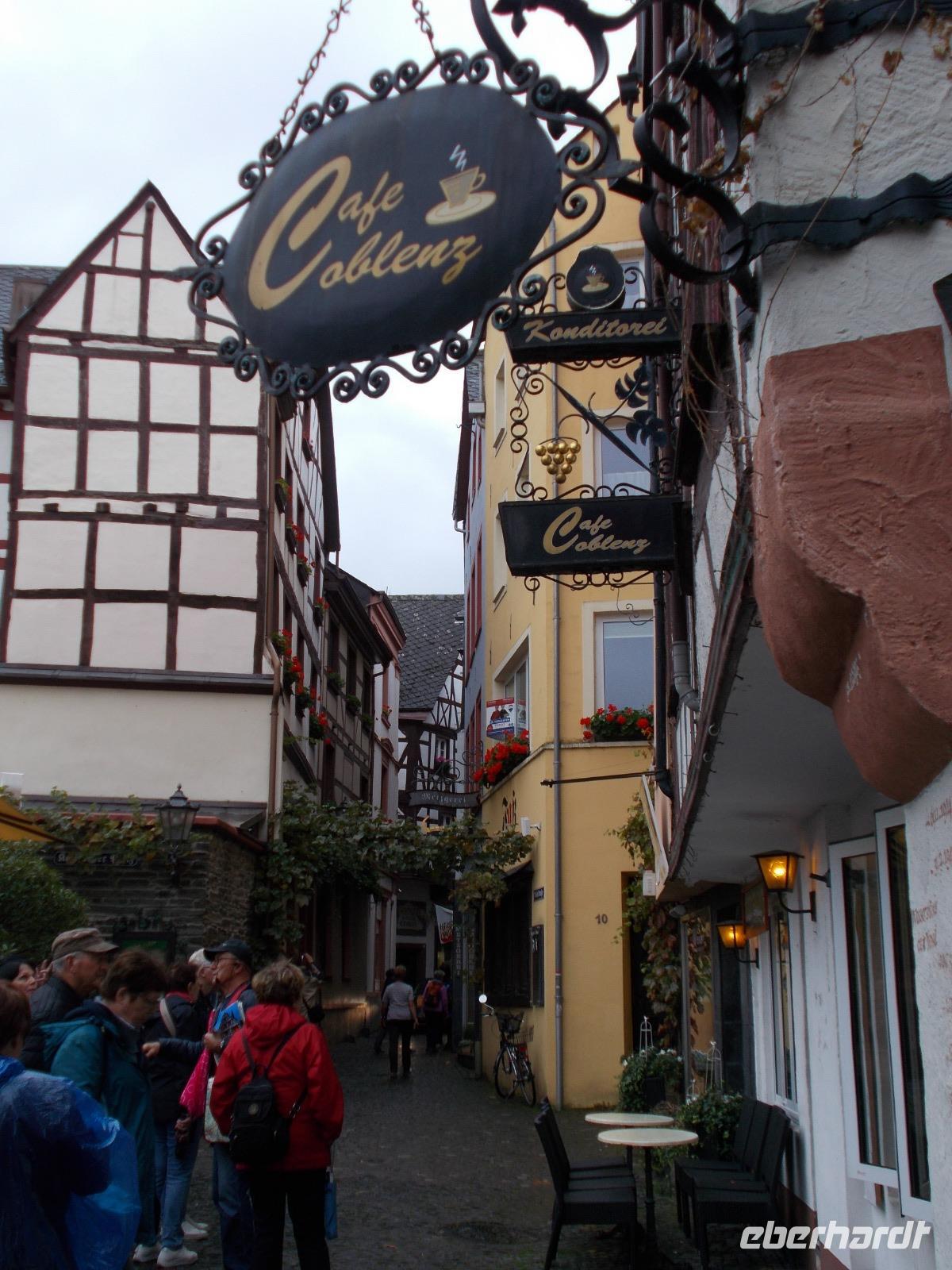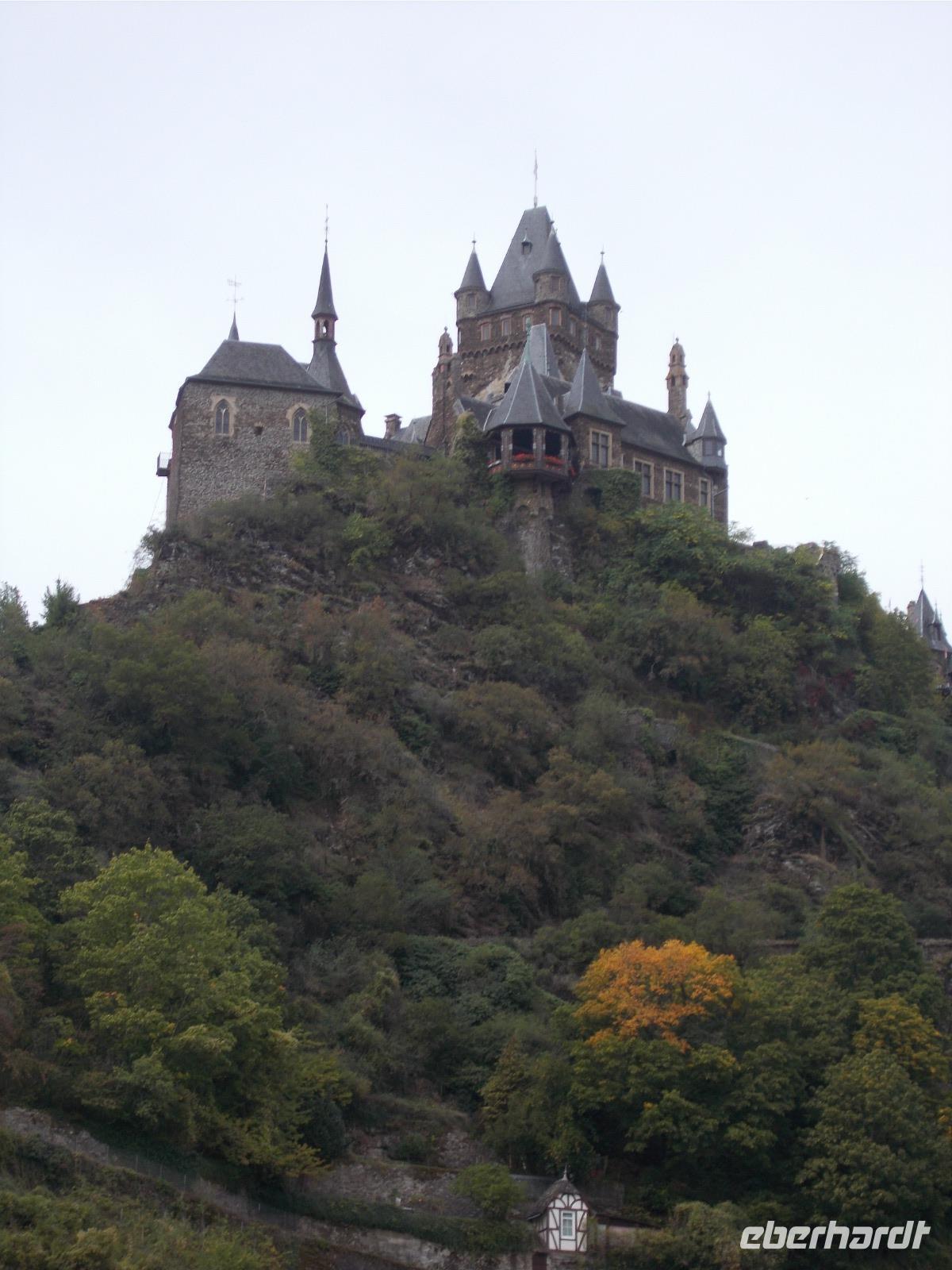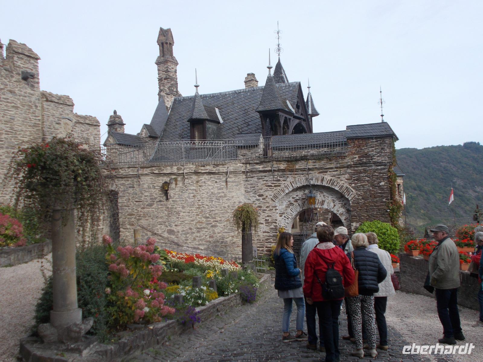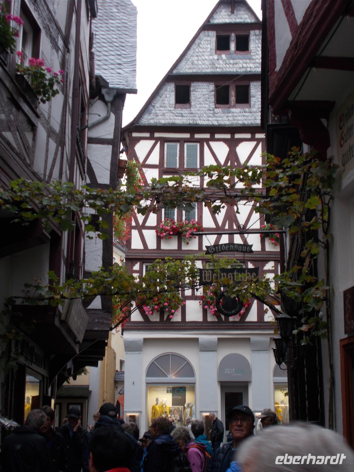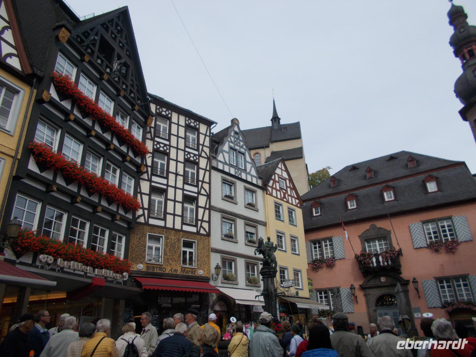 Pünktlich zum Frühstück machten wir in Cochem fest.Die rheinland-pfälzische Stadt ,an der Mosel,war im Frühnebel eingehüllt.Vom Schiff aus hatten wir schon einmal einen tollen Blick auf die Reichsburg,die von den Pfalzgrafen als Zollburg diente.Bequem wurden wir mit einem Kleinbus,vom Schiff zum Burgtor,chauffiert.Im Moseltal gab es früher viele bewohnte Burgen,die leider 1689 von französischen Truppen zerstört wurden. Glücklicherweise gefiel die Ruine dem Berliner Kaufmann, Louis Ravene'und er ließ sie 1868 wiederaufbauen.Wir schauten uns staunend in seinem Sammelsurium mit seinen vielen Geheimtüren um.Einen ganz besonderen Blick vom Balkon aus,hatten wir auf die Moselschleife bei Cochem.Es folgte eine Stadtführung durch die engen verwinkelten Gassen.In den schönen Fachwerkhäusern lockten ganz viele Cafes und Weinstuben zum Verweilen ein.Ein Bummel über die Moselbrücke führte uns zurück zum Schiff. Mit einsetzendem Regen passierten wir den steilsten Weinberg Europas ,den Bremmer Calmont und einige der 10 Schleusen auf der Mosel. Den Nachmittag verbrachten wir bei Kaffee und Kuchen in der Panorama Bar.Verkürzt wurde uns die Zeit ,durch einen sehr interessanten Vortrag, über das" Auf und Ab"auf Wasserstraßen.