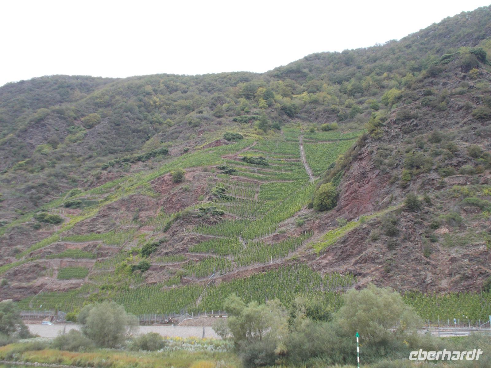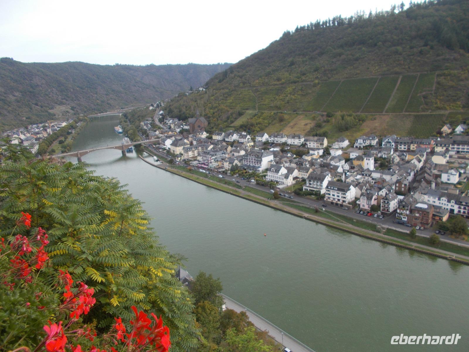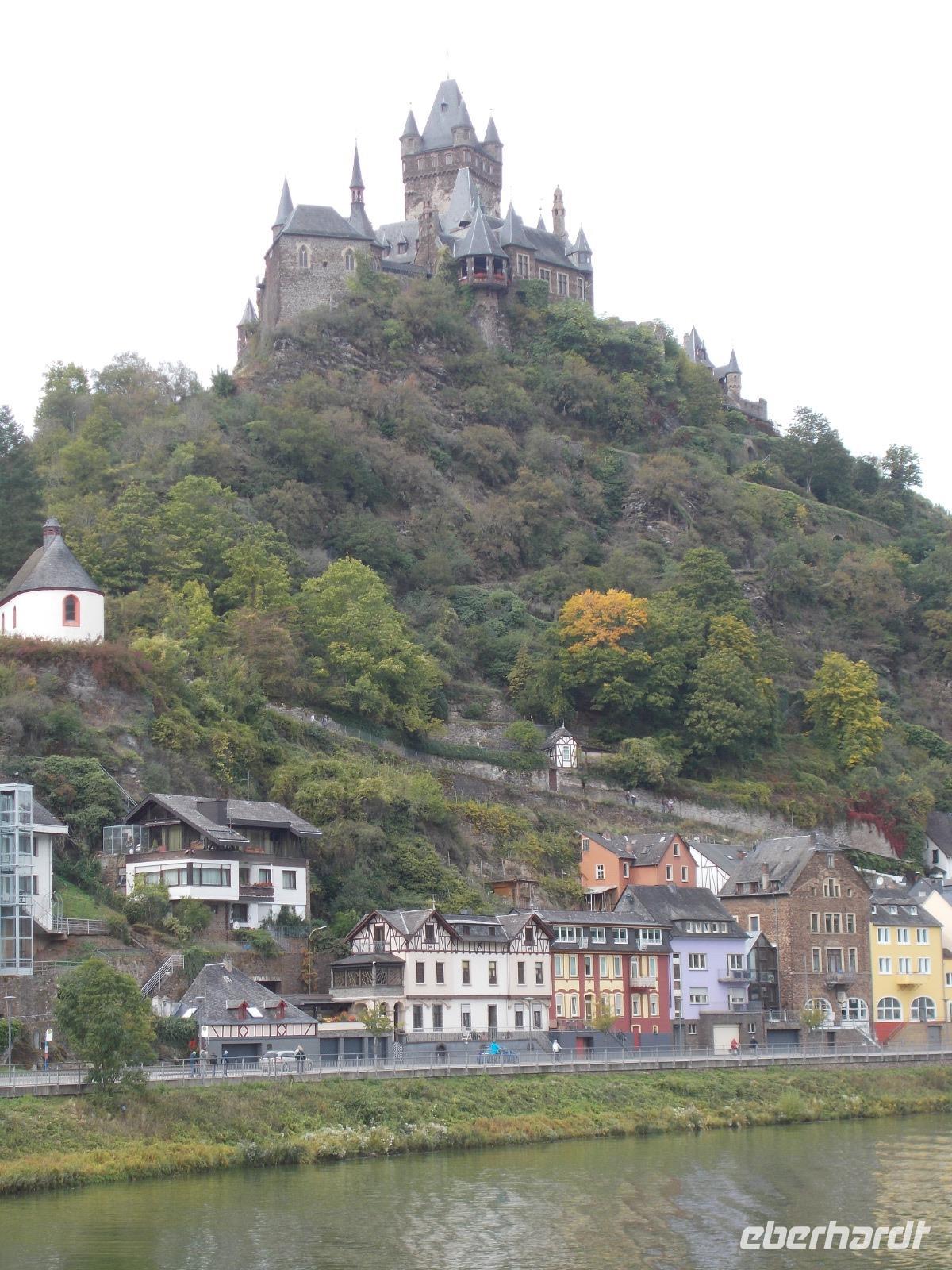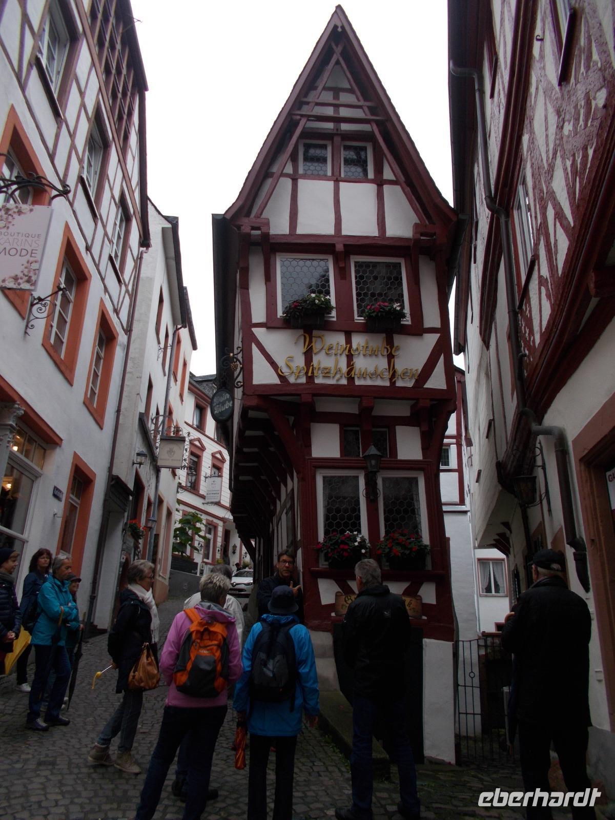 Pünktlich zum Frühstück machten wir in Cochem fest.Die rheinland-pfälzische Stadt ,an der Mosel,war im Frühnebel eingehüllt.Vom Schiff aus hatten wir schon einmal einen tollen Blick auf die Reichsburg,die von den Pfalzgrafen als Zollburg diente.Bequem wurden wir mit einem Kleinbus,vom Schiff zum Burgtor,chauffiert.Im Moseltal gab es früher viele bewohnte Burgen,die leider 1689 von französischen Truppen zerstört wurden. Glücklicherweise gefiel die Ruine dem Berliner Kaufmann, Louis Ravene'und er ließ sie 1868 wiederaufbauen.Wir schauten uns staunend in seinem Sammelsurium mit seinen vielen Geheimtüren um.Einen ganz besonderen Blick vom Balkon aus,hatten wir auf die Moselschleife bei Cochem.Es folgte eine Stadtführung durch die engen verwinkelten Gassen.In den schönen Fachwerkhäusern lockten ganz viele Cafes und Weinstuben zum Verweilen ein.Ein Bummel über die Moselbrücke führte uns zurück zum Schiff. Mit einsetzendem Regen passierten wir den steilsten Weinberg Europas ,den Bremmer Calmont und einige der 10 Schleusen auf der Mosel. Den Nachmittag verbrachten wir bei Kaffee und Kuchen in der Panorama Bar.Verkürzt wurde uns die Zeit ,durch einen sehr interessanten Vortrag, über das" Auf und Ab"auf Wasserstraßen.