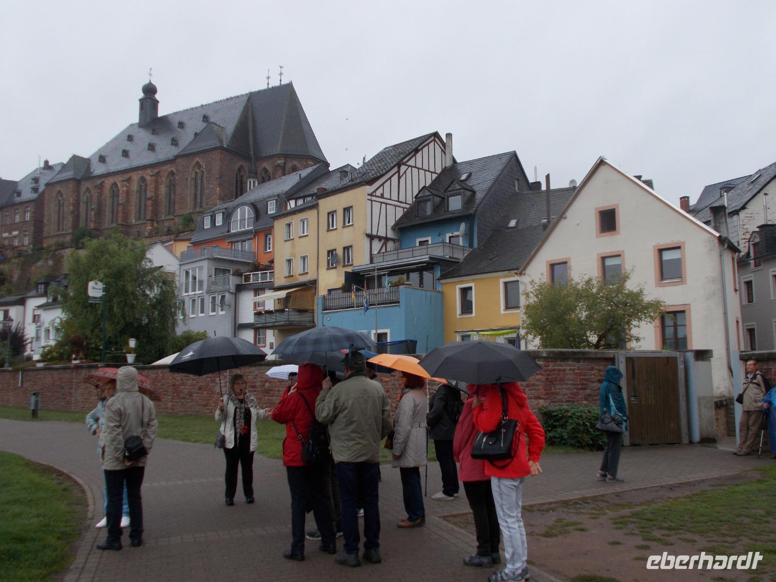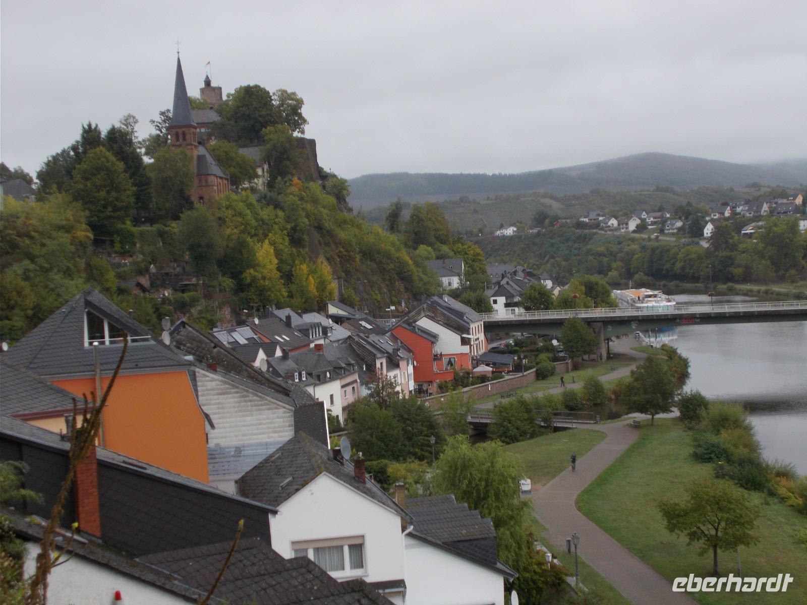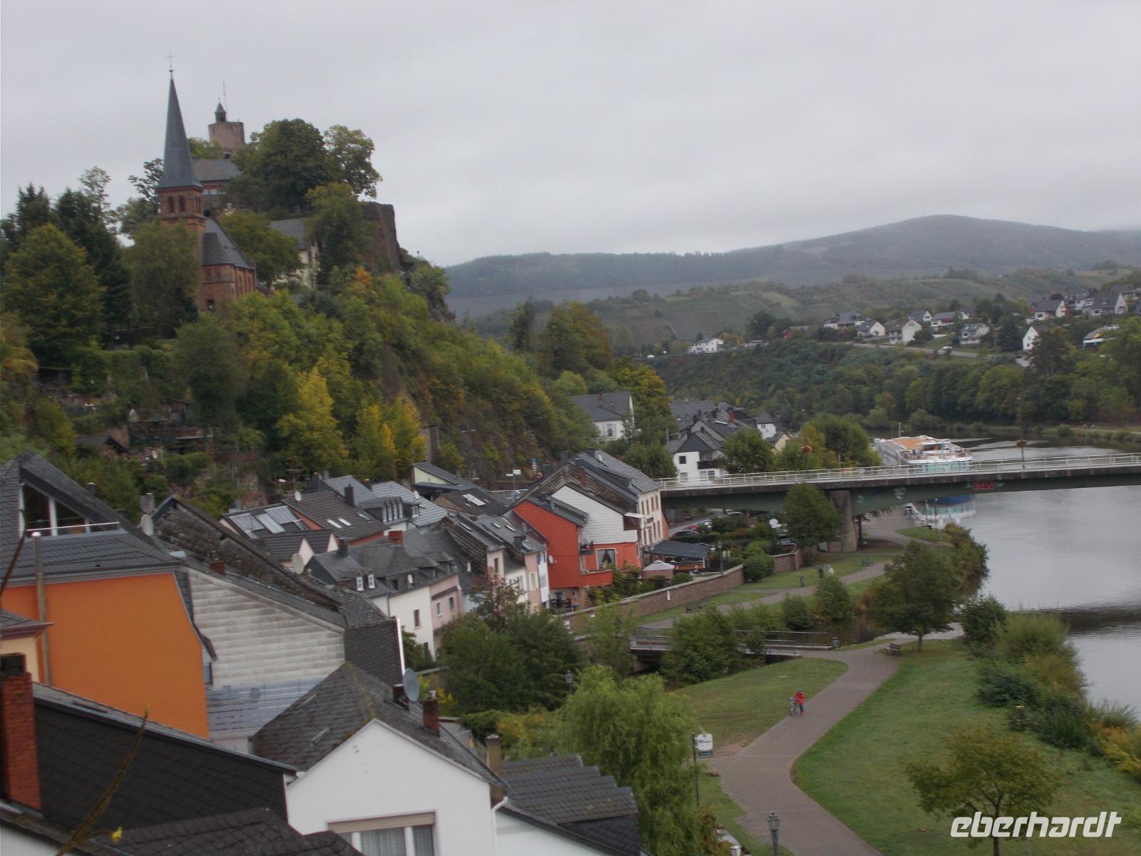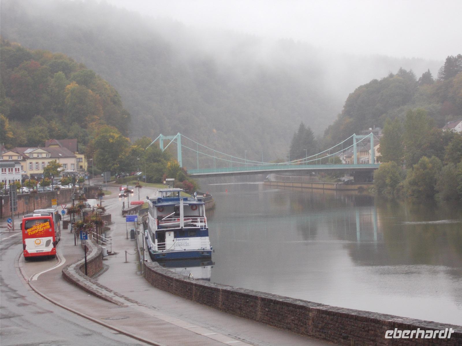 Anscheinend hat Petrus ein Blasen-Problem. Pünktlich zum Stadtrundgang in Saarburg setzte leichter Nieselregen ein.Unser Liegeplatz war unterhalb der Burganlage mit direktem Zugang zur Altstadt.Wir spazierten durch das alte Fischerviertel hinauf zur St. Laurentius Kirche. Die Mittelalterliche Stadt besitzt einem wunderschönen Markt mit Wasserfall.Klein Venedig -nennt man diesen lauschigen Ort entlang der Lenk ,den zahlreiche bepflanzte Brücken zieren.Wer wollte konnte noch hinauf zur einst stolzen und mächtigsten Burg ,des Grafen Siegfried von Luxemburg,steigen.Kurz vor dem Mittagessen setzten wir mit unserem Schiff zum Busparkplatz um.Der Nachmittagsausflug war zur Saarschleife gedacht . Über Orscholz fuhren wir zum Infopunkt Cloef.Ein kurzer Wanderpfad ,durch den Wald, führte uns zum Aussichts- Plateau.Auf dem Weg dorthin setzte der Regen wieder ein und von der erwarteten Aussicht auf die Saarschleife war natürlich nichts mehr zu sehen.Sie versteckte sich dezent im Nebel.Anschließend fuhren wir noch ,in die von Villeroy& Boch, geprägte Stadt Mettlach..Einst durch Mönche gegründet,weist heute alles auf die berühmte Keramikherstellung hin.Auch hier nahmen wir bald vor dem Regen„reiß aus"und ließen uns zum Schiff zurück fahren.Nach dem Abendessen ,rätselten wir uns,mit viel Spaß,um die Welt.Dem Sieger lockte ein guter Tropfen in der Flasche.