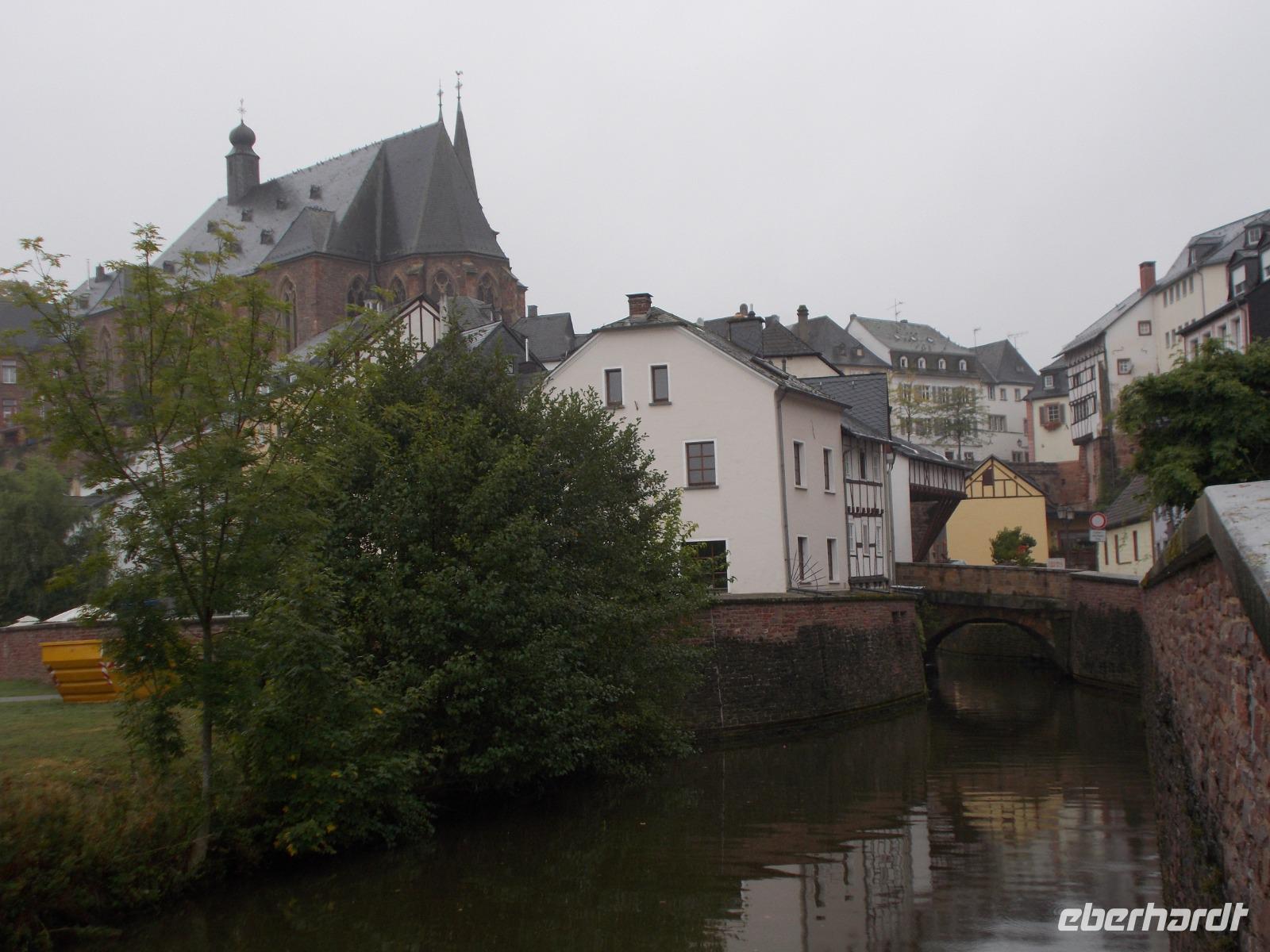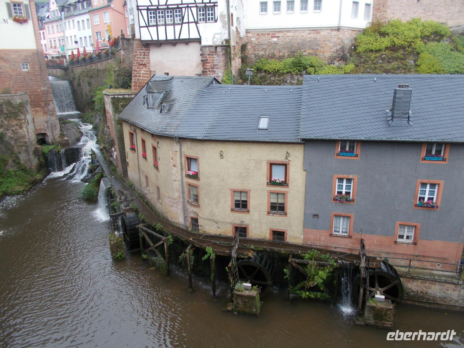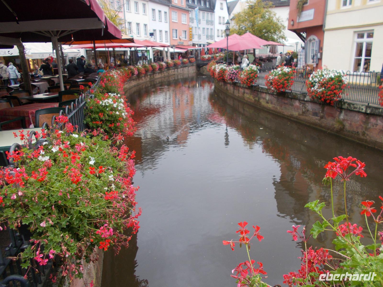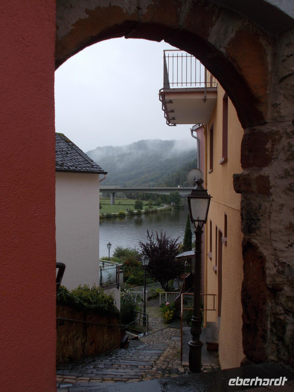 Anscheinend hat Petrus ein Blasen-Problem. Pünktlich zum Stadtrundgang in Saarburg setzte leichter Nieselregen ein.Unser Liegeplatz war unterhalb der Burganlage mit direktem Zugang zur Altstadt.Wir spazierten durch das alte Fischerviertel hinauf zur St. Laurentius Kirche. Die Mittelalterliche Stadt besitzt einem wunderschönen Markt mit Wasserfall.Klein Venedig -nennt man diesen lauschigen Ort entlang der Lenk ,den zahlreiche bepflanzte Brücken zieren.Wer wollte konnte noch hinauf zur einst stolzen und mächtigsten Burg ,des Grafen Siegfried von Luxemburg,steigen.Kurz vor dem Mittagessen setzten wir mit unserem Schiff zum Busparkplatz um.Der Nachmittagsausflug war zur Saarschleife gedacht . Über Orscholz fuhren wir zum Infopunkt Cloef.Ein kurzer Wanderpfad ,durch den Wald, führte uns zum Aussichts- Plateau.Auf dem Weg dorthin setzte der Regen wieder ein und von der erwarteten Aussicht auf die Saarschleife war natürlich nichts mehr zu sehen.Sie versteckte sich dezent im Nebel.Anschließend fuhren wir noch ,in die von Villeroy& Boch, geprägte Stadt Mettlach..Einst durch Mönche gegründet,weist heute alles auf die berühmte Keramikherstellung hin.Auch hier nahmen wir bald vor dem Regen„reiß aus"und ließen uns zum Schiff zurück fahren.Nach dem Abendessen ,rätselten wir uns,mit viel Spaß,um die Welt.Dem Sieger lockte ein guter Tropfen in der Flasche.