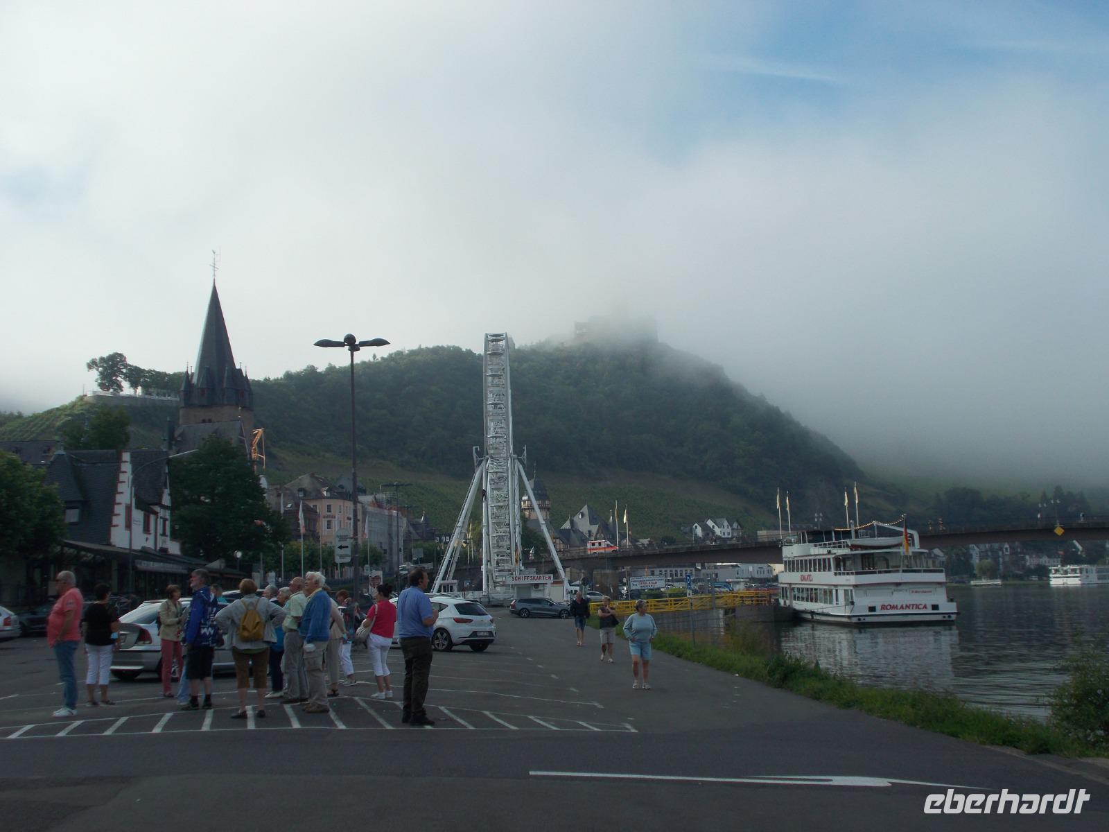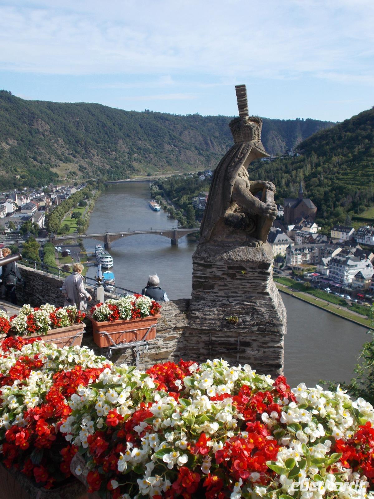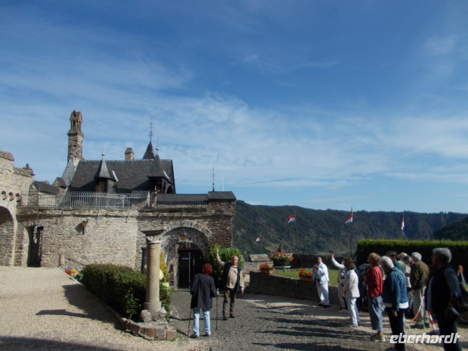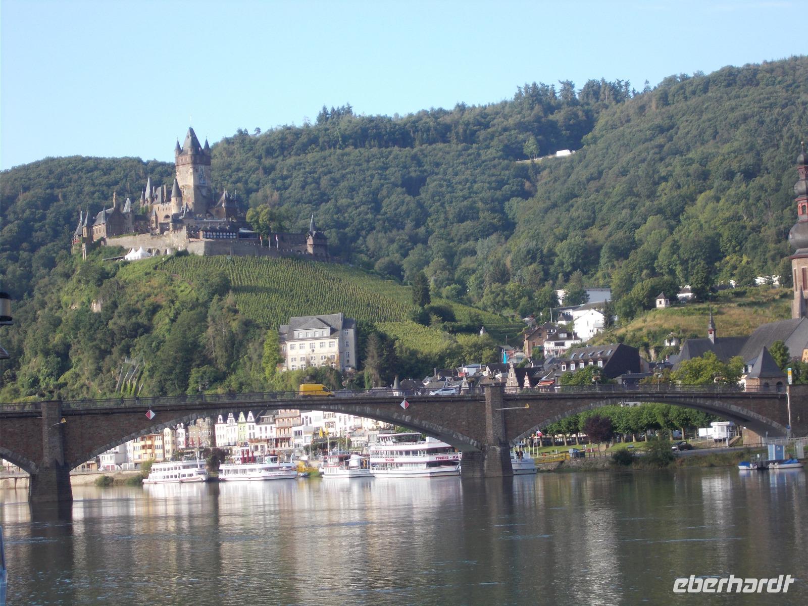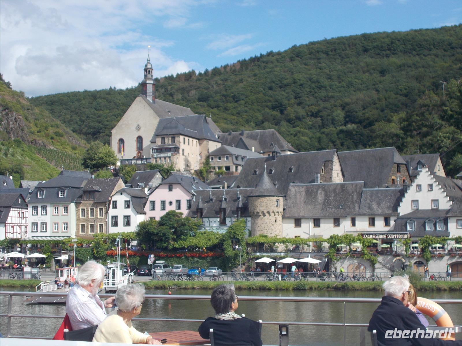Nach dem Frühstück geht es gleich hoch hinaus, zur Reichsburg in Cochem. Bei einer Führung erhielten wir einen Einblick in die wechselvolle Geschichte der Burg und deren Besitzer. Vom Burghof aus, hatten wir einen schönen Blick über die Stadt Cochem und hinüber zum Hausberg „Pinnerkreuz". Durch kleine Gassen und vorbei an mittelalterlichen Fachwerkbauten erreichten wir den Marktplatz mit seinem Glockenspiel und Brunnen. Ab hier war für alle Gäste dann Freizeit. Wer wollte schaute sich die Pfarrkirche St.Martin an, in der das Farbspiel der bunten Glasfenster dominierend ist. An der Moselpromenade wurden die hiesigen Weine zum Ausschank angeboten, (man konnte da auch mal naschen)oder man genoss, in einem der vielen Kaffeehäuser, einfach die Sonne und das bunte Treiben. Über die Moselbrücke gelangten wir wieder zurück zum Schiff, wo das Mittagessen schon auf uns wartete. Den Nachmittag verbrachten wir an Bord und ließen die herrliche Landschaft, die von steilen Weinbergen geprägt ist, an uns- flussaufwärts- vorbeiziehen. Uns faszinierten kleine, liebliche Flecken wie Beilstein, mit der über dem Ort trohnenden Ruine Metternich. Gespannt hielten wir Ausschau nach dem steilsten Weinberg im Moseltal, den Bremmer Calmund. Für uns war es kaum vorstellbar, wie der Weinbauer, in dieser Steil -und Gesteinslage die Reben bearbeiten kann
