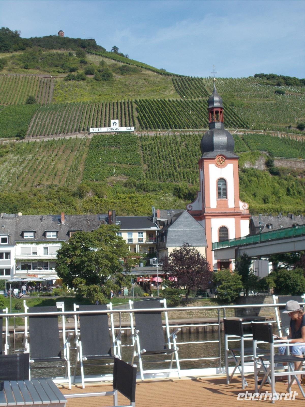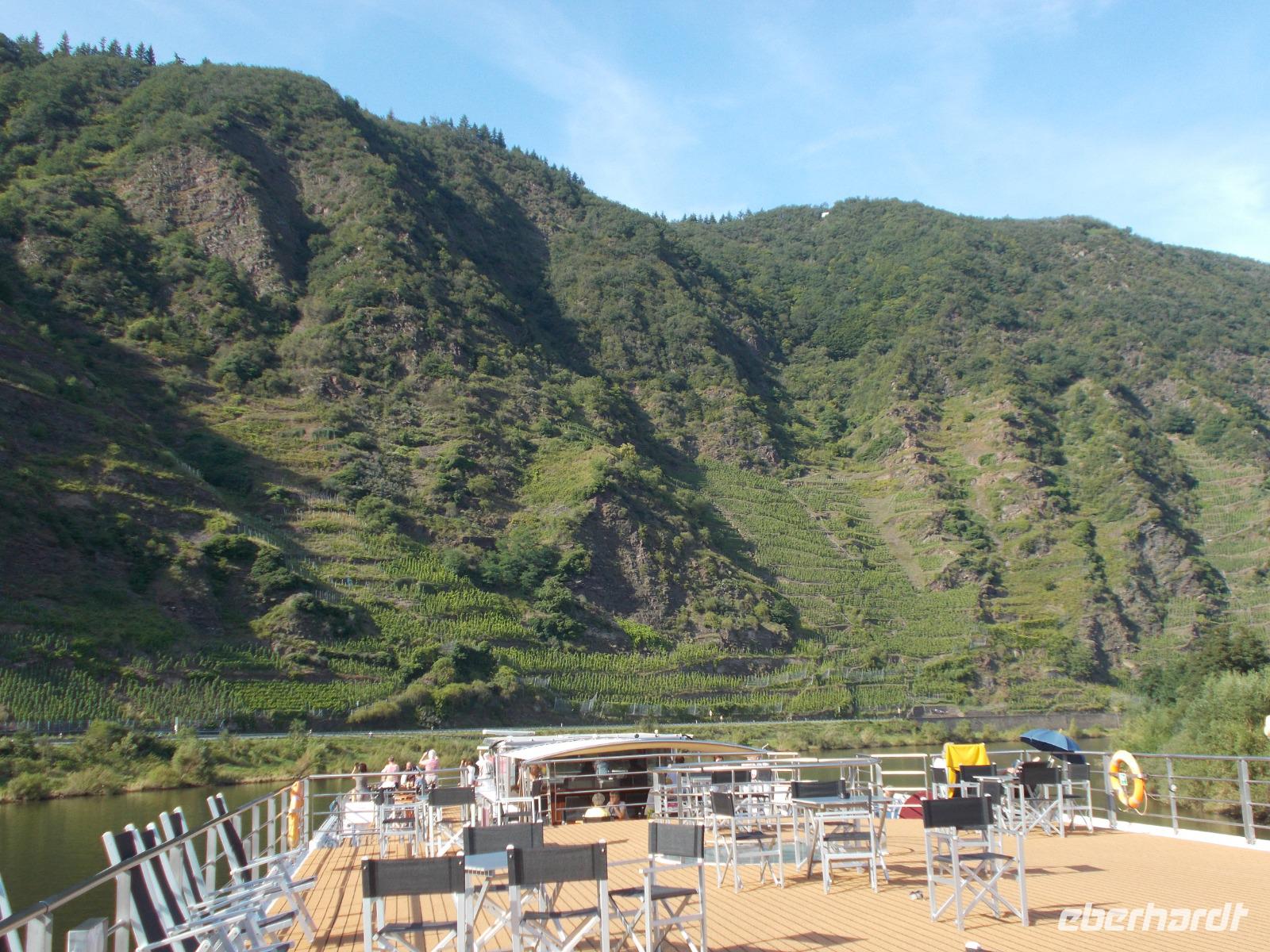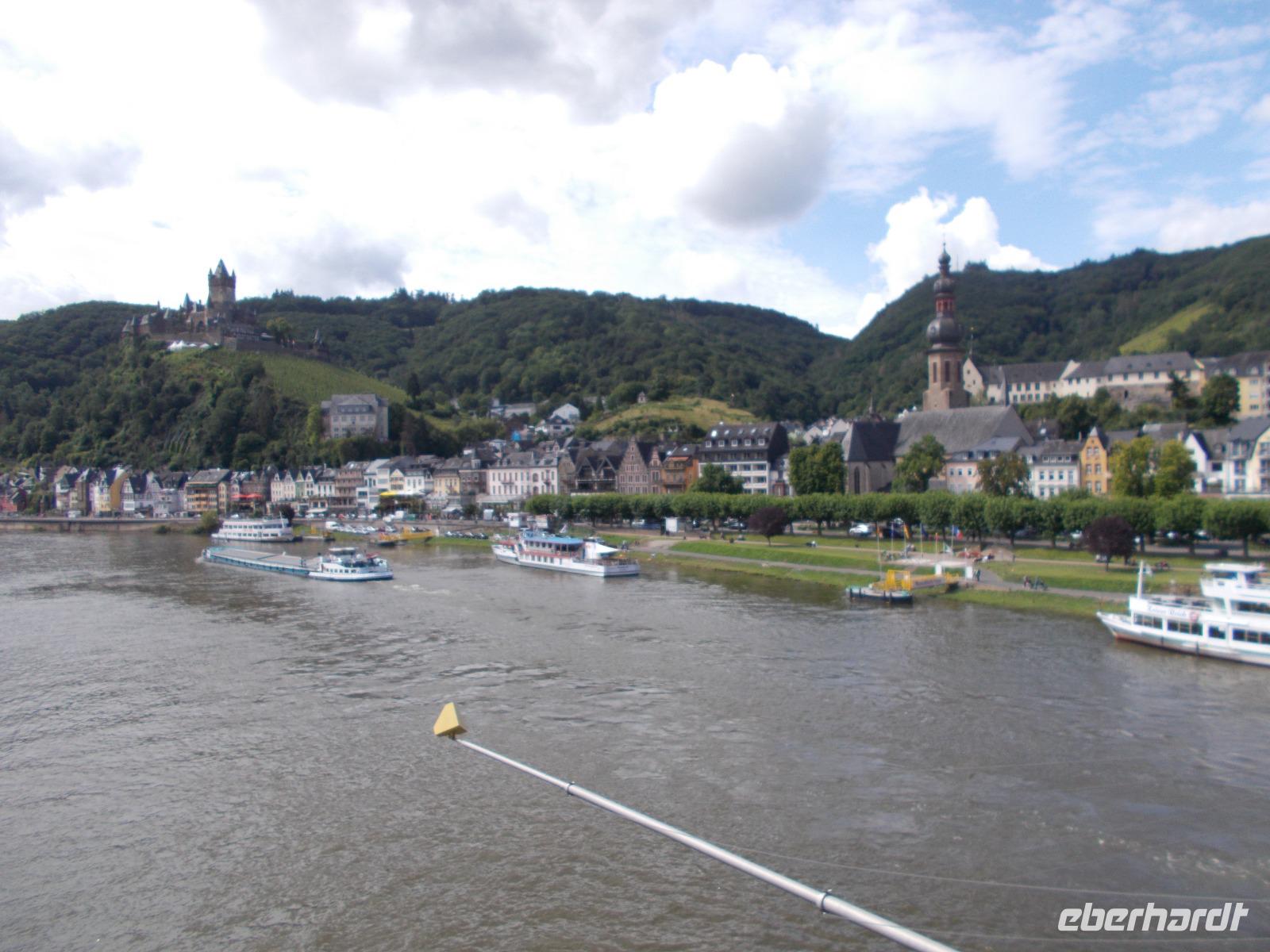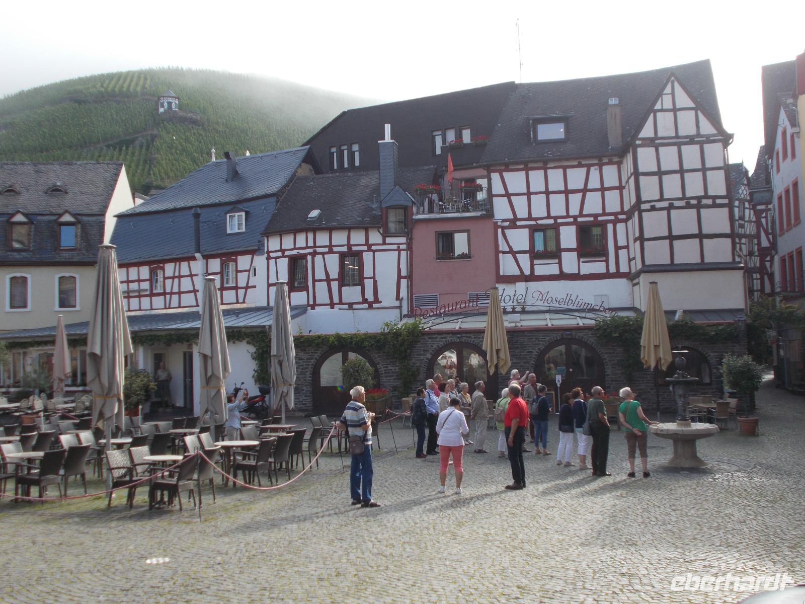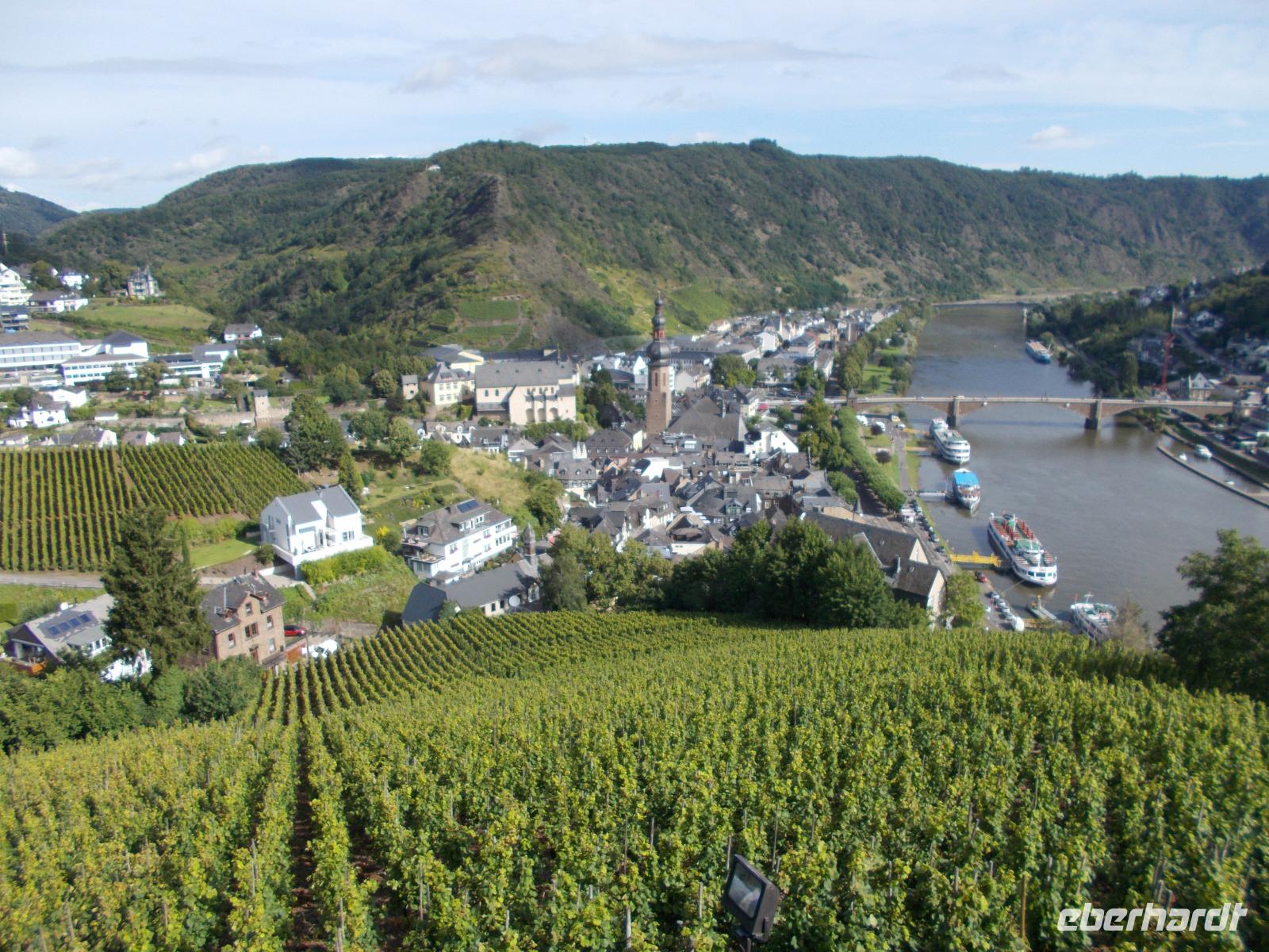Nach dem Frühstück geht es gleich hoch hinaus, zur Reichsburg in Cochem. Bei einer Führung erhielten wir einen Einblick in die wechselvolle Geschichte der Burg und deren Besitzer. Vom Burghof aus, hatten wir einen schönen Blick über die Stadt Cochem und hinüber zum Hausberg „Pinnerkreuz". Durch kleine Gassen und vorbei an mittelalterlichen Fachwerkbauten erreichten wir den Marktplatz mit seinem Glockenspiel und Brunnen. Ab hier war für alle Gäste dann Freizeit. Wer wollte schaute sich die Pfarrkirche St.Martin an, in der das Farbspiel der bunten Glasfenster dominierend ist. An der Moselpromenade wurden die hiesigen Weine zum Ausschank angeboten, (man konnte da auch mal naschen)oder man genoss, in einem der vielen Kaffeehäuser, einfach die Sonne und das bunte Treiben. Über die Moselbrücke gelangten wir wieder zurück zum Schiff, wo das Mittagessen schon auf uns wartete. Den Nachmittag verbrachten wir an Bord und ließen die herrliche Landschaft, die von steilen Weinbergen geprägt ist, an uns- flussaufwärts- vorbeiziehen. Uns faszinierten kleine, liebliche Flecken wie Beilstein, mit der über dem Ort trohnenden Ruine Metternich. Gespannt hielten wir Ausschau nach dem steilsten Weinberg im Moseltal, den Bremmer Calmund. Für uns war es kaum vorstellbar, wie der Weinbauer, in dieser Steil -und Gesteinslage die Reben bearbeiten kann