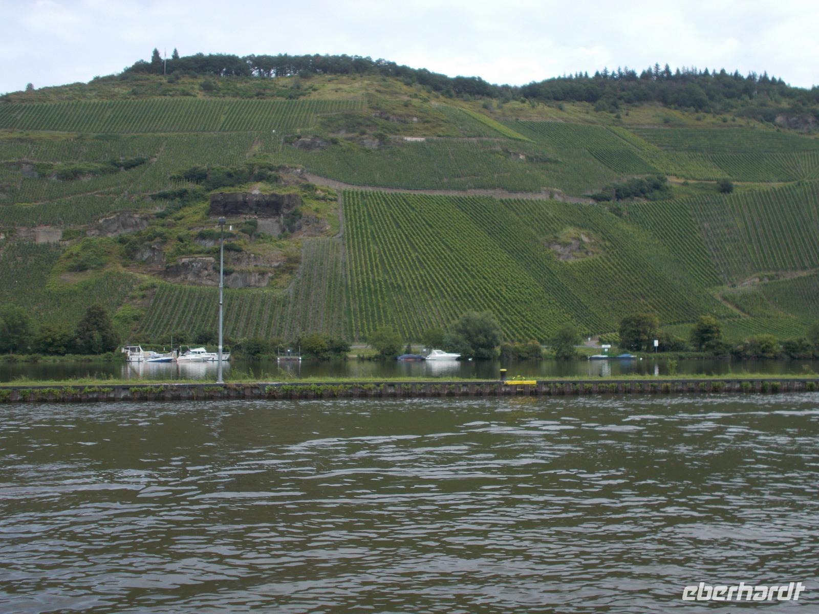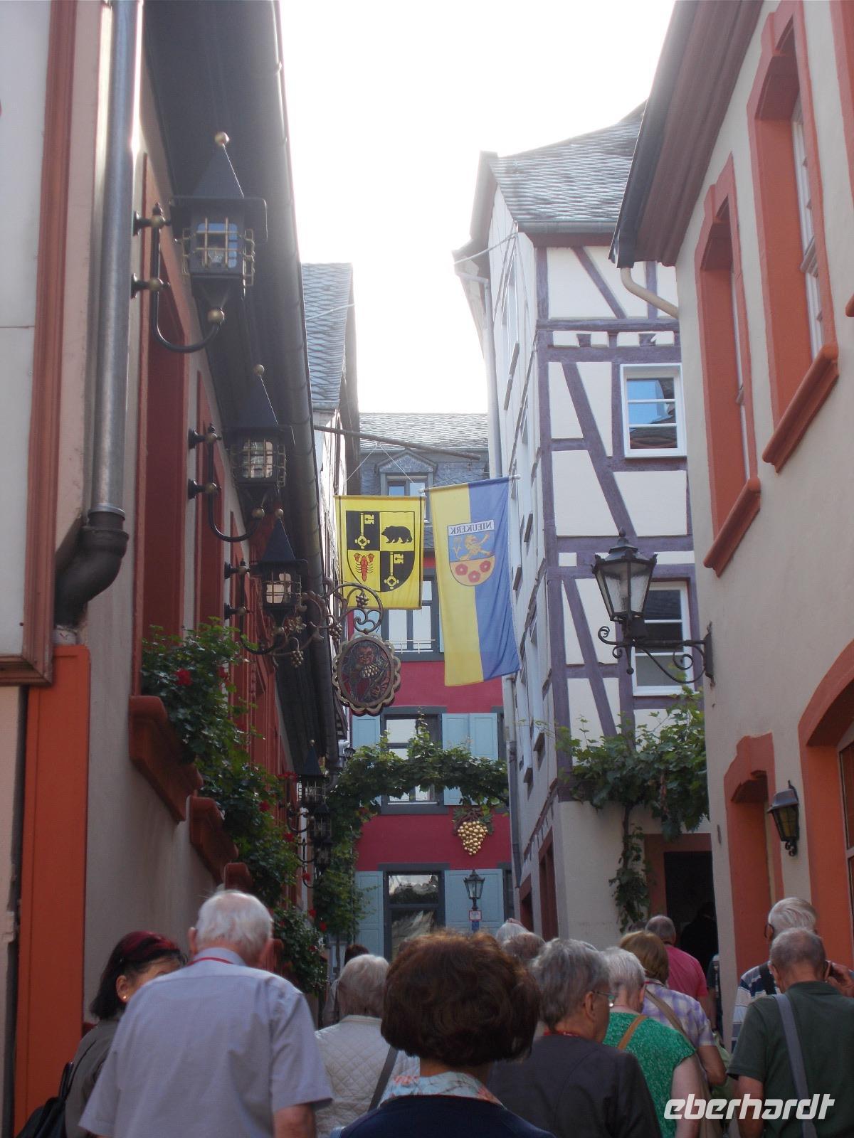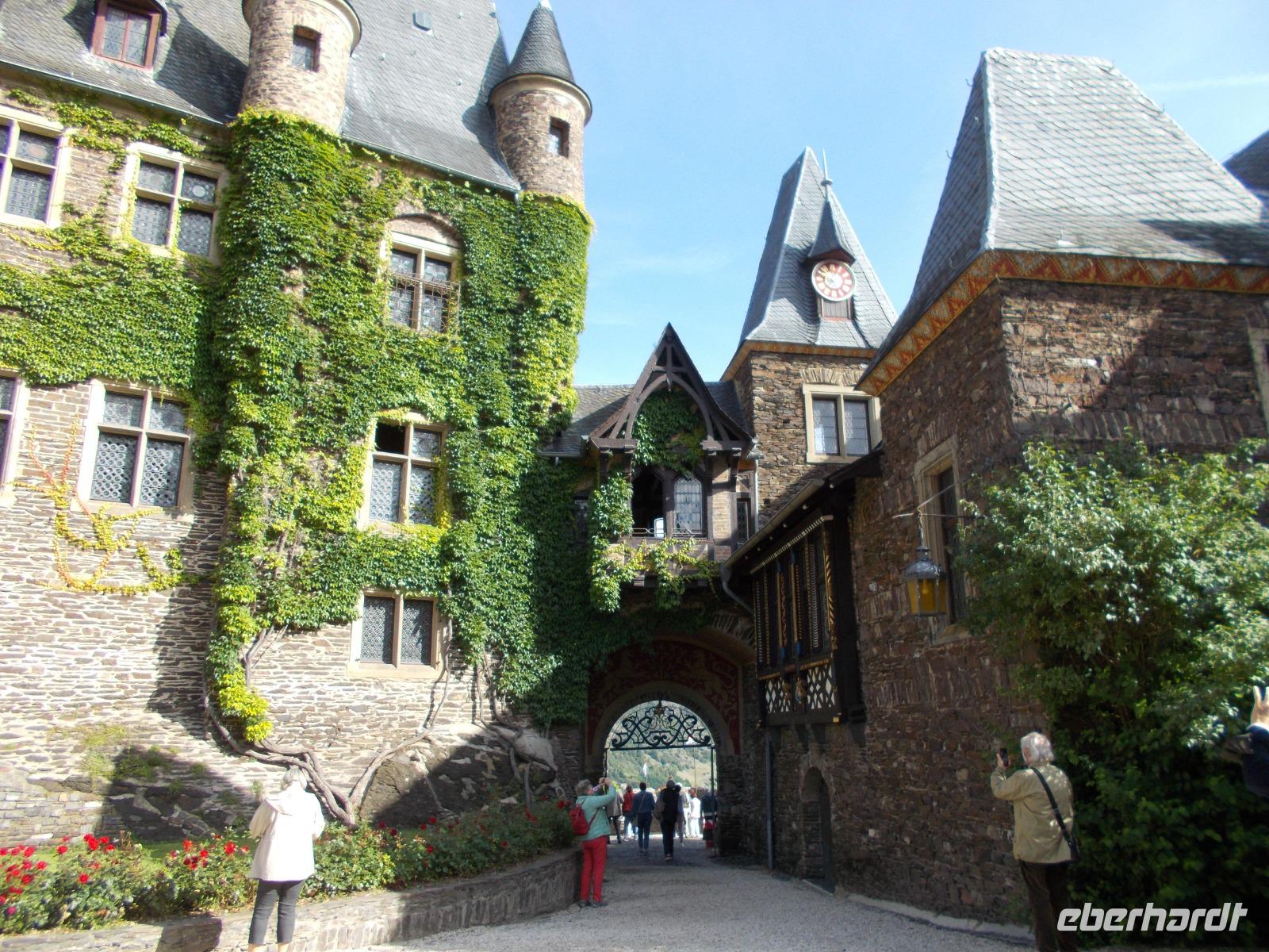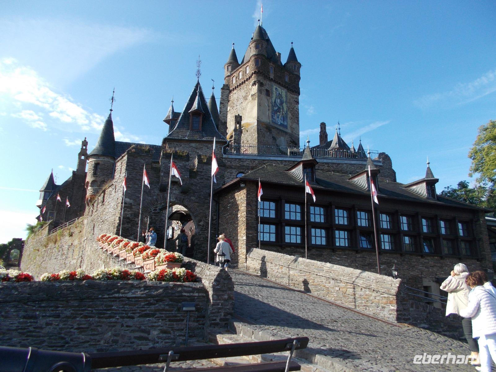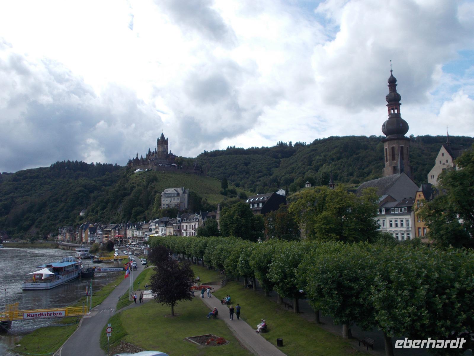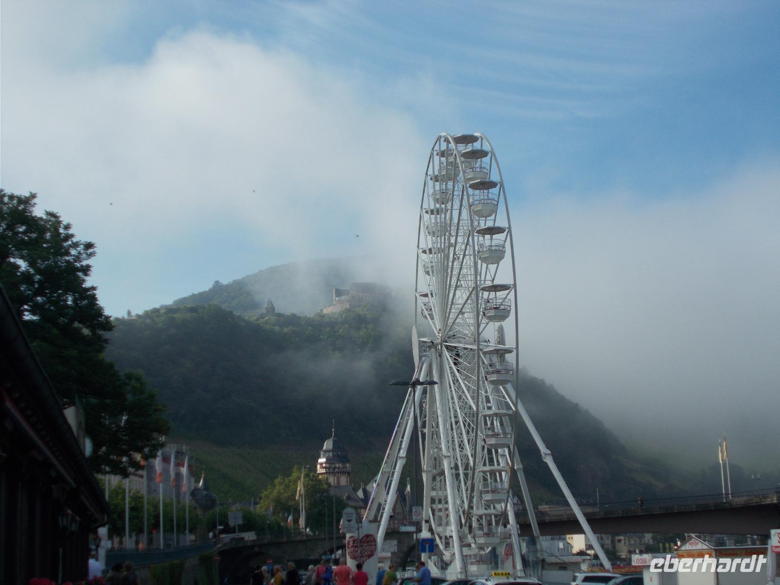 Nach dem Frühstück geht es gleich hoch hinaus, zur Reichsburg in Cochem. Bei einer Führung erhielten wir einen Einblick in die wechselvolle Geschichte der Burg und deren Besitzer. Vom Burghof aus, hatten wir einen schönen Blick über die Stadt Cochem und hinüber zum Hausberg „Pinnerkreuz". Durch kleine Gassen und vorbei an mittelalterlichen Fachwerkbauten erreichten wir den Marktplatz mit seinem Glockenspiel und Brunnen. Ab hier war für alle Gäste dann Freizeit. Wer wollte schaute sich die Pfarrkirche St.Martin an, in der das Farbspiel der bunten Glasfenster dominierend ist. An der Moselpromenade wurden die hiesigen Weine zum Ausschank angeboten, (man konnte da auch mal naschen)oder man genoss, in einem der vielen Kaffeehäuser, einfach die Sonne und das bunte Treiben. Über die Moselbrücke gelangten wir wieder zurück zum Schiff, wo das Mittagessen schon auf uns wartete. Den Nachmittag verbrachten wir an Bord und ließen die herrliche Landschaft, die von steilen Weinbergen geprägt ist, an uns- flussaufwärts- vorbeiziehen. Uns faszinierten kleine, liebliche Flecken wie Beilstein, mit der über dem Ort trohnenden Ruine Metternich. Gespannt hielten wir Ausschau nach dem steilsten Weinberg im Moseltal, den Bremmer Calmund. Für uns war es kaum vorstellbar, wie der Weinbauer, in dieser Steil -und Gesteinslage die Reben bearbeiten kann