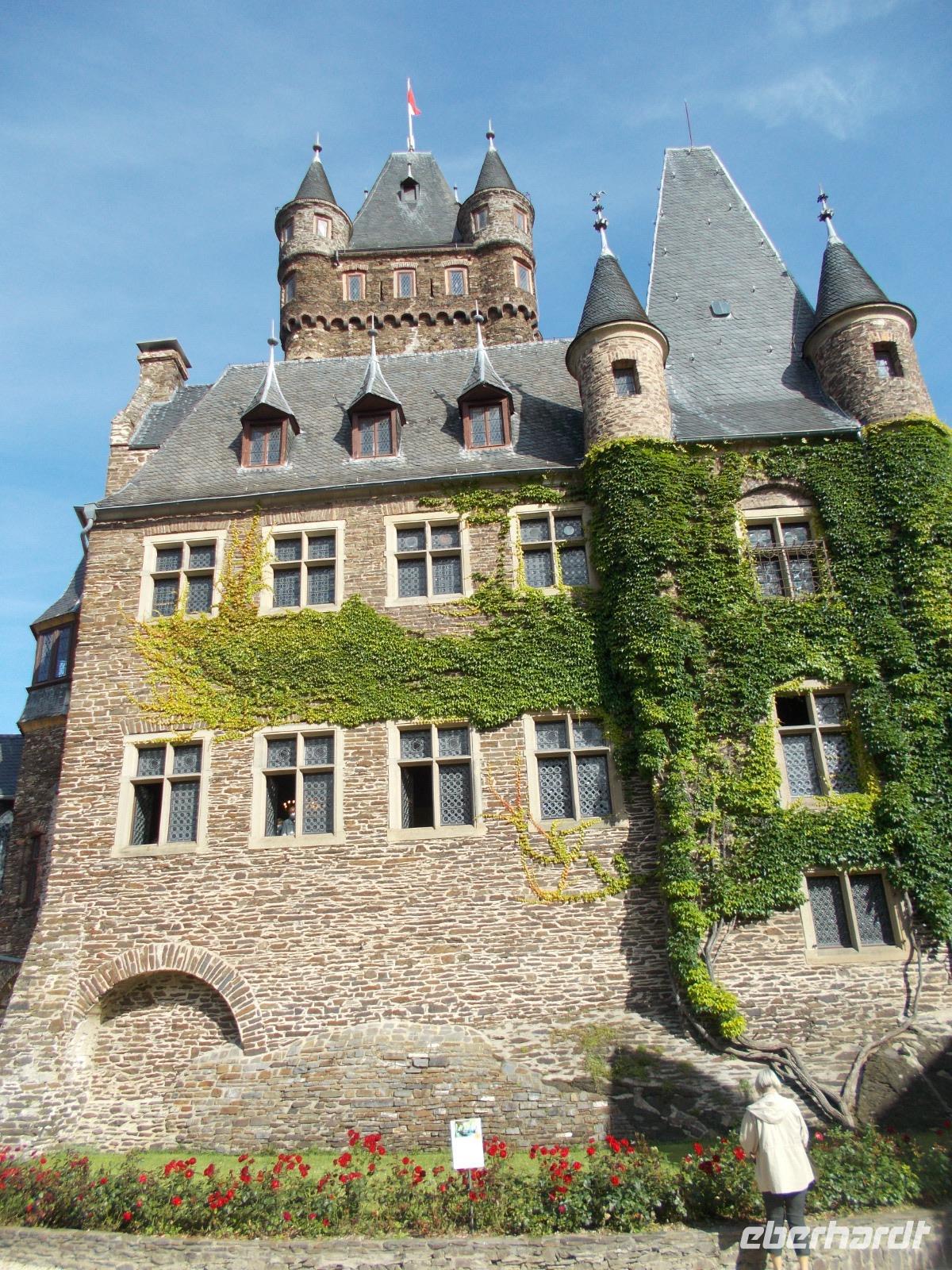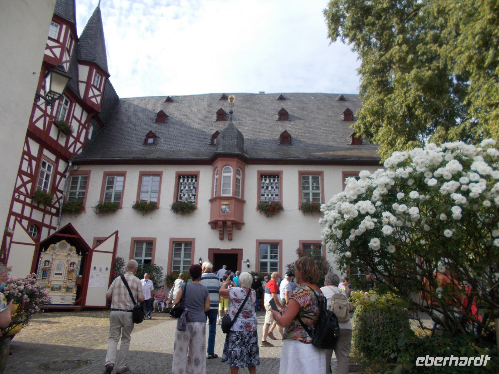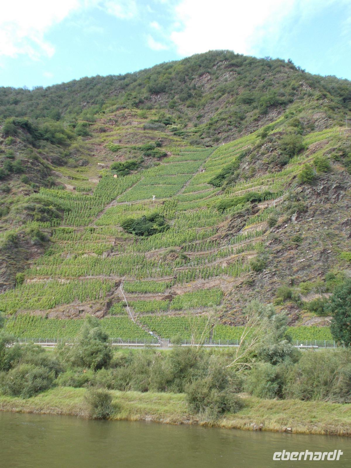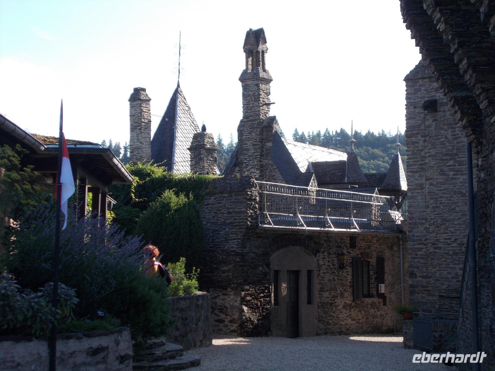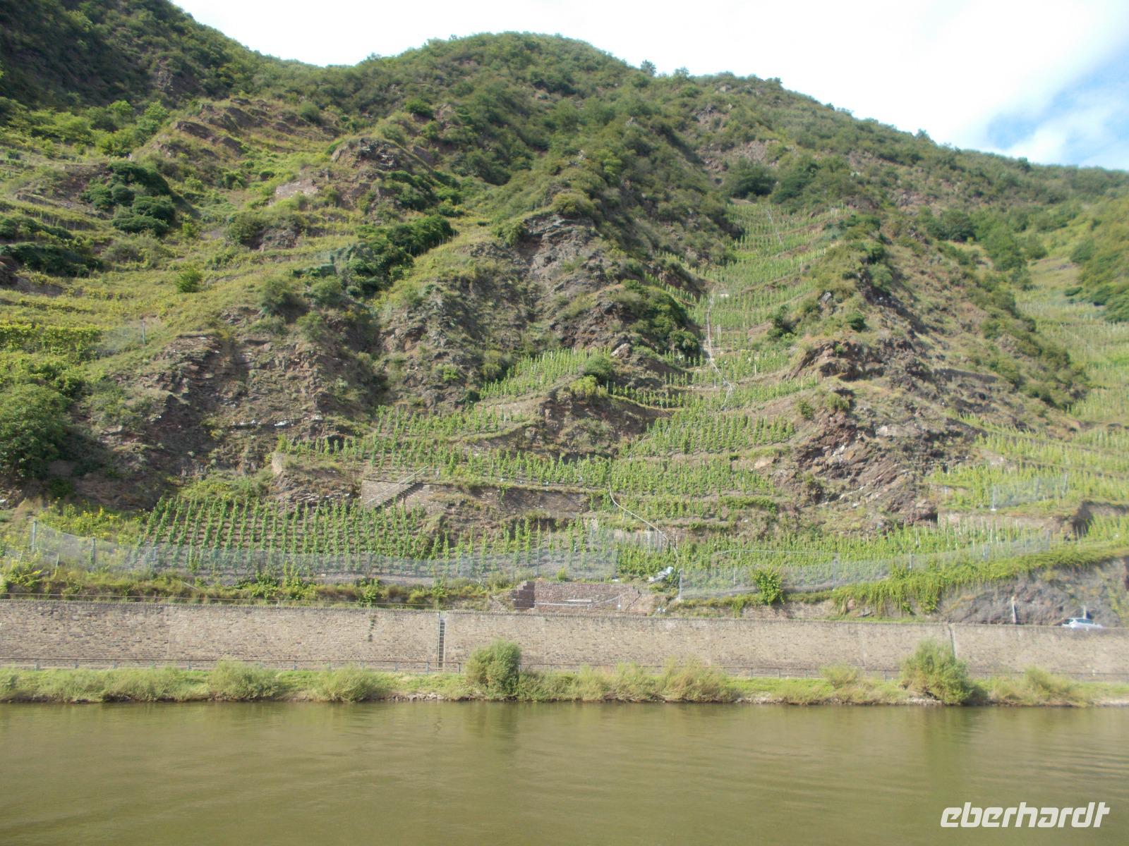 Nach dem Frühstück geht es gleich hoch hinaus, zur Reichsburg in Cochem. Bei einer Führung erhielten wir einen Einblick in die wechselvolle Geschichte der Burg und deren Besitzer. Vom Burghof aus, hatten wir einen schönen Blick über die Stadt Cochem und hinüber zum Hausberg „Pinnerkreuz". Durch kleine Gassen und vorbei an mittelalterlichen Fachwerkbauten erreichten wir den Marktplatz mit seinem Glockenspiel und Brunnen. Ab hier war für alle Gäste dann Freizeit. Wer wollte schaute sich die Pfarrkirche St.Martin an, in der das Farbspiel der bunten Glasfenster dominierend ist. An der Moselpromenade wurden die hiesigen Weine zum Ausschank angeboten, (man konnte da auch mal naschen)oder man genoss, in einem der vielen Kaffeehäuser, einfach die Sonne und das bunte Treiben. Über die Moselbrücke gelangten wir wieder zurück zum Schiff, wo das Mittagessen schon auf uns wartete. Den Nachmittag verbrachten wir an Bord und ließen die herrliche Landschaft, die von steilen Weinbergen geprägt ist, an uns- flussaufwärts- vorbeiziehen. Uns faszinierten kleine, liebliche Flecken wie Beilstein, mit der über dem Ort trohnenden Ruine Metternich. Gespannt hielten wir Ausschau nach dem steilsten Weinberg im Moseltal, den Bremmer Calmund. Für uns war es kaum vorstellbar, wie der Weinbauer, in dieser Steil -und Gesteinslage die Reben bearbeiten kann
