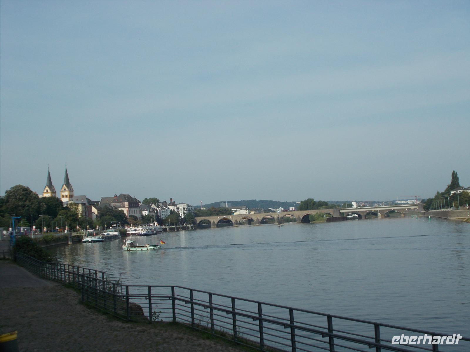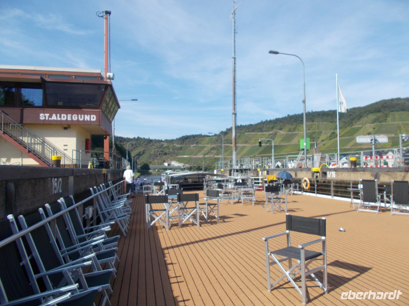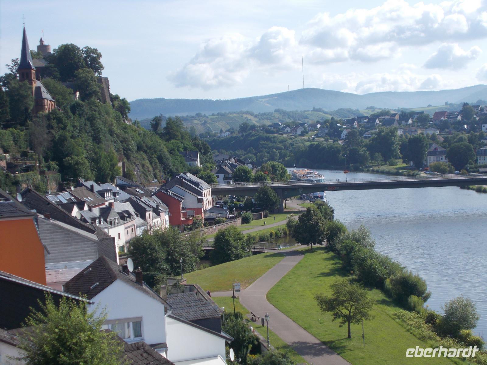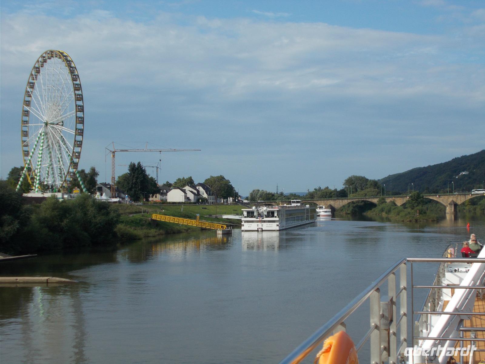 Über Nacht verlassen wir die Mosel und biegen in die Saar ein.Am Morgen erwachen wir unterhalb der Burg ,die trohnend über der Stadt steht.Saarburg liegt an der Mündung des Leukbachs,der sich durch den gesamten Ort schlängelt und sogar im Zentrum einen Wasserfall bildet.Den Bereich des Buttermarktes nennt man deshalb auch „klein Venedig".Von dem Plateau der Kirche St.Laurentius hat man wiederum einen tollen Ausblick zur Saar bis in den Hunsrück.Von diesem idyllischen Städtchen waren wir alle begeistert.Der Rundgang war wirklich eine Überraschung,so viele schöne Ecken,auf so kleiner Fläche.Wer wollte konnte hinauf zur Burganlage spazieren und von oben auf unser Schiff hinab sehen,sowie ,bei dem herrlichen Wetter,die wunderbare Aussicht genießen.Während der Mittagszeit setzten wir zum Schifffahrtsamt um.Die Busse standen bereit zum Ausflug zur Saarschleife.Immer der Saar entlang ,vorbei an Mettlach ,erreichten wir den heilklimatischen Kurort Orscholz.Das in die Natur eingebundene,moderne Bauwerk -Atrium-war Ausgangspunkt unserer kleinen Wanderung durch den Wald,zur bekanntesten Sehenswürdigkeit des Saarlandes.Am berühmten Aussichtspunkt Cloef, 180m hoch über dem Fluss, waren die Hobbyfotografen gefragt.Hier fand jeder sein schönstes Motiv von der Saarschleife. Zurück auf dem Schiff hieß es „Leinen los"und wir „schipperten"noch 12km auf der Saar ,bevor wir bei Konz in die Mosel bogen.Wir folgten den Lauf Flussabwerts. Für den Abend lud unsere Bordreiseleiterin ,Frau Tichy,zur Hitparade ein. Die Titel wurden vorher eingereicht und wir waren gespannt ,welcher Hit in den Top Ten landete.Bei den vielen schönen Titeln die, zum Teil ,zu erraten waren,gingen die „Geschmäcker"doch auseinander.Beim „Griechischen Wein" , dem Siegertitel,fanden aber alle wieder zusammen. Es war ein schöner Tagesausklang.