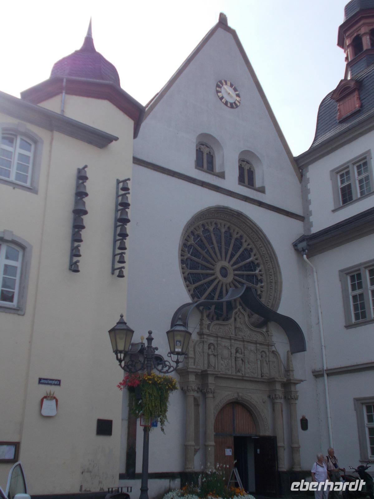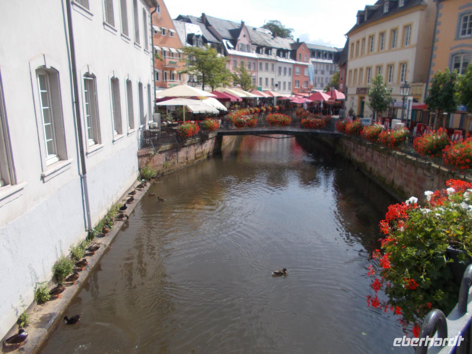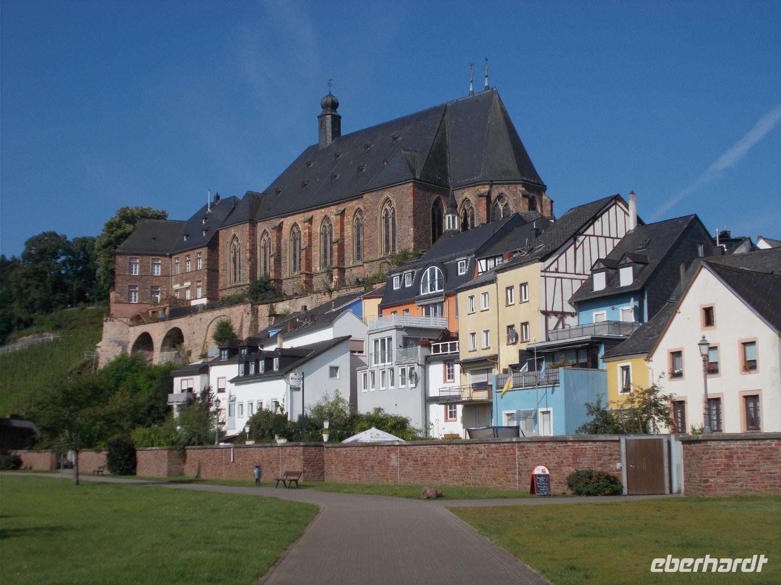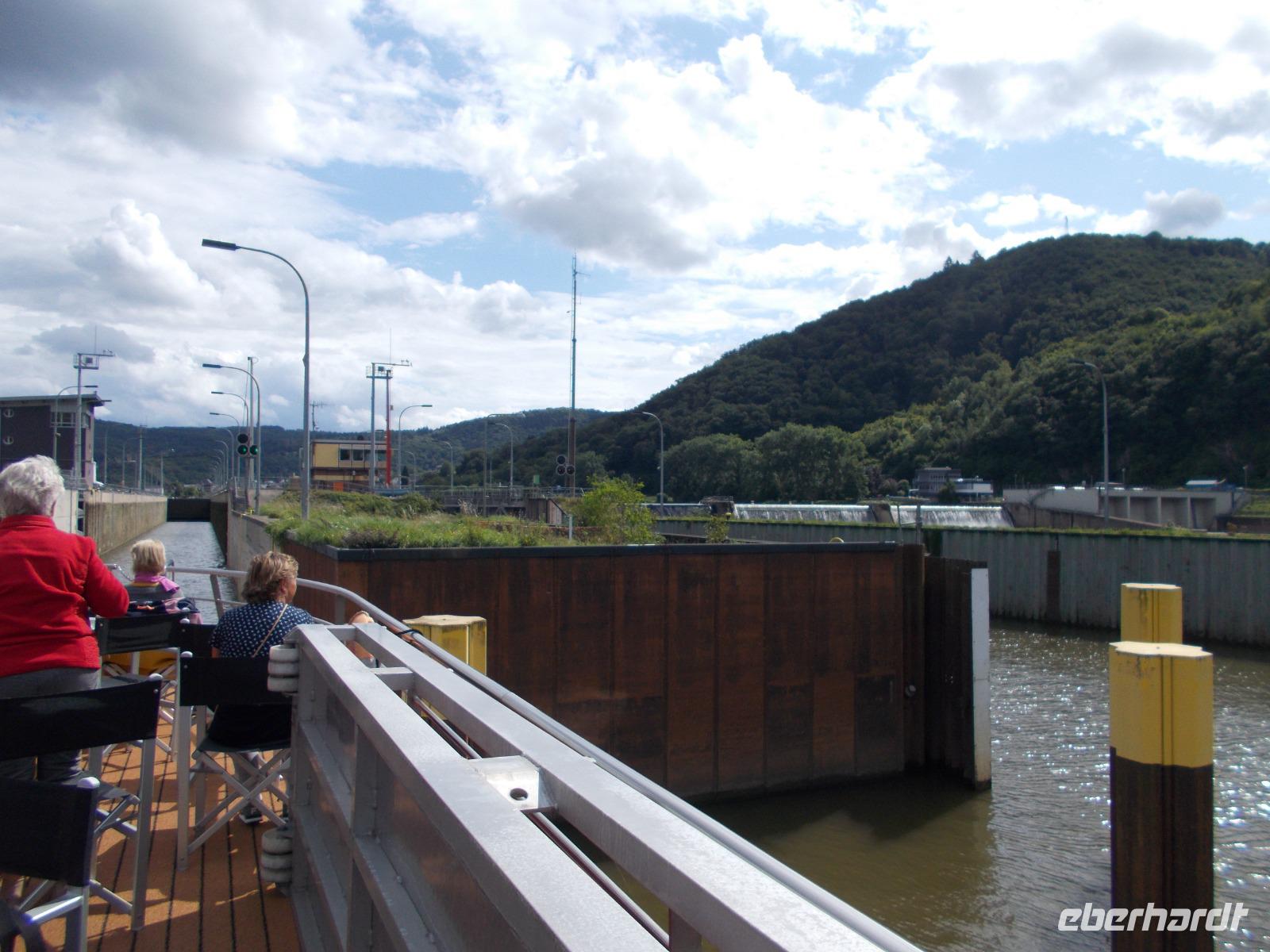 Über Nacht verlassen wir die Mosel und biegen in die Saar ein.Am Morgen erwachen wir unterhalb der Burg ,die trohnend über der Stadt steht.Saarburg liegt an der Mündung des Leukbachs,der sich durch den gesamten Ort schlängelt und sogar im Zentrum einen Wasserfall bildet.Den Bereich des Buttermarktes nennt man deshalb auch „klein Venedig".Von dem Plateau der Kirche St.Laurentius hat man wiederum einen tollen Ausblick zur Saar bis in den Hunsrück.Von diesem idyllischen Städtchen waren wir alle begeistert.Der Rundgang war wirklich eine Überraschung,so viele schöne Ecken,auf so kleiner Fläche.Wer wollte konnte hinauf zur Burganlage spazieren und von oben auf unser Schiff hinab sehen,sowie ,bei dem herrlichen Wetter,die wunderbare Aussicht genießen.Während der Mittagszeit setzten wir zum Schifffahrtsamt um.Die Busse standen bereit zum Ausflug zur Saarschleife.Immer der Saar entlang ,vorbei an Mettlach ,erreichten wir den heilklimatischen Kurort Orscholz.Das in die Natur eingebundene,moderne Bauwerk -Atrium-war Ausgangspunkt unserer kleinen Wanderung durch den Wald,zur bekanntesten Sehenswürdigkeit des Saarlandes.Am berühmten Aussichtspunkt Cloef, 180m hoch über dem Fluss, waren die Hobbyfotografen gefragt.Hier fand jeder sein schönstes Motiv von der Saarschleife. Zurück auf dem Schiff hieß es „Leinen los"und wir „schipperten"noch 12km auf der Saar ,bevor wir bei Konz in die Mosel bogen.Wir folgten den Lauf Flussabwerts. Für den Abend lud unsere Bordreiseleiterin ,Frau Tichy,zur Hitparade ein. Die Titel wurden vorher eingereicht und wir waren gespannt ,welcher Hit in den Top Ten landete.Bei den vielen schönen Titeln die, zum Teil ,zu erraten waren,gingen die „Geschmäcker"doch auseinander.Beim „Griechischen Wein" , dem Siegertitel,fanden aber alle wieder zusammen. Es war ein schöner Tagesausklang.