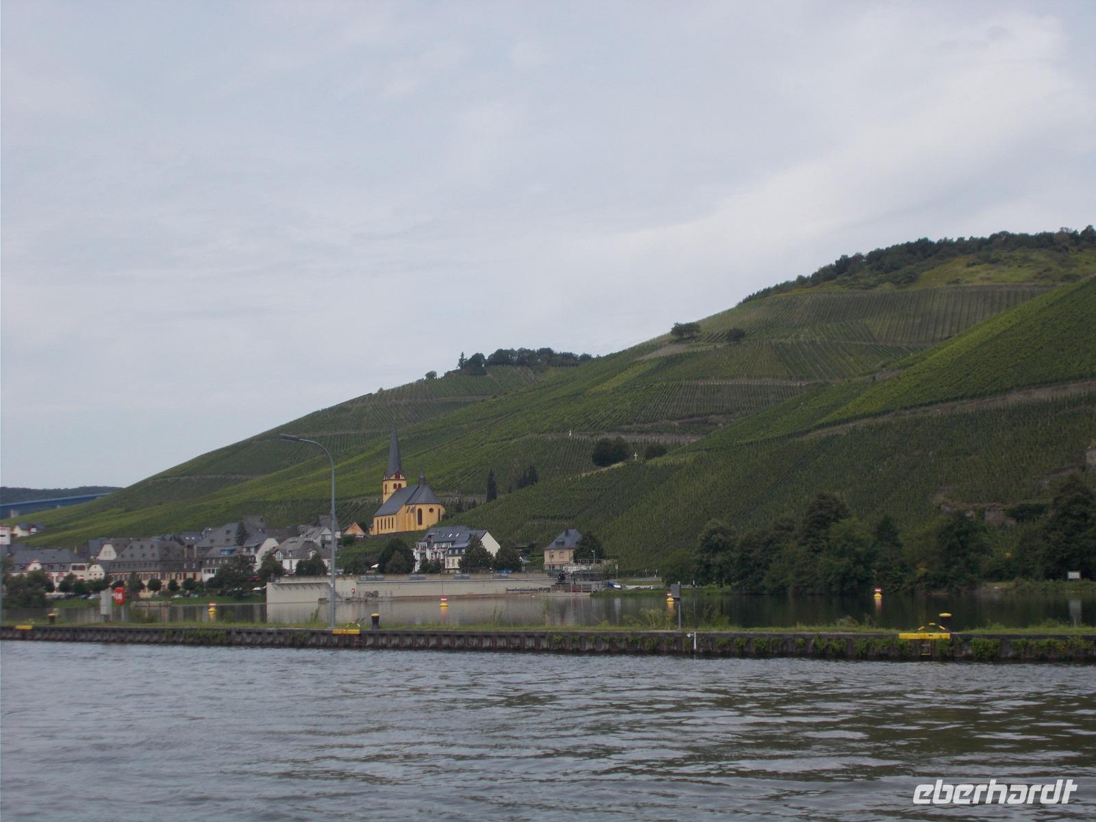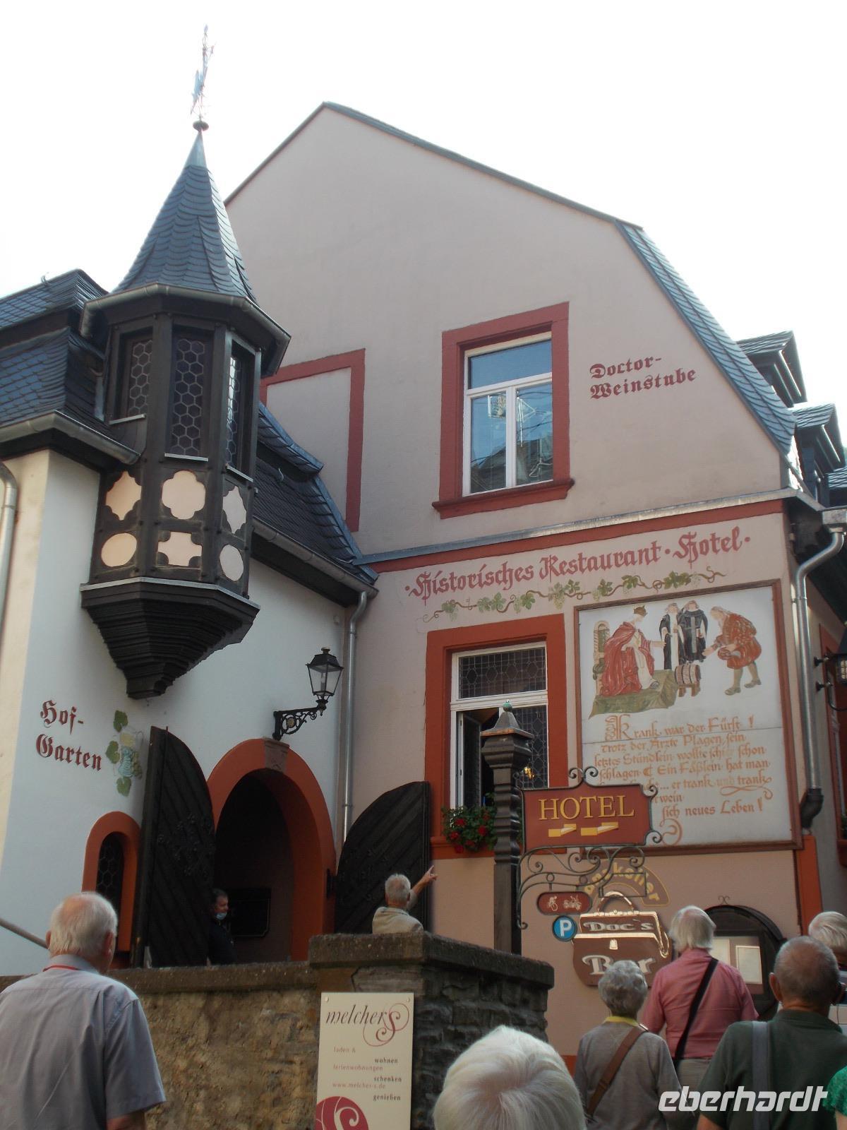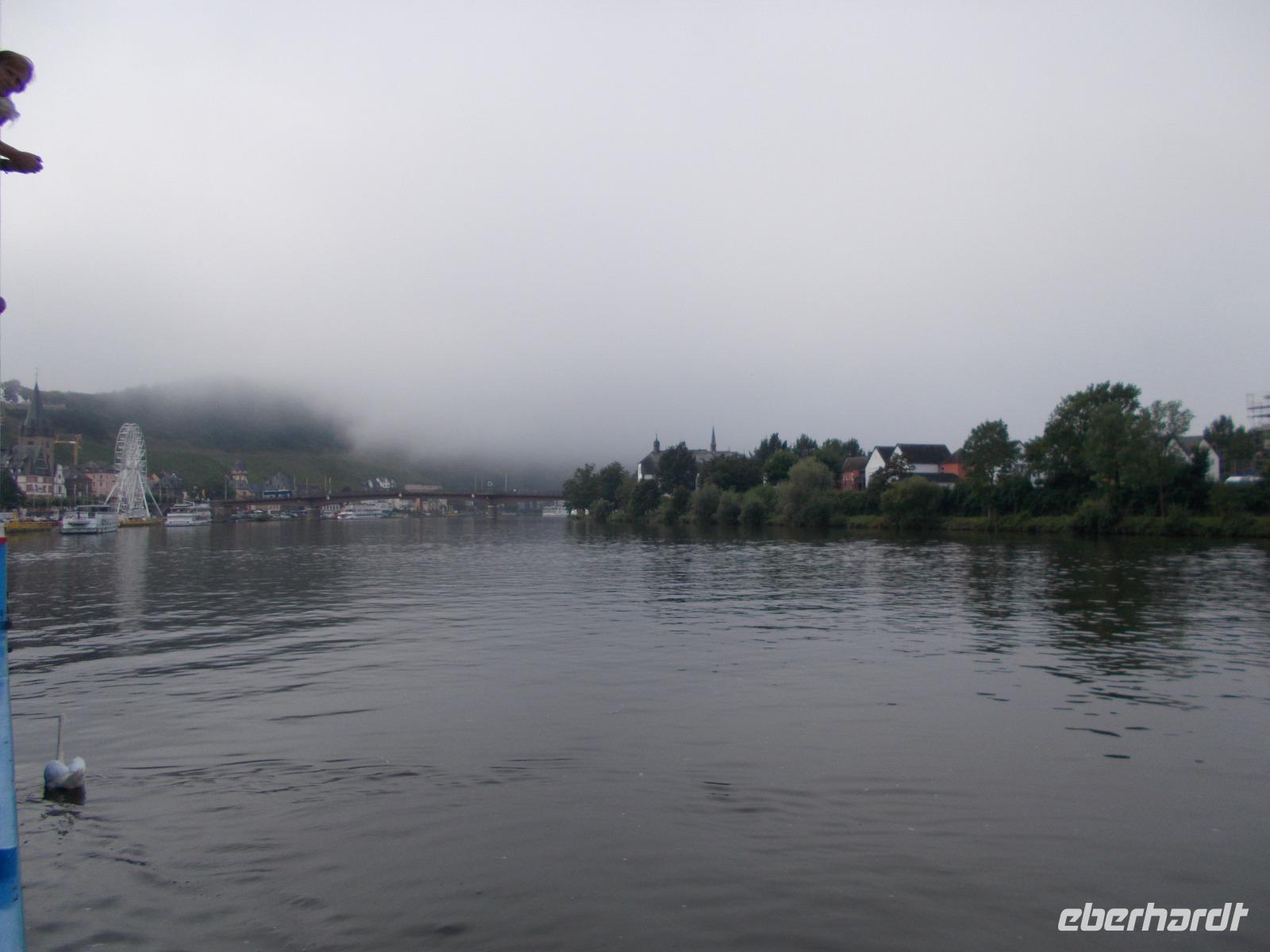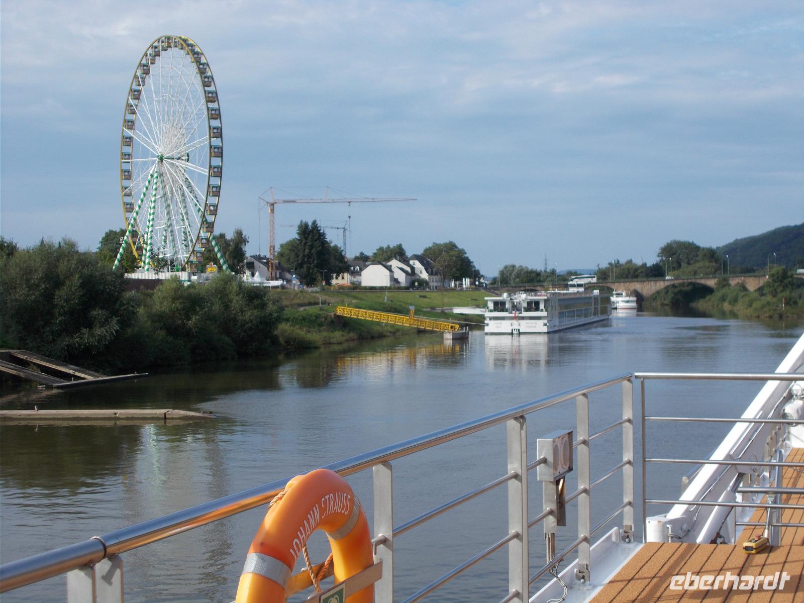 Auch heute früh bot sich uns wieder ein Naturwunder in Form von Nebel. Das Moseltal war eingehüllt und die grauen Schwaden schobeb sich nur langsam nach oben. Nach und nach wurde der Blick zur Burgruine Landsberg ,Sommerresidenz der Erzbischhöfe von Trier,frei.Der heutige Tag begann mit einem Spaziergang durch Bernkastell -Kues. Wir schlenderten durch die malerischen Gassen des mittelalterlichen Städtchens. Die alten Fachwerkhäuser zogen unsereBlicke immer wieder an.Über den Karlsbader Platz,dem Docktor Weinhaus,dem Graacher Stadttor und Bärenbrunnen gelangten wir zum St.Michaelsbrunnen.Am alten Rathaus ist noch der Pranger zu sehen(und zu Nutzen,wir waren aber alle lieb !)Nach der Freizeit erwartete uns im Weinhaus Dr.Pauly-Bergweiler eine Moselwein- Probe .Im historischem Kellergewölbe ließen wir uns die fünf gebotenen Weine schmecken .Den Ausbau und Geschmack der hiesigen Tropfen wird ganz stark von den drei Schiefersorten bestimmt.Gut gelaunt und mit den einen oder anderen Fläschchen ging es zurück zum Schiff.Der Nachmittag wurde vom Bordleben bestimmt.Auf dem Sonnendeck sitzend, ließen wir die liebliche Landschaft des Moseltals,noch einmal an uns vorbei ziehen. Am Abend lud der Kapitän zum Abschiedscocktail in die Panoramalounge .Gekrönt wurde der Abend mit einem wundervollem Abschiedsessen und natürlich durfte die Eisparade nicht fehlen.