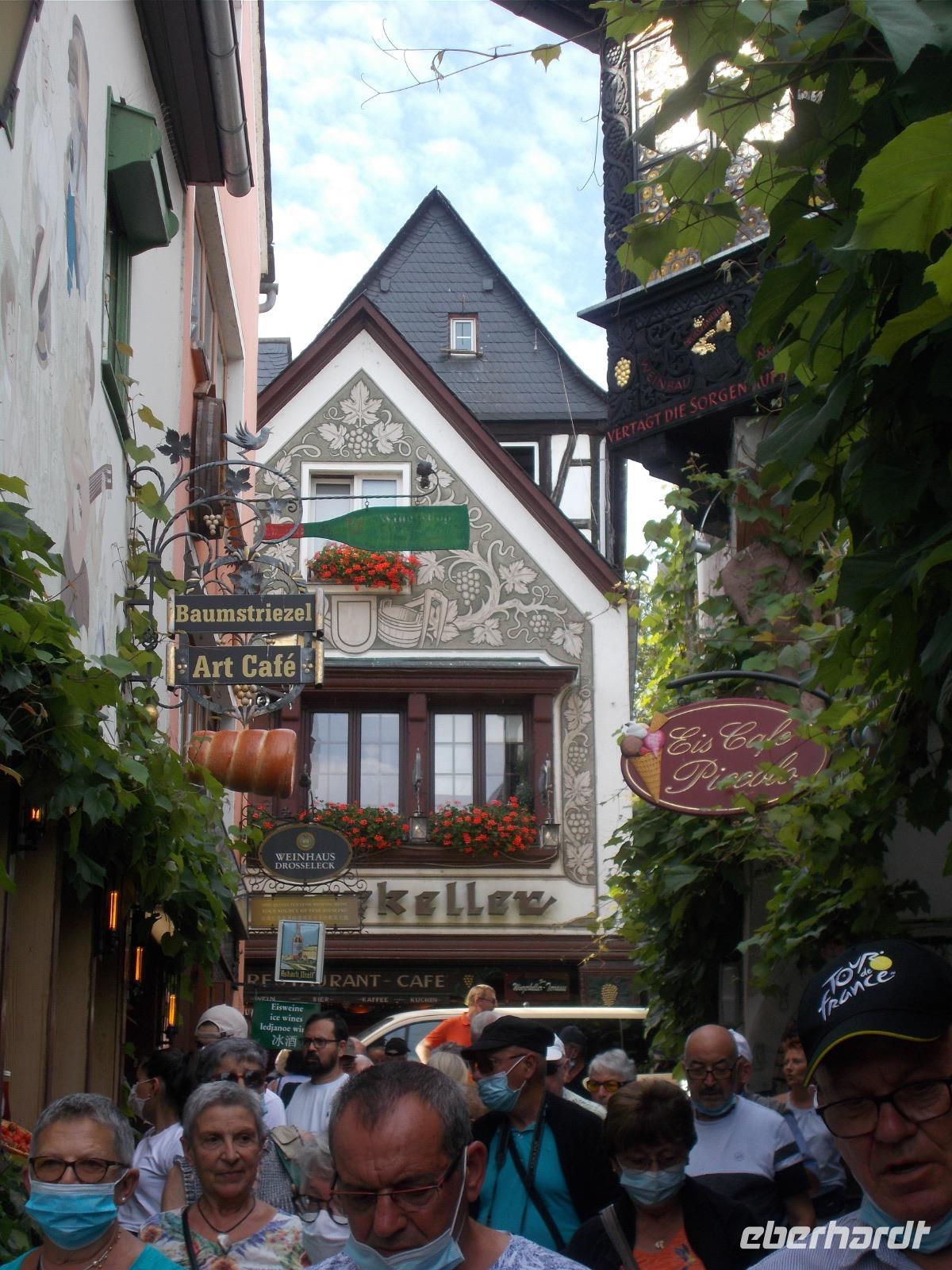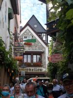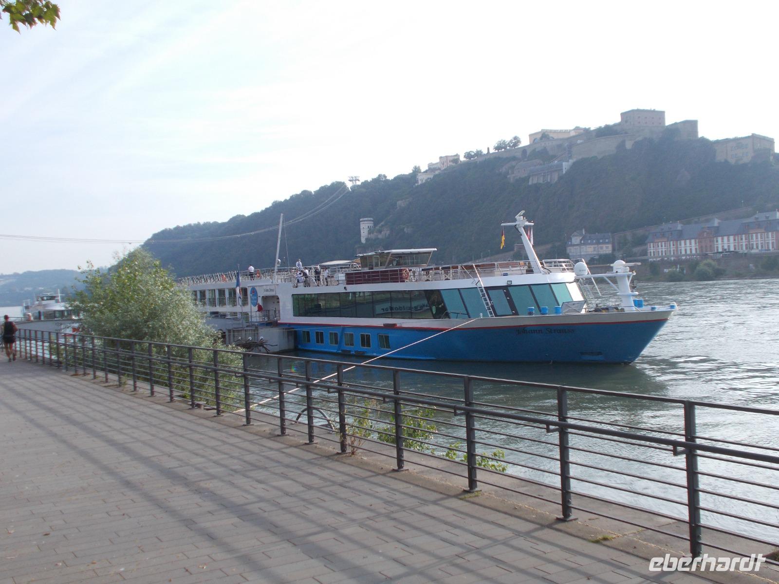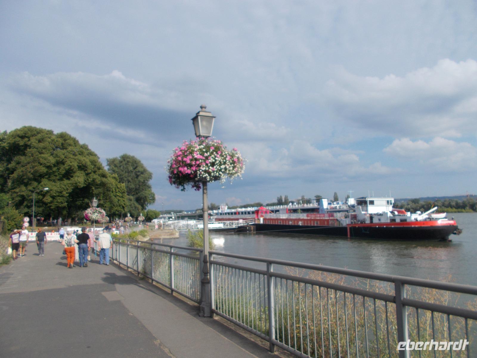 Heute früh erwachten wir am Rheinufer .Über uns schwebte die Seilbahn hinauf zur Festung Ehrenbreitstein.Uns zog es aber zum Zusammenflus von Mutter Mosel und Vater Rhein.Genau dort, begann unser Stadtrundgang, durch eines der schönsten Städte Deutschlands.Koblenz, eingerahmt von Taunus ,Eifel,Hundsrück und Westerwald ist aber eher bekannt durch das Reiterstandbild Kaiser Wilhelm I.am Deutschen Eck.Durch das Tor des Deutsch Orden Hauses gelangten wir zum Kastorhof mit Basilika.Am Florinsmarkt,am altenKaufhaus, rollte immer noch der enthauptete Rau- Ritter von Kobern, mit den Augen und streckt die Zunge herraus.So lang dies geschied,geht es der Stadt Koblenz gut (Legende).Wir schlenderten weiter durch die kleinen, schmucken Gässchen und Plätze,belächelten die Sulpturen von Pfefferminz -Liesel und Marktfrau ,bishin zum Rathaus (ehem.Jesuitenkloster).Als Wahrzeichen steht hier der Schängel Brunnen mit dem Wasser spuckenden Buben.Leider mussten wir zum Schiff zurück.Uns erwartete eine fünfstündige Passage des Weltkulturerbes „Oberes Mittelrheintal"welches zwischen Koblenz und Bingen erstreckt.Weltberühmt durch die Loreley Sage und natürlich das Lied.Die gefährlichen Stellen gibt es immer noch (unser Kapitän jedoch steuerte sein Schiff perfekt an den Strudeln und Stömungen vorbei)und Loreley sitz auch immer noch ,aber versteinert,auf einem Stein im Rhein.Das Wetter spielte absolut mit,deshalb konnten wir den Nachmittag auf dem Sonnendeck genießen.Die Kreuzfahrtleiterin unterhielt uns mit kleinen Geschichten und Sagen zu den Burgen und Ansiedlungen ,rechts und links des Schiffes. Am Nachmittag gab es ,zusätzlich zu Kaffee und Kuchen,die Ausschifffungs Information von Frau Tichy. Im, wohl bekanntesten ,Weinort am Rhein-Rühdesheim angekommen,stand das Bähnle schon bereit.Auf uns wartete eine gemühtliche Fahert durch die engen,verwinkelten Gassen der Stadt, mit Sicht auf das Hildegard Kloster.Danach wurde es musikalisch.In Siegfrieds mechanischen Musikkabinet konnten wir den verschiedensten Instrumenten lauschen.Zurück zum Schiff ,ging es durch die berühmte Drosselgasse.Vielleicht wurde von dem Rüdesheimer Kaffee genascht oder ein Gläschen des hiesigen Weines probiert.Etwas wehmütig bemerkten wir,daß diese schöne Reise fast zu Ende ist.Am Abend traf sich unsere Reisegruppe ,auf einen für uns kreirten Drink,im Salon zur Verabschiedung.Alle stellten fest,das es nach so langer „Reisewartezeit „wunderschön gewesen ist und alle diese Fahrt so richtig genossen haben.