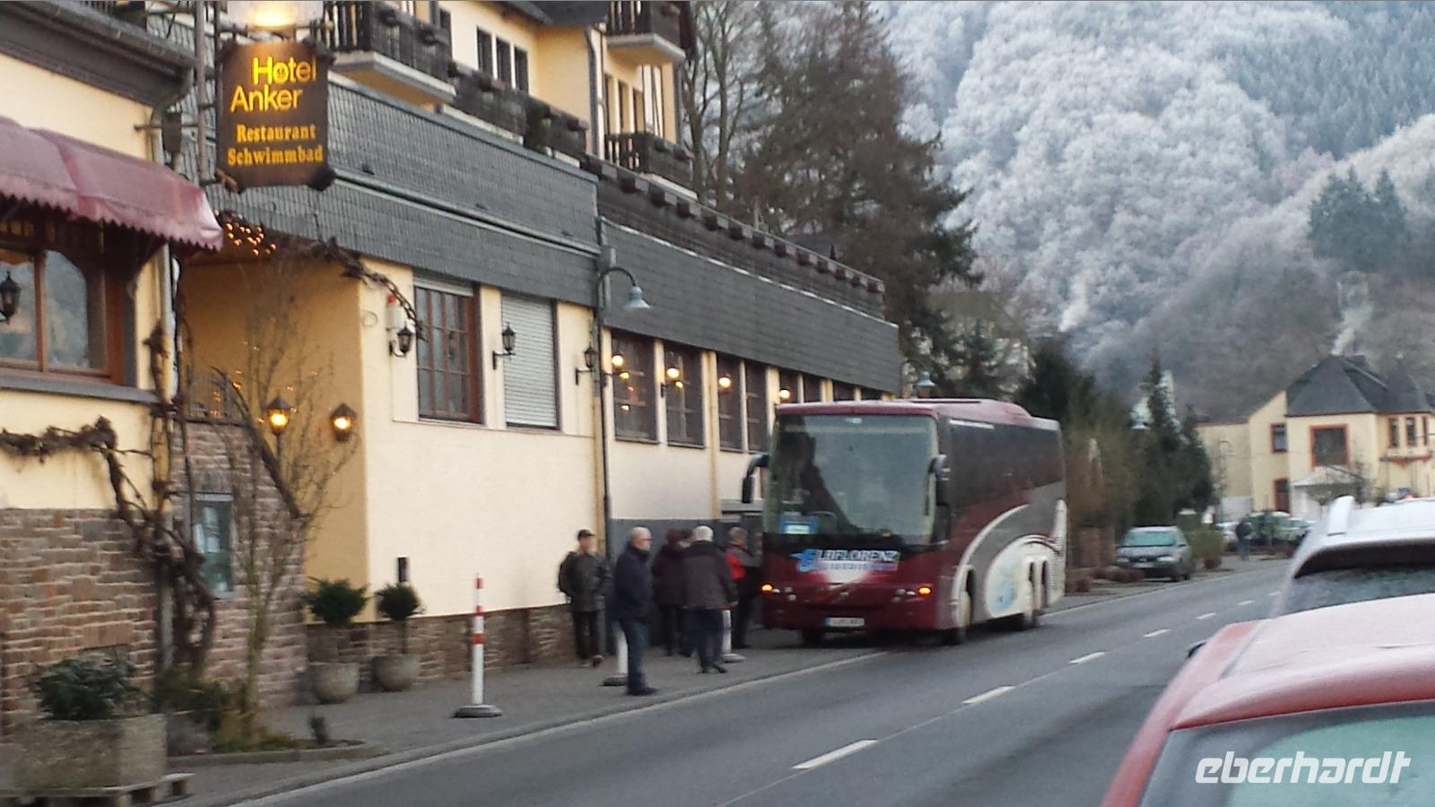 Wir hatten bei der Abreise nur sechs Fahrgäste, die alle pünktlich mit ihren Tranfers eingetroffen waren. Alle anderen Zustiege an der Autobahn erreichten wir pünktlich, es gab keine Verspätungen der übrigen Zubringer, somit verlief alles reibungslos. Unter Einhaltung der üblichen Pausenzeiten befuhren wir vier Bundesländer, Sachsen, Hessen und Rheinland Pfalz. Die Fahrgäste erhielten von mir diverse, interessante Streckeninformationen, u.a. Hohnstein Ernstthal, Geburtsstadt von Karl May, Bad Köstritz, die Stadt der drei großen B, Bad, Blumen, Bier, über die Kunststadt Weimar, über Erfurt, Infos über die 3 Gleichen ( Burgen), die man direkt an der Autobahn erkennen kann, über den Thüringer Wald, Infos zum Lutherjahr und Eisenach etc..etc.. Nachdem wir in Dresden bei Regen losgefahren waren und zwischendurch auch dichter Nebel auftauchte, kamen auf der Weiterfahrt auch immer öfter die Sonnenstrahlen durch die Wolken und ließen uns erwartungsvoll und freudig unserem Ziel entgegenfahren. Von Winter war keine Spur zu erkennen, ob der bevorstehenden Fahrt gingen wir damit auch relativ gelassen um. Die Gäste waren durchweg guter Laune und wir ließen uns ganz locker langsam aufeinander ein. Ich stimmte die Fahrgäste auf die Weinregion Mosel ein, älteste Weinregion Deutschlands,, mehr als 3600 Winzer , ca. 60 Millionen Rebstöcke,40 % an Steilhängen, was die Arbeit der Winzer sehr erschwert. An der Mosel befindet sich der steilste Weinberg der Welt, der Calmont, zwischen Bremm und Ediger-Eller mit bis zu 68 % Grad Hangneigung, diesen werden wir auf unserer Rundfahrt am 1.1.17 auch sehen.