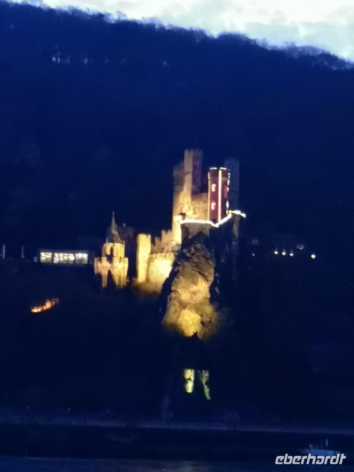 Nach dem Besuch des Klosters starteten wir unsere Lichterfahrt entlang des Rheins, wir bestaunten die bekanntesten Burgen, wie die Niederburg bei Rüdesheim, die Burg Rheinberg bei Lorch, die Burgruine Rheinfels bei St. Goar,Burg Liebenstein bei Boppard,die Marksburg bei Braubach u.v.a.m., die alle beleuchtet waren und dadurch wirkte der Anblick noch viel imposanter als bei Tag. Auch den Loreleyfelsen bei St. Goarshausen konnten wir noch erkennen , da es schon dämmerte, wir lauschten der Geschichte der Loreley und wie von selbst begannen wir alle das wunderschöne Lied " Ich weiß nicht, was soll es bedeuten " ( Text.v. Heinrich Heine ) zu singen und alle staunten, dass einige Gäste so richtig textsicher waren !!!!!!