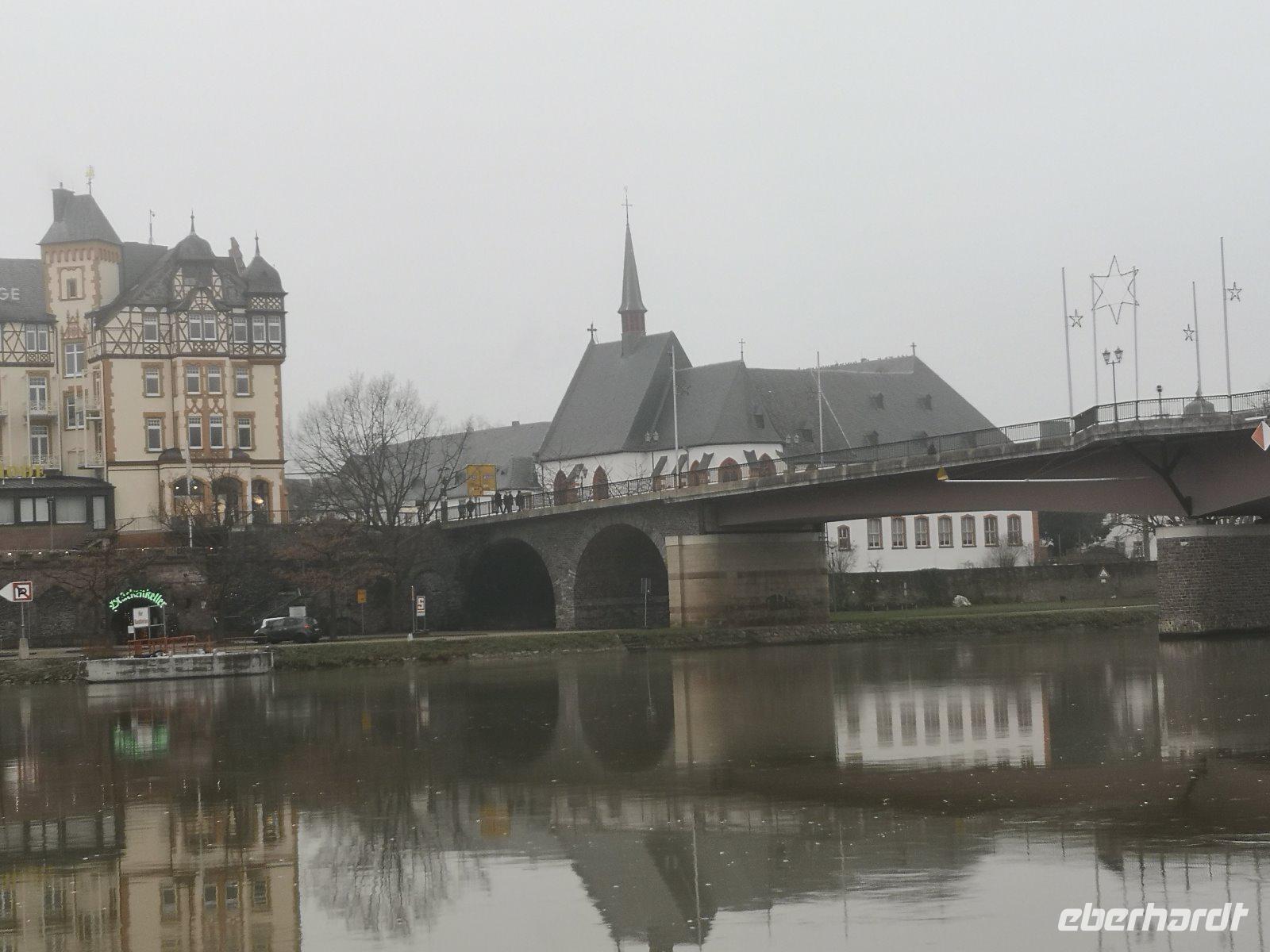 Vorbei an den Weinbergen Wehlener Sonnenuhr, Kröver Nacktarsch ,dessen lustige Geschichte ich den Gästen erklärte, u.a., vorbei an der erst im November 2019 eröffneten Hochmoselbrücke, die mit 160 Metern 3 m höher ist als der Kölner Dom, kamen wir gegen 14.30 Uhr in Bernkastel Kues an, mittlerweile war es auch sehr neblig geworden und der Blick auf die Burg Landshut, erbaut 1291, blieb uns verwehrt.
