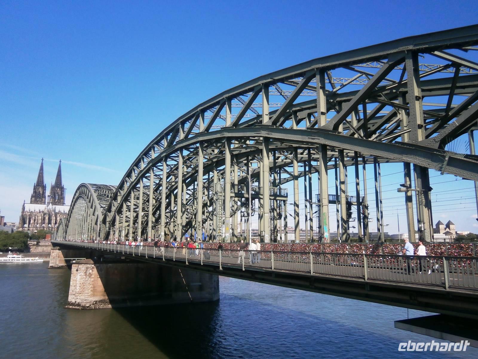 Wir stoppten an der Deutzbrücke und genossen das Altstadtpanorama mit Blick auf Groß St. Martin, Rathaus, Hohenzollernbrücke, die mit unzähligen Schlössern geschmückt ist, sowie das Wahrzeichen der Stadt, den Dom.