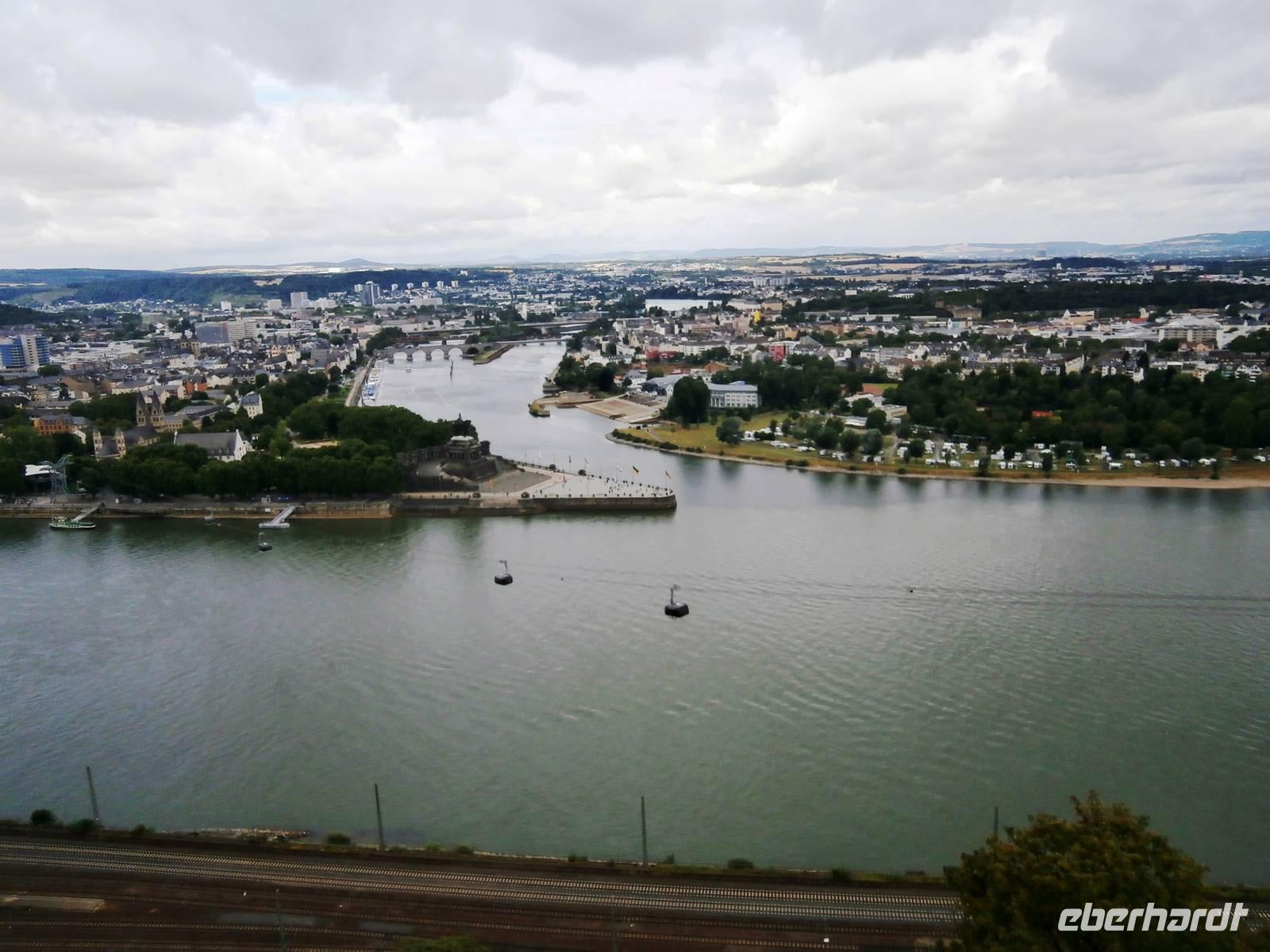Koblenz ist auch bekannt für das Deutsche Eck, hier mündet die Mosel in den Rhein. Von der Festung aus kann man an den unterschiedlichen Farben der Flüsse genau erkennen, welcher der Rhein und welcher die Mosel ist.