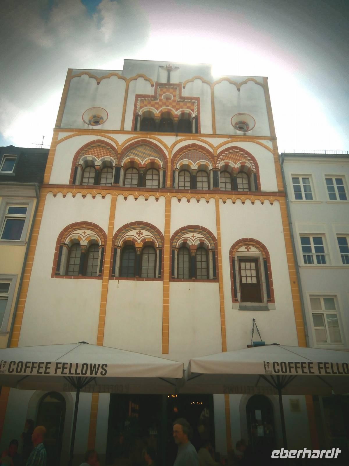 Anschließend zeigte uns die Stadtführerin noch das Dreikönigenhaus, dessen Farbenfreude an das Mittelalter, genau an das 13. Jahrhundert erinnert. Vorbei am Wohnhaus von Karl Marx, der hier 18 Jahre lebte, kamen wir schon zur Porta Nigra, dem wohl bekanntesten Wahrzeichen von Trier. Die Porta Nigra, übersetzt schwarzes Tor, wurde um 180 nach Christus erbaut, die Bauzeit lag zwischen 122 Tagen und 2,5 Jahren. Der höchste Turm ist 30 Meter, die Fenster haben wieder eine Höhe von 7 Metern. Die schwarze Farbe entstand durch die Verwitterung und schützt natürlich den Sandstein. Die Porta Nigra war nicht nur Stadttor, sondern auch Verteidigungsanlage.