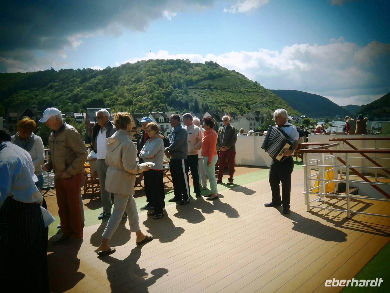 Vorbeigleitend an der lieblichen Mosellandschaft konnten wir ab 11.30 Uhr bei herrlichem Sonnenschein auf dem Deck ein Glas Moselwein mit frisch gebackenem Zwiebelkuchen genießen.