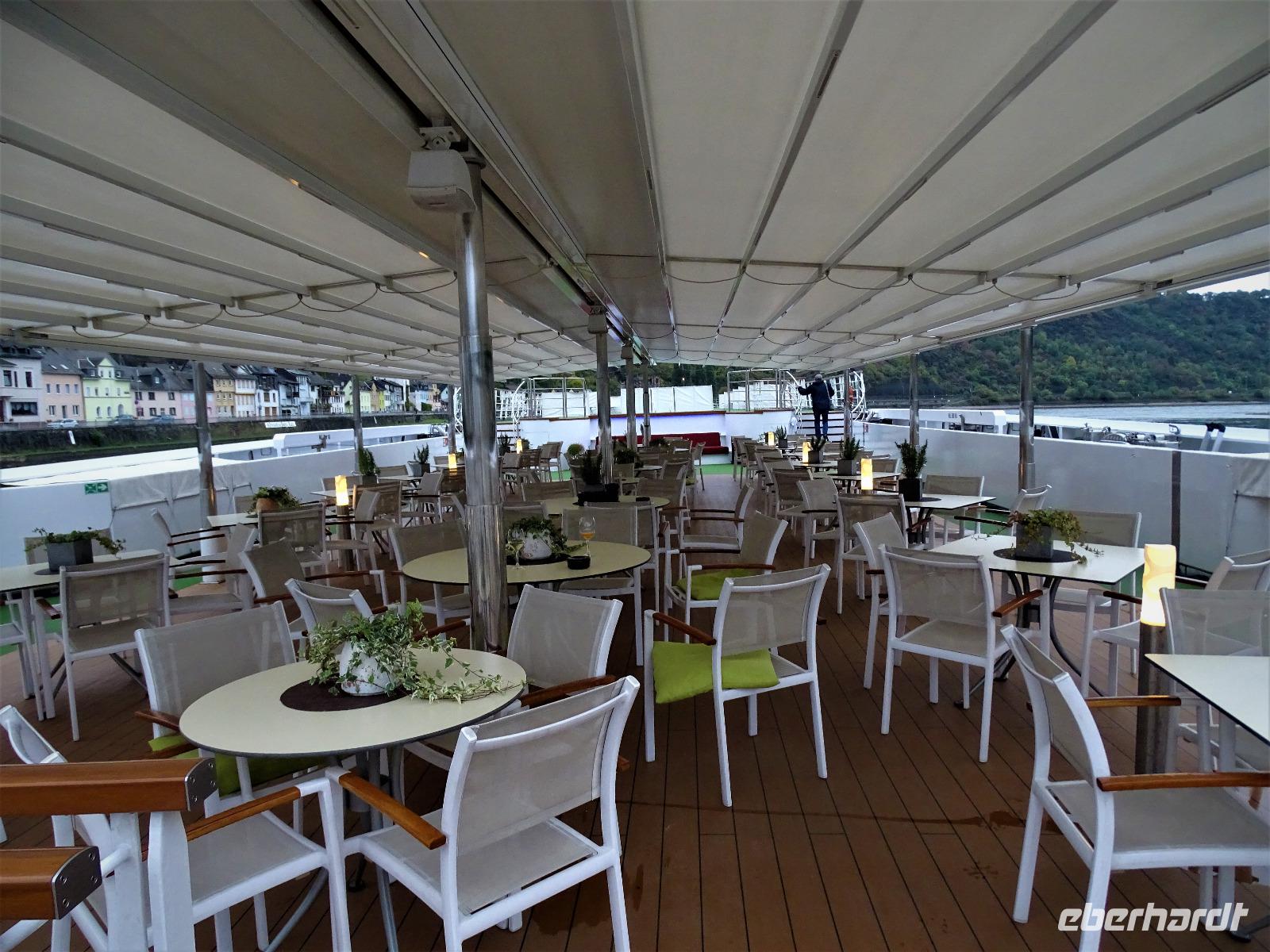 Der Vormittag verführte die Passagiere zum Brunchen, zum Relaxen im Spa-Bereich oder einfach nur so zu netten Gesprächen. Viele genießen die historischen Bauten rechts und links an den Ufern, teilweise auch an Deck.